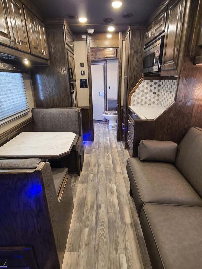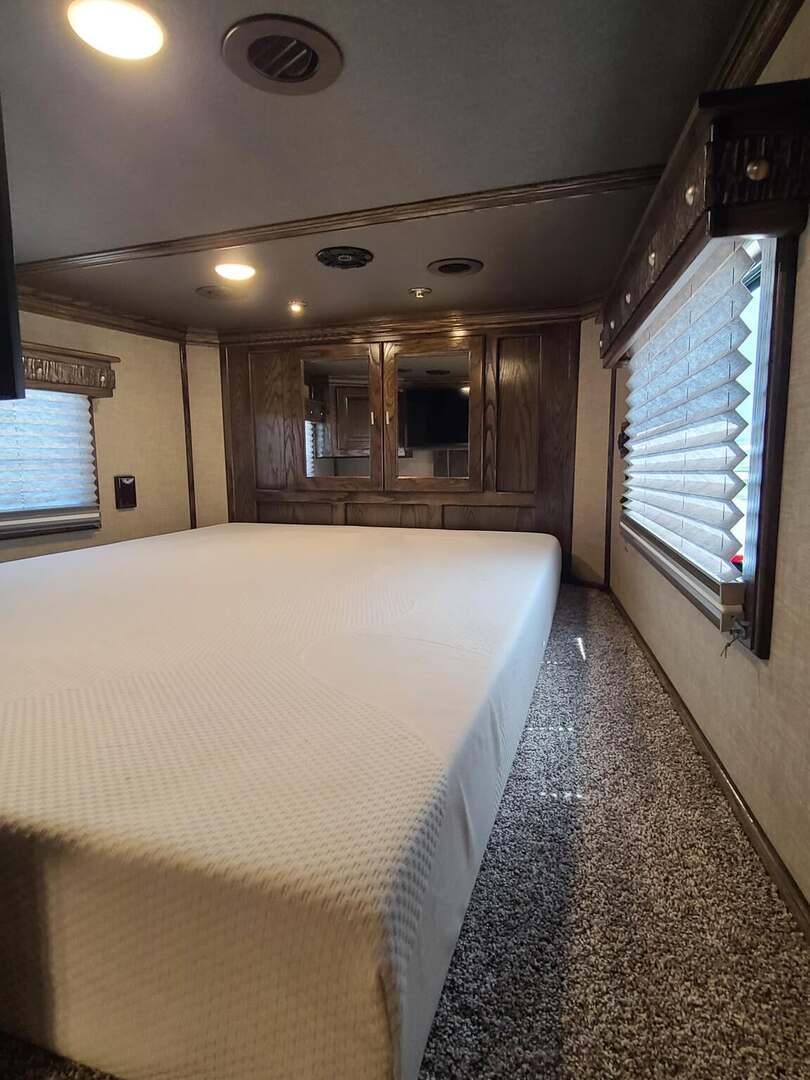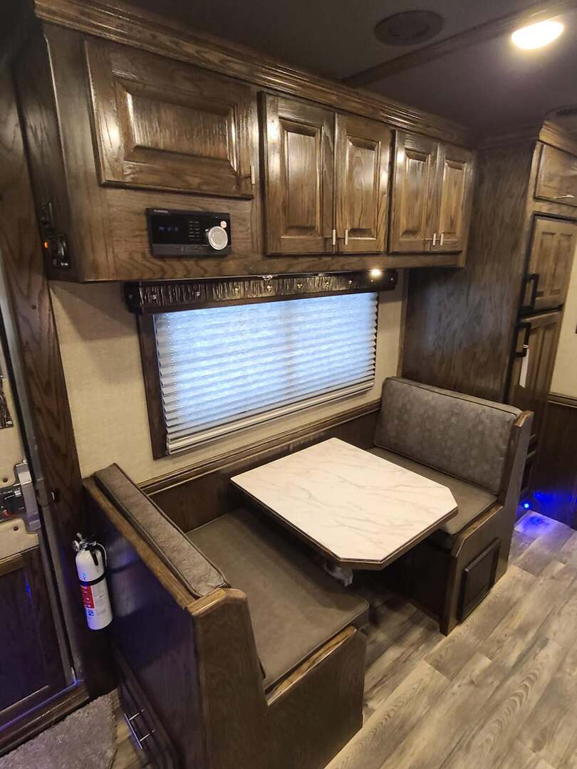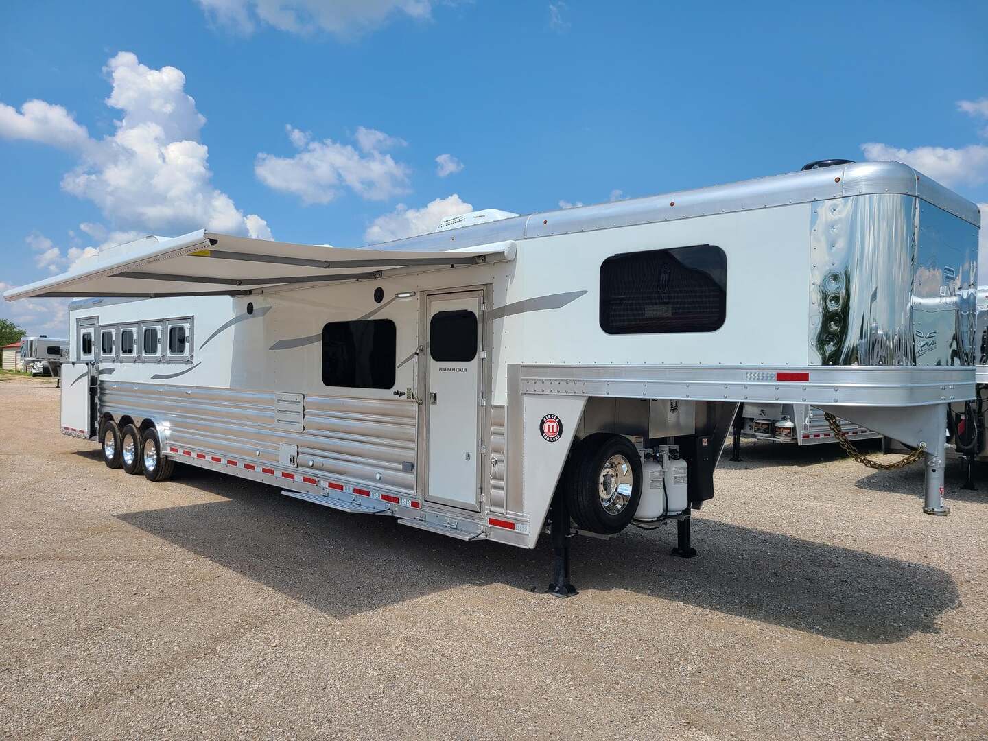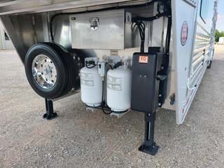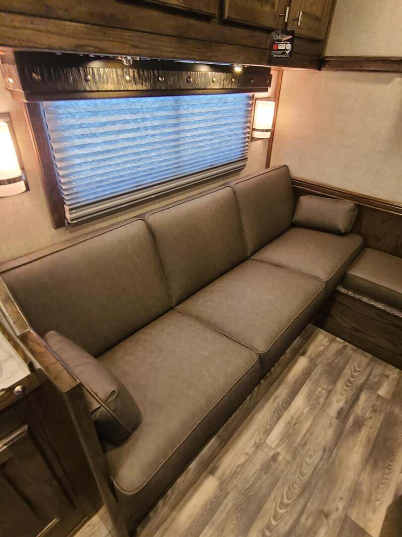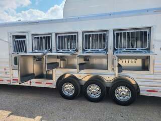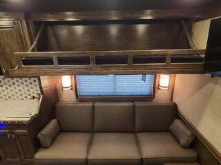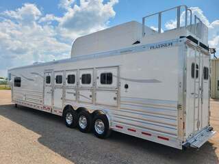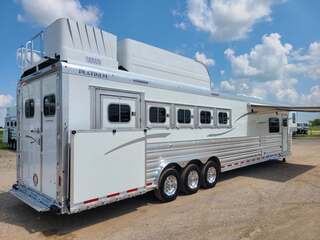 Platinum Coach 5 Horse 16’ short wall Outlaw Conversion features: 8 x 39 x 8’ tall 78” Couch & 74” Dinette floor plan Flip down bunk bed over sofa Onan 4.0 Generator with 19 gallon fuel tank 15,000 BTU A/C with heat pump 32” Smart TV’s in living and 32” in bed area Winegard Connect 2.0 antenna for WiFi AM/FM/CD/DVD player with exterior speakers 6.0 Propane / Electric refrigerator 60 gallon water tank 20,000 BTU furnace 6 gallon propane water heater Two burner recessed cooktop Convection oven over cooktop Deep Almond Porcelain kitchen and vanity sink Slide out trash can under pantry storage Front bench area with storage underneath 34” radius shower in bathroom Porcelain toilet in front of double rod closet with leather on lid Vanity and sink under medicine cabinet next to shower Pocket door to bathroom with mirror on bathroom side 24” walk through door to horses 16’ armless power awning Platinum Coach features: Tri-8k axles with 17.5” aluminum wheels and 18 ply tires Side load configuration, LOADED REAR TACK WERM flooring in horse compartment 4 mangers, escape door on first stall, head side 52” tall spring loaded side ramp, 46” last stall 8’ hay pod with generator landing Flow through dividers, telescoping last divider Stud divider with rubber on first stall Drop down windows on head and hip side Drop down window bars on head side Carpeted rear tack, loaded with bars, hooks, trays, and shelves 2-30# propane bottles Double aluminum battery box with ON/OFF switch Dual 15,000# Equalizer Hydraulic jack
