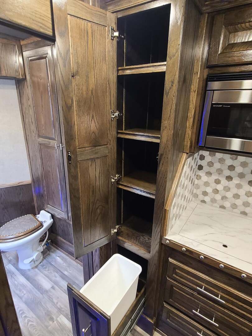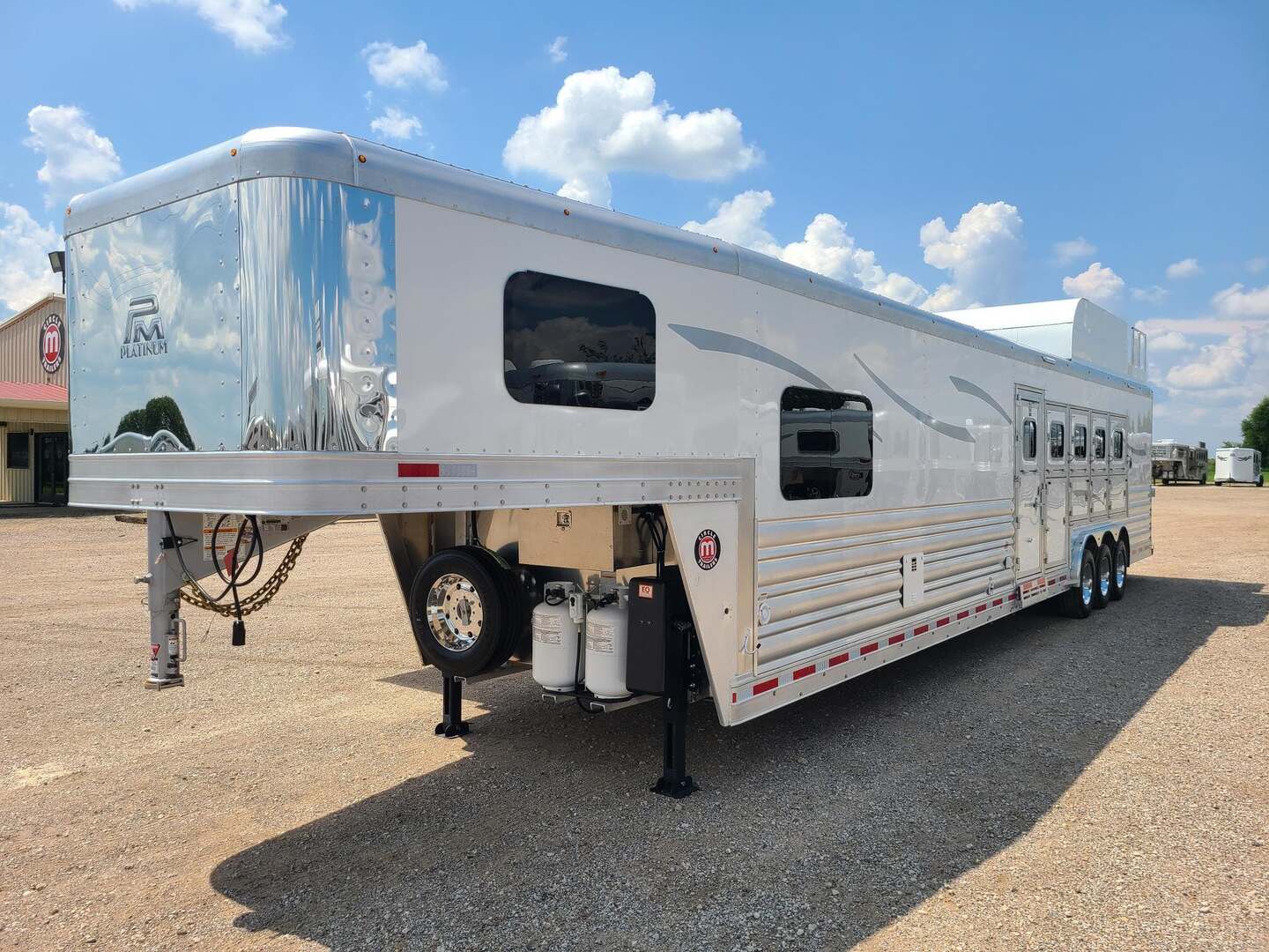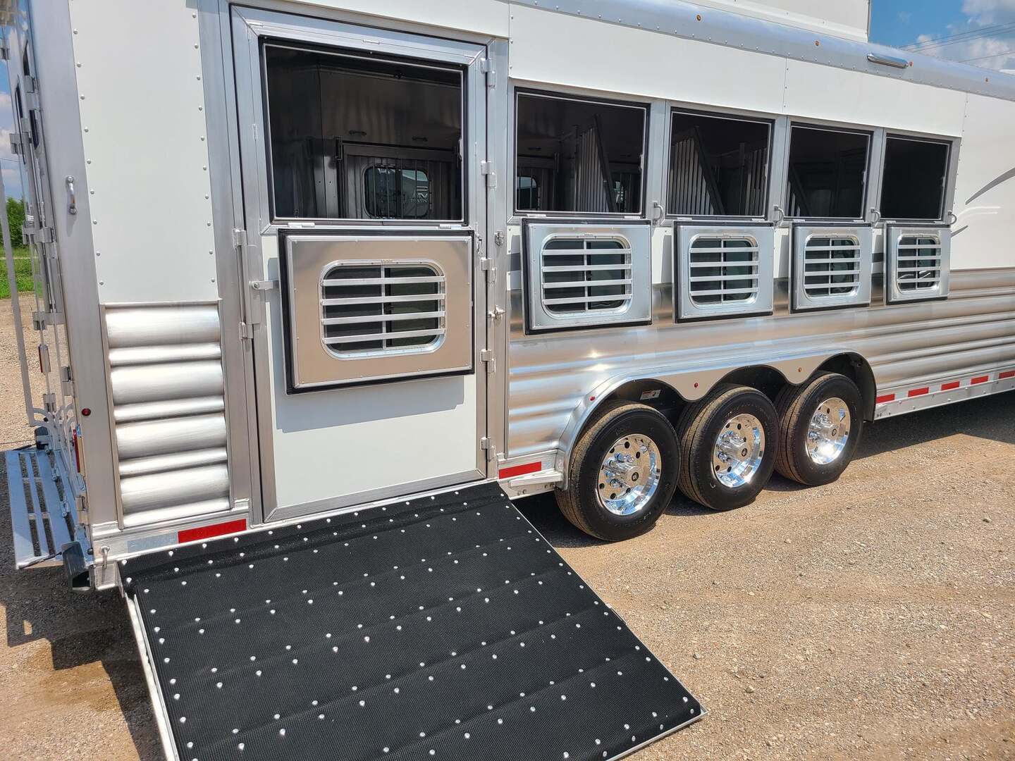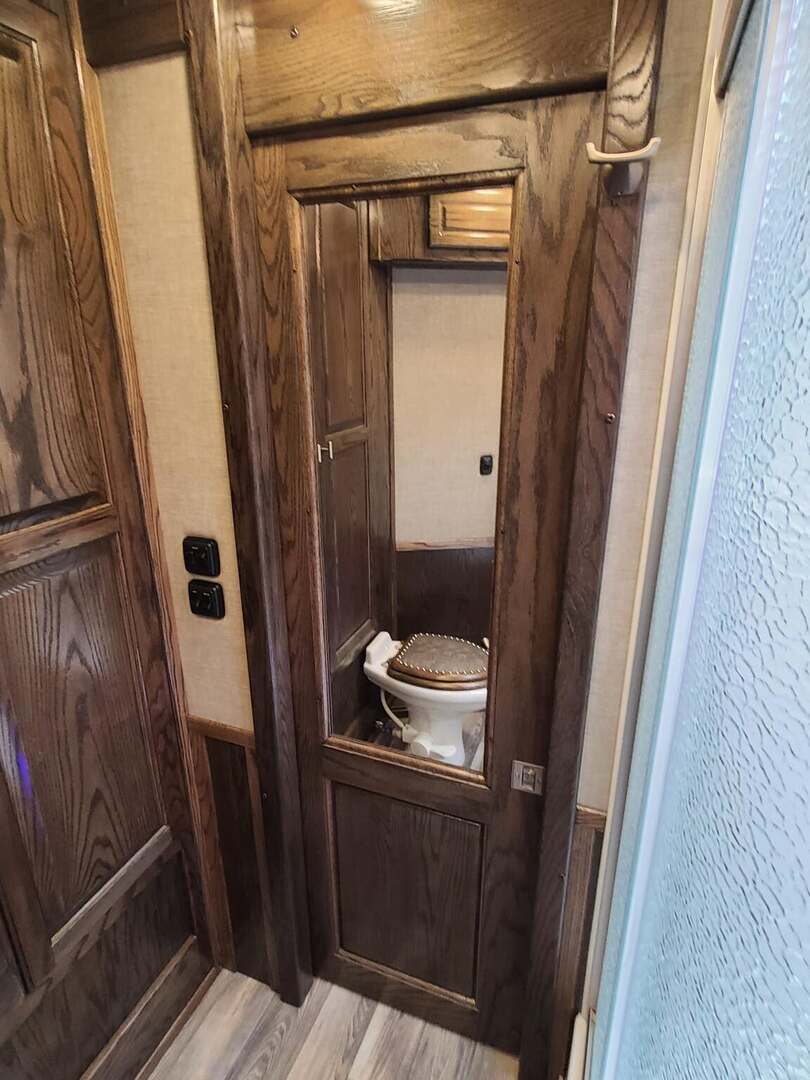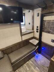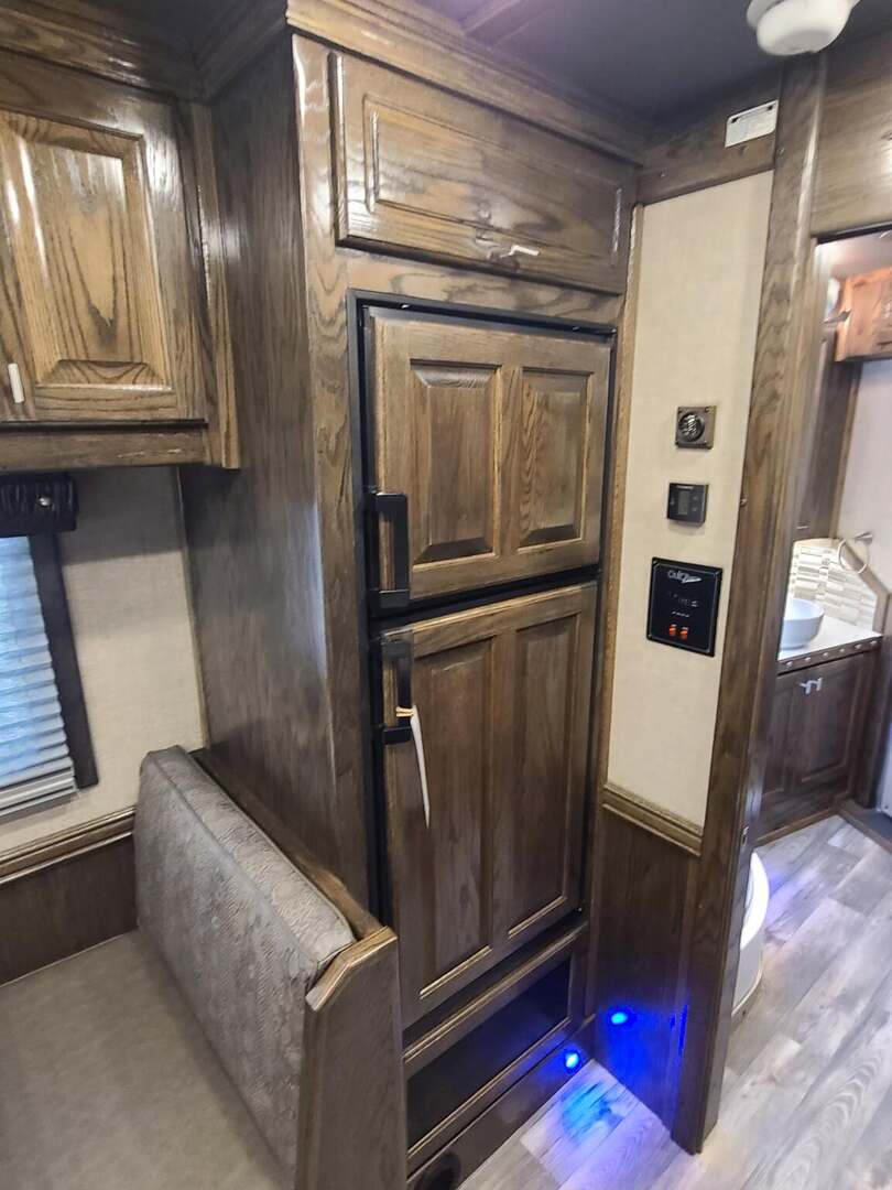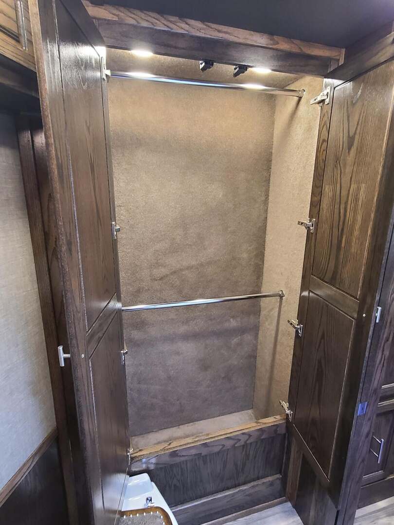 Platinum Coach 5 Horse 16’ short wall Outlaw Conversion features: 8 x 39 x 8’ tall 78” Couch & 74” Dinette floor plan Flip down bunk bed over sofa Onan 4.0 Generator with 19 gallon fuel tank 15,000 BTU A/C with heat pump 32” Smart TV’s in living and 32” in bed area Winegard Connect 2.0 antenna for WiFi AM/FM/CD/DVD player with exterior speakers 6.0 Propane / Electric refrigerator 60 gallon water tank 20,000 BTU furnace 6 gallon propane water heater Two burner recessed cooktop Convection oven over cooktop Deep Almond Porcelain kitchen and vanity sink Slide out trash can under pantry storage Front bench area with storage underneath 34” radius shower in bathroom Porcelain toilet in front of double rod closet with leather on lid Vanity and sink under medicine cabinet next to shower Pocket door to bathroom with mirror on bathroom side 24” walk through door to horses 16’ armless power awning Platinum Coach features: Tri-8k axles with 17.5” aluminum wheels and 18 ply tires Side load configuration, LOADED REAR TACK WERM flooring in horse compartment 4 mangers, escape door on first stall, head side 52” tall spring loaded side ramp, 46” last stall 8’ hay pod with generator landing Flow through dividers, telescoping last divider Stud divider with rubber on first stall Drop down windows on head and hip side Drop down window bars on head side Carpeted rear tack, loaded with bars, hooks, trays, and shelves 2-30# propane bottles Double aluminum battery box with ON/OFF switch Dual 15,000# Equalizer Hydraulic jack