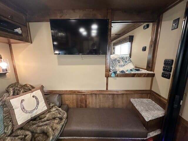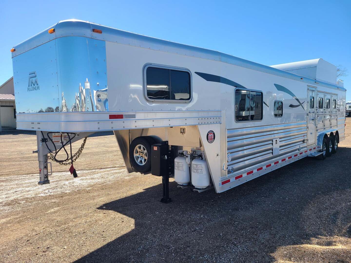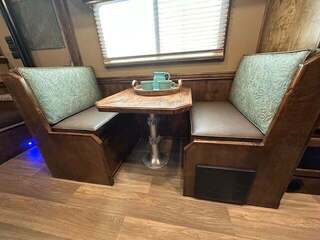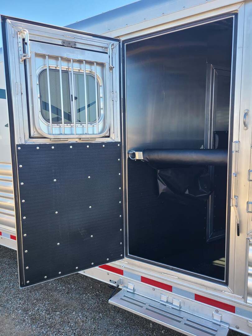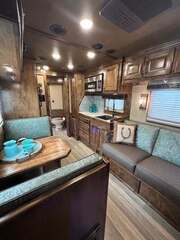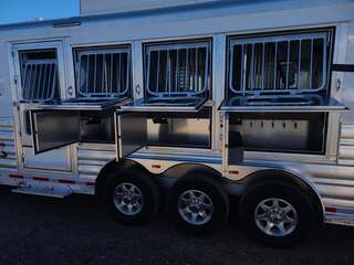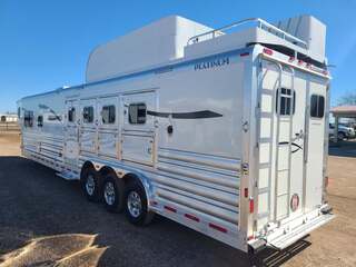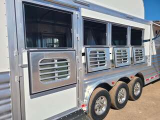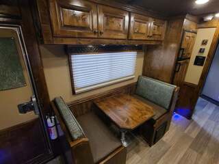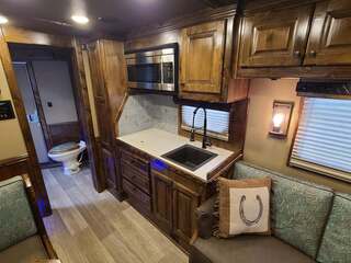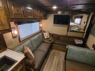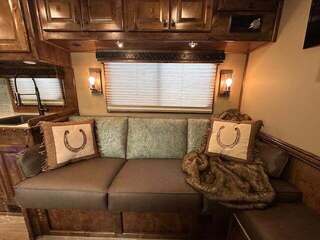THIS TRAILER IS ON ORDER AND WILL ARRIVE IN OCTOBER Platinum Coach 4 Horse 15’ 8” short wall Outlaw Conversion features: 8 x 35 x 8 tall 78” Couch & 72” Dinette floor plan Onan 4.0 Generator with 16 gallon fuel tank 15,000 BTU A/C with heat pump 32” Smart TV’s in living and bed area Winegard Connect 2.0 antenna for WiFi AM/FM/CD/DVD player with exterior speakers 6.0 Propane / Electric refrigerator 60 gallon water tank 20,000 BTU furnace 6 gallon propane water heater Two burner recessed cooktop Convection oven over cooktop Mocha Quartz kitchen sink with pull-out fauctet Slide out trash can under pantry storage Front bench area with storage underneath 34” radius shower in bathroom Porcelain toilet in front of double rod closet with leather on lid Vanity and sink under medicine cabinet next to shower Beautiful vessel sink, custom ordered for this design Pocket door to bathroom with mirror on bathroom side 24” walk through door to horses 18’ Two-Step awning Platinum Coach features: Tri-8k axles with 16” aluminum wheels and 14 ply Goodyear tires Side load configuration, LOADED REAR TACK 3 mangers, escape door on first stall, head side 52” tall spring loaded side ramp, 46” last stall 8’ hay pod with generator landing Flow through dividers, telescoping last divider Stud divider with rubber on first stall Drop down windows on head and hip side Drop down window bars on head side Carpeted rear tack, loaded with bars, hooks, trays, and shelves 2-30# propane bottles Double aluminum battery box with ON/OFF switch 15,000# Equalizer Hydraulic jack