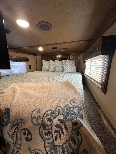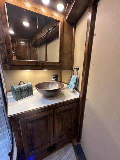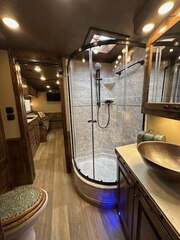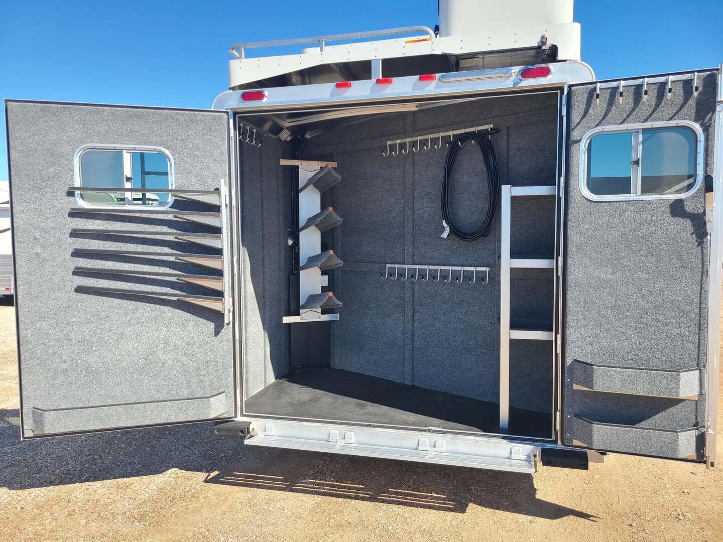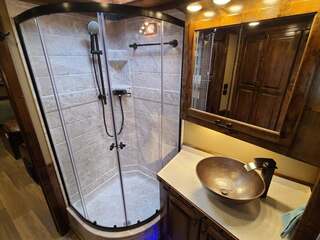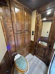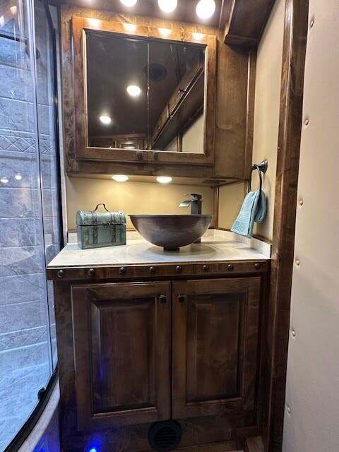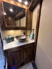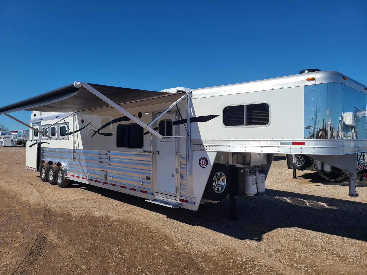 THIS TRAILER IS ON ORDER AND WILL ARRIVE IN OCTOBER Platinum Coach 4 Horse 15’ 8” short wall Outlaw Conversion features: 8 x 35 x 8 tall 78” Couch & 72” Dinette floor plan Onan 4.0 Generator with 16 gallon fuel tank 15,000 BTU A/C with heat pump 32” Smart TV’s in living and bed area Winegard Connect 2.0 antenna for WiFi AM/FM/CD/DVD player with exterior speakers 6.0 Propane / Electric refrigerator 60 gallon water tank 20,000 BTU furnace 6 gallon propane water heater Two burner recessed cooktop Convection oven over cooktop Mocha Quartz kitchen sink with pull-out fauctet Slide out trash can under pantry storage Front bench area with storage underneath 34” radius shower in bathroom Porcelain toilet in front of double rod closet with leather on lid Vanity and sink under medicine cabinet next to shower Beautiful vessel sink, custom ordered for this design Pocket door to bathroom with mirror on bathroom side 24” walk through door to horses 18’ Two-Step awning Platinum Coach features: Tri-8k axles with 16” aluminum wheels and 14 ply Goodyear tires Side load configuration, LOADED REAR TACK 3 mangers, escape door on first stall, head side 52” tall spring loaded side ramp, 46” last stall 8’ hay pod with generator landing Flow through dividers, telescoping last divider Stud divider with rubber on first stall Drop down windows on head and hip side Drop down window bars on head side Carpeted rear tack, loaded with bars, hooks, trays, and shelves 2-30# propane bottles Double aluminum battery box with ON/OFF switch 15,000# Equalizer Hydraulic jack