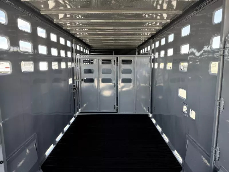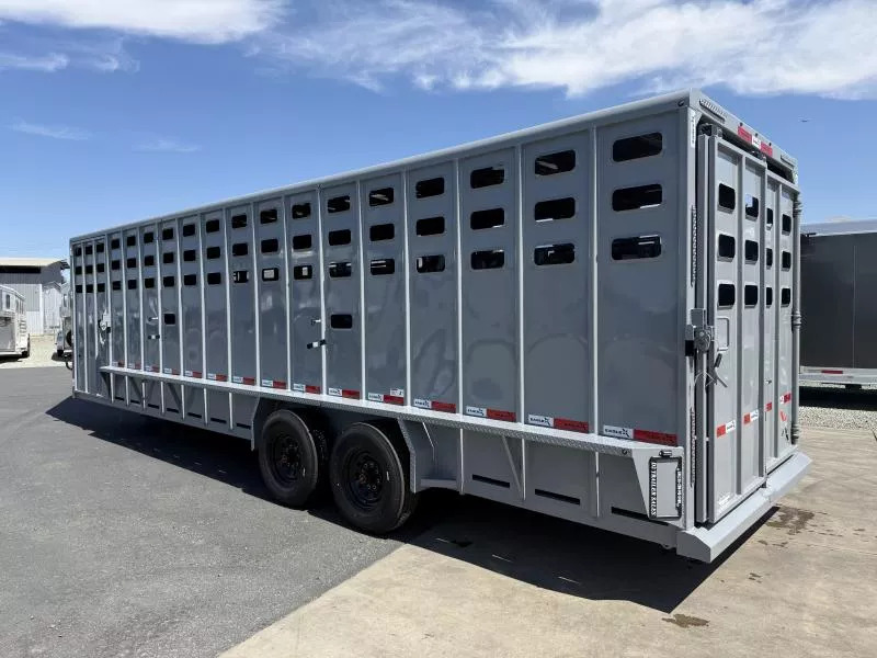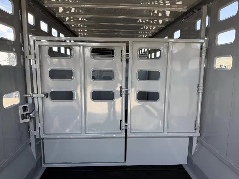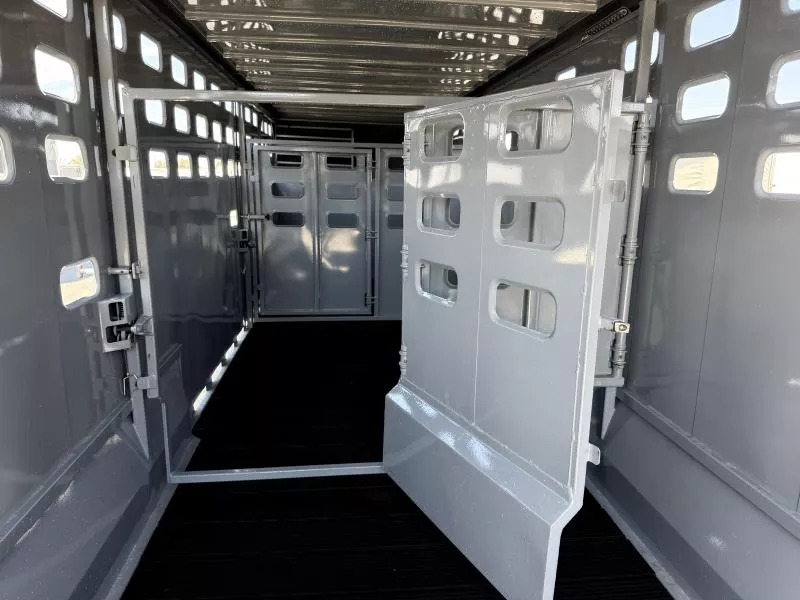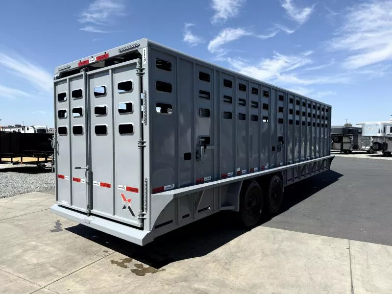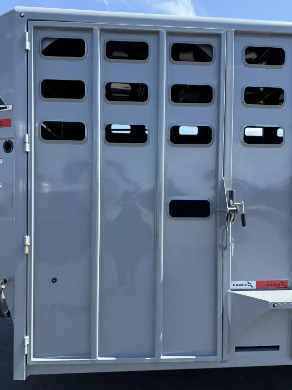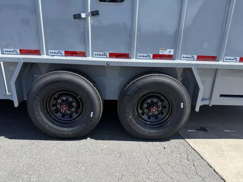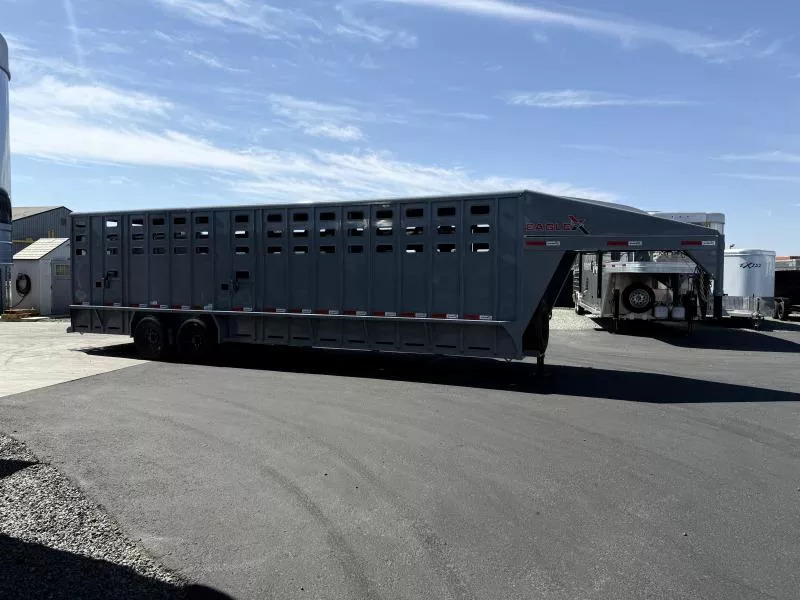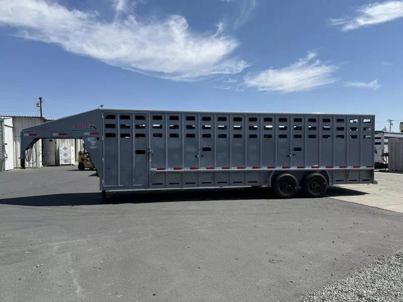 2026 EagleX 28’ GN Stock Trailer. * 7’ Wide, 28’ Long, 7’ Tall * Powder Coated Steel 14 ga Walls * Punched Walls with 3 Vent Rows * 2” Smooth Rubber Floor with Last 4’ Cleated Rubber Floor * Brush Fenders * Tandem 8000# Torsion Axles * 14 Ply Radial Tires * 4 Wheel Electric Brakes * Spare Tire * 48” Side Escape Door * (2) Center Gates with External Releases and Hold Back Catches * Sorting Gates in Center Gates * Swing Calf Gates in Nose of Trailer * Interior Light on Exterior Switch * Clean Out Gaps at Bottom of Side Sheets * Rear Swing Gate with Slider * Work Light on Rear * LED Lights * 2 5/16” Coupler Call D2 Trailer Sales 209-745-5480 or for more info www.d2trailersales.com