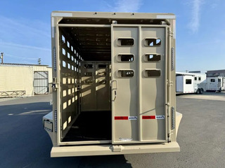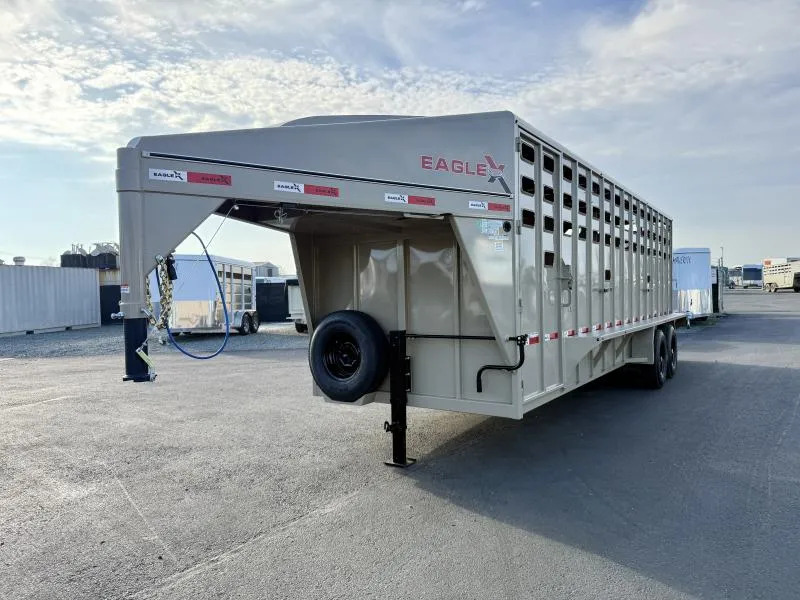 2026 EagleX 24’ GN Stock Trailer. * 6’8” Wide, 24’ Long, 7’ Tall * Powder Coated Steel 14 ga Walls * Punched Walls with 3 Vent Rows * 2” Smooth Rubber Floor with Last 4’ Cleated Rubber Floor * Brush Fenders * Tandem 7000# Torsion Axles * 14 Ply Radial Tires * 4 Wheel Electric Brakes * Spare Tire * 39” Side Escape Door * (2) Center Gates with External Releases and Hold Back Catches * Swing Calf Gates in Nose of Trailer * Interior Light on Exterior Switch * Rear Swing Gate with Slider * Interior Tie Loops * LED Lights * 2 5/16” Coupler Call D2 Trailer Sales 209-745-5480 or for more info www.d2trailersales.com