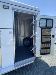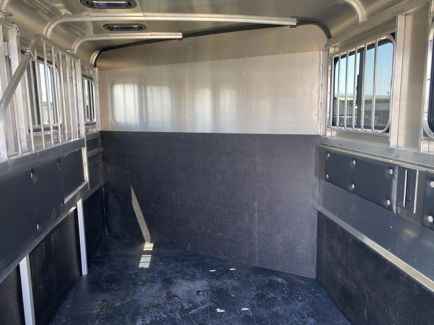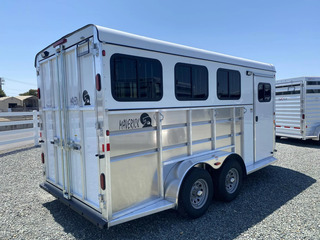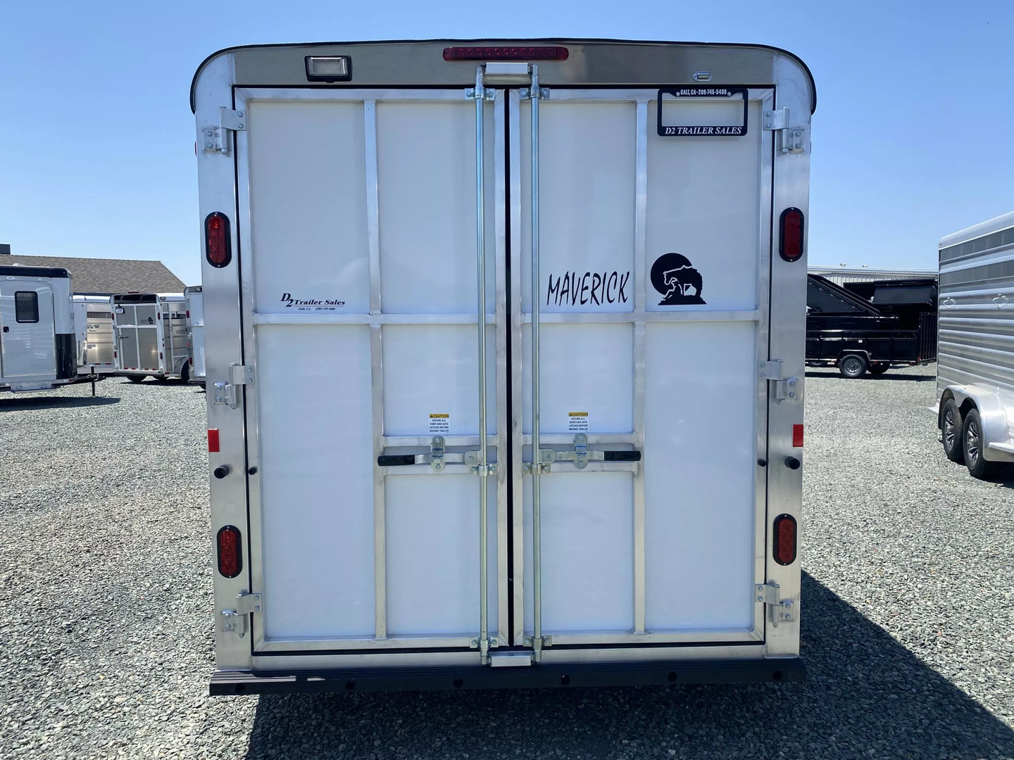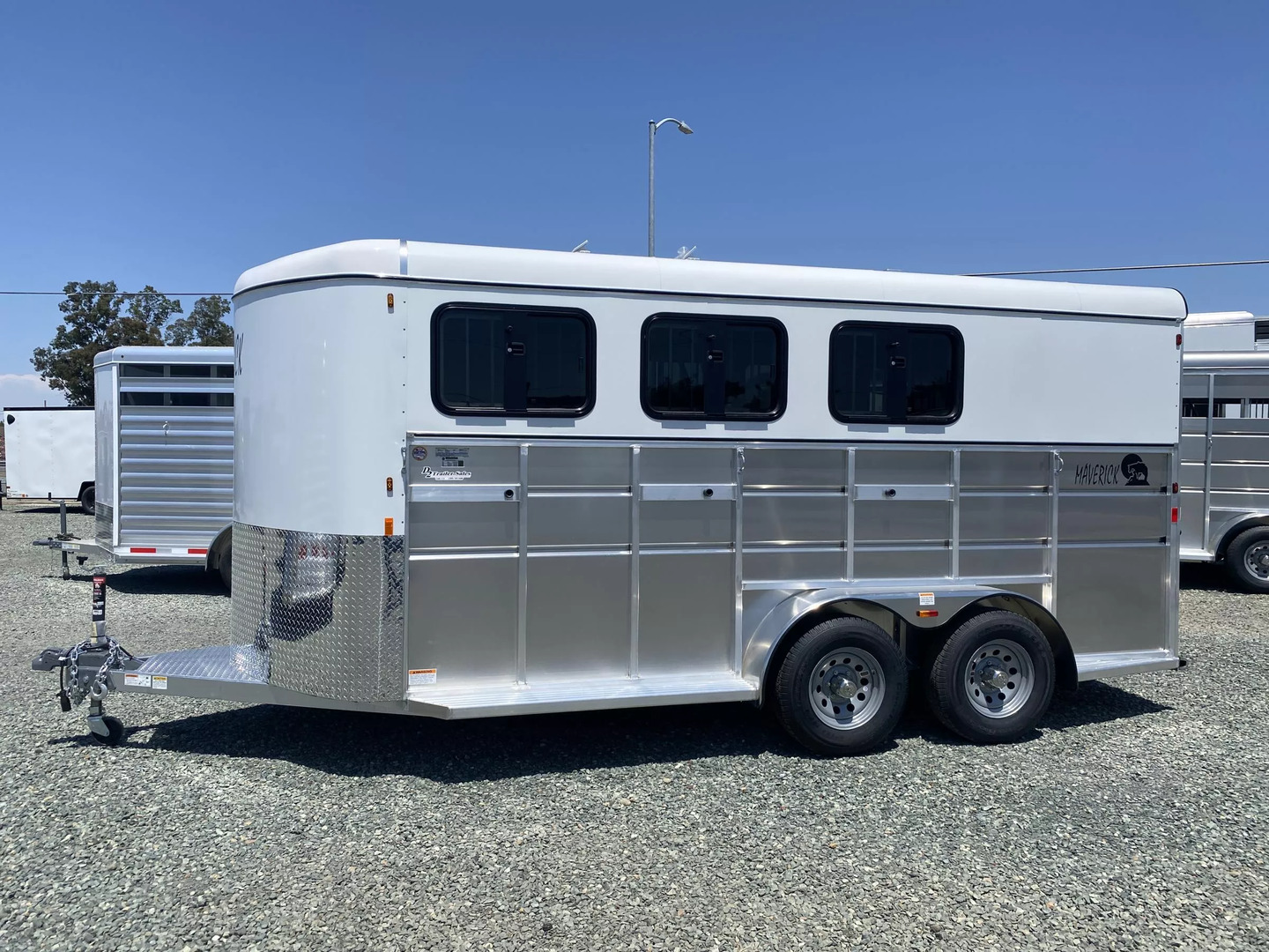 2026 Maverick Lite DX Enclosed 3 Horse Slant BP Trailer with Corner Water Tank. * 7’ Tall with 40” Wide Stalls * 7’ Wide * All Aluminum Construction * 3500# Torsion Axles * 15” Radial Tires 225’s * 4 Wheel Electric Brakes * White Aluminum Smooth Skin * Sealed Front Tack Area Includes: * Swing Out Saddle Rack * Spare Tire * Bridle Hooks * Blanket Rod * Carpeted Tack Floor * 36” wide Camper Door with Sliding Window * Porch Light * Brush Bag on Door * Interior Dome Light * Corner Water Tank * Horse Area Includes: * Drop Down Feed Windows with Drop Bars Headside * Sliding Windows Buttside * Double Rear Doors * Rubber Bumper * Rubber Floor Mats * Mats on Walls and Rear Door * Padded Jailbar EZ Latch Divider * Inside Tie Rings * Dome Light * Aluminum Diamond Plate Gravel Guard * Aluminum Fenders and Steps * Outside Tie Rings * LED Clearance and Tail Lights * Dual Tail Lights * 2 5/16” Bulldog Coupler Call D2 Trailer Sales 209-745-5480 or for more info www.d2trailersales.com