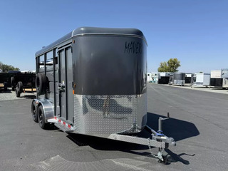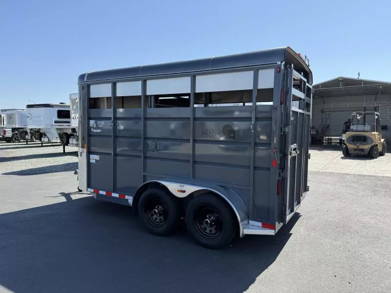 2026 Maverick 14’ Bumper Pull Livestock Trailer. * 7’ Tall * 6’6” Wide * Automotive Primer and Paint * 3500# Axles with 15” D Rated Radial Tires * Includes Spare Tire * 4 Wheel Electric Brakes * 34” Wide Side Escape Door * Exterior Non-Skid Step * Center Gate with Slam Latch * Rear Gate with Slider * Rubber Floor Mats * Double Air Slat Head and Butt * Interior Lights * Aluminum Teardrop Fenders * Outside Tie Rings * Aluminum Nose * Aluminum Roof with Cap * LED Clearance and Tail Lights * Dual Tail Lights * 2 5/16” Bulldog Coupler * Grey Call D2 Trailer Sales 209-745-5480 or for more info www.d2trailersales.com