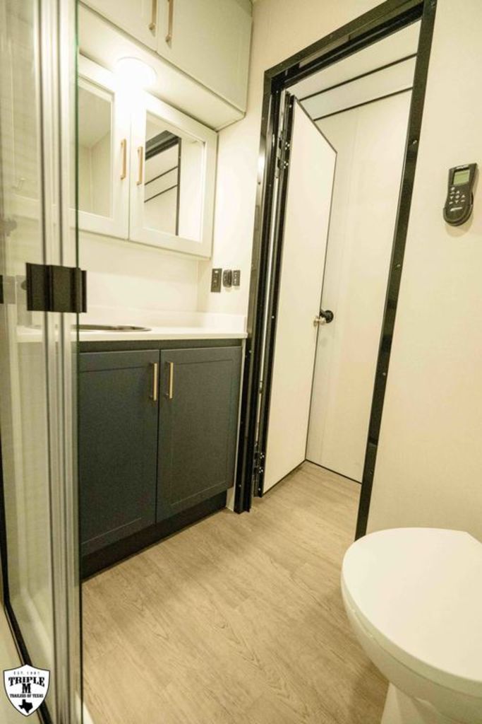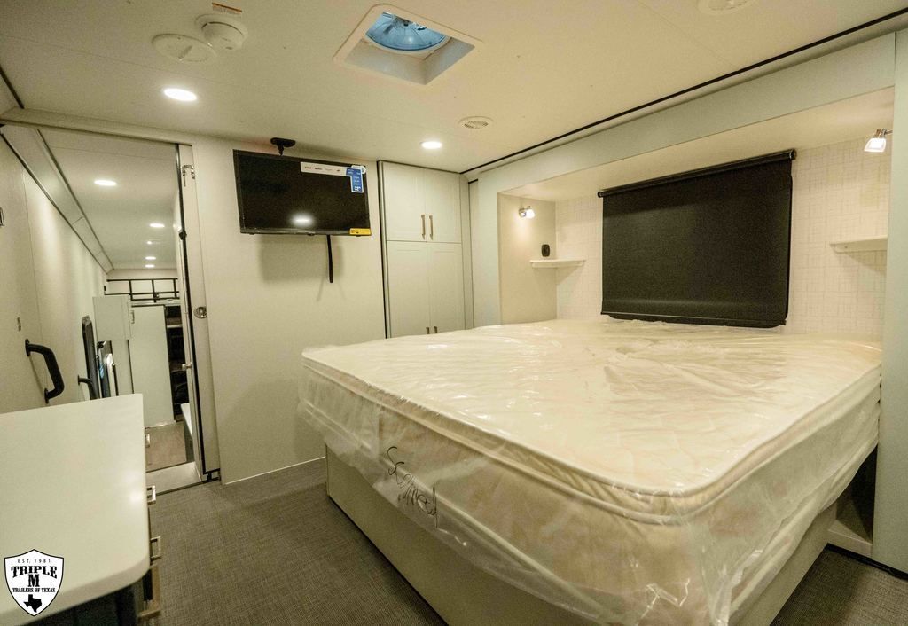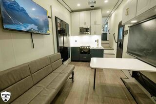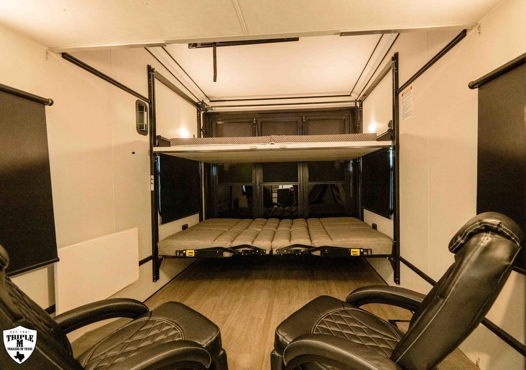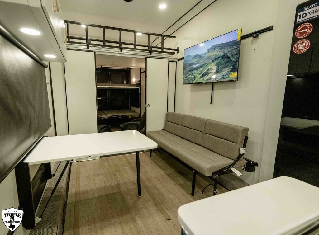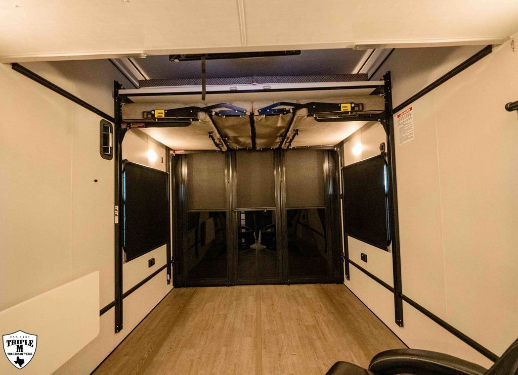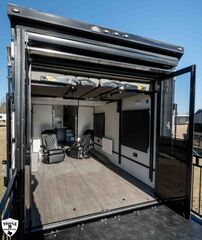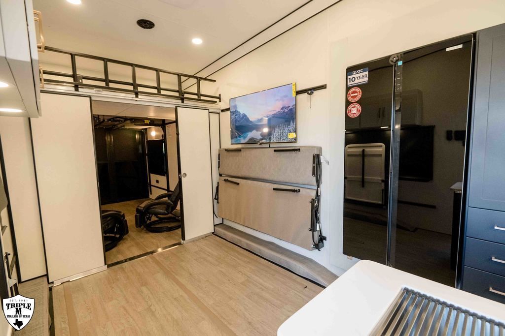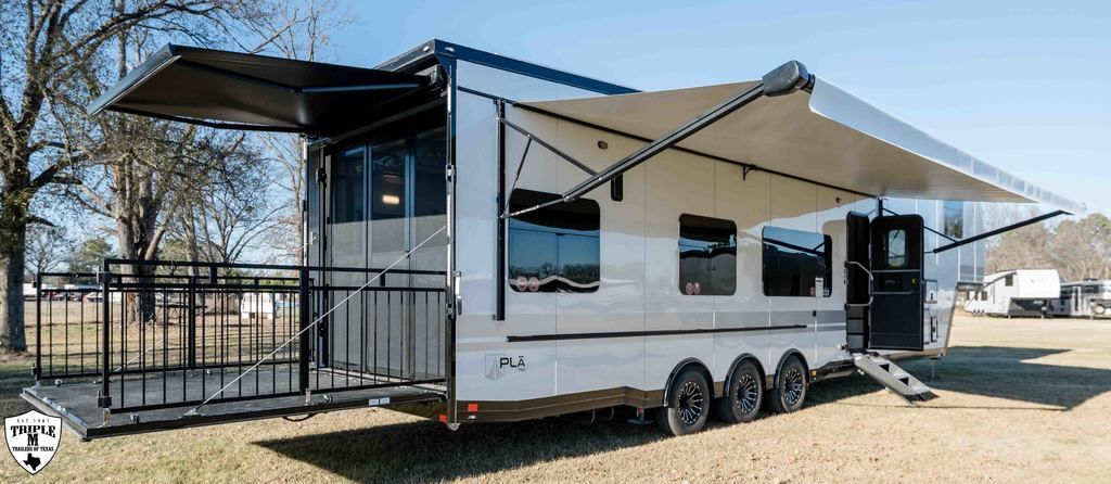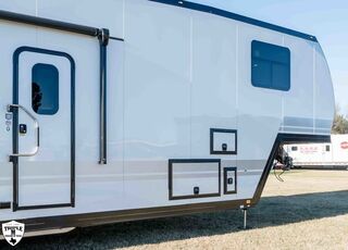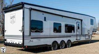 PLa 750 model 4419 44’ LONG / 8’10’ TALL / 8’6 WIDE EXTERIOR COLOR = POLAR WHITE INTERIOR COLOR = LINEN BEIGE CABINET COLOR = NAUTICAL BLUE COUNTERTOP COLOR = VENATO SPARKLE GRAPHICS COLOR = BLACK ABOVE & BEYOND w/ ALL WEATHER PACKAGE CARGO AREA: Cableless Rear Ramp Door Spoiler with Loading Lights LifeTrac Modular Component System Tie Downs (3) Rows of Airline Tracks with Covers Exterior Pass Through Storage TOWING: Hitch GenY Hitch (Gooseneck) Stabilizer System Hydraulic Auto Level Wheels Aluminum Rims/Maxxis Tires Spare Tire Steel Rim Bogey Wheels Backup Camera Prep EXTERIOR LIVING: (2) Scene Lights (Curbside) Fold Out Adjustable Step Power Awning with Light Strip TV Prep Exterior HD Digital TV Antenna with Wifi Router INTERIOR LIVING: Energy Package 1000 with Lithium Battery Touchscreen User Control Panel Dimmable Can Ceiling Lights Smart TV 50? (120V) Entry Door with Tinted Window and Screen Door Frameless Dual Pane Windows with Shades and Screens Flooring Composite with Commercial Grade Vinyl Stereo with Interior and Exterior Speakers KITCHEN/DINING: Aluminum Cabinets with Solid Surface Countertops Dinette Table with 4 Folding Chairs 15 cu ft Refrigerator (12V) Convection Microwave LP 3 Burner Cooktop Kitchen Slide Out BEDROOM: Aluminum Cabinets with Solid Surface Countertops TV Prep in Bedroom Residential Queen Bed with Storage BATHROOM: Aluminum Cabinets with Solid Surface Countertops Porcelain Toilet Shower 30? x 48? with Glass Doors Spa/Jet Shower Fixture HEATING / COOLING: (3) 15K BTU AC with Heat Pump, Soft Start, 5 Year Warranty Furnace = 35K BTU (3) 12V Roof Vent with Remote PLUMBING: City Water Hookup with Fill 100 Gallon Fresh Water Tank 90 Gallon Gray Tank 45 Gallon Waste Tank with Flush 10 Gallon Water Heater (LP Gas/Electric) Heat Pads/Tape on Tanks and Waterlines Exterior Water Spigot (2) 30 lbs LP Tanks with Quick Connect PREMIER Pl? 750 PACKAGE: HD Smart TV 32? (12V) in Bedroom Truma Aquago Instant Water Heater Exterior Shower Slider Tray in Pass Through Storage Generator 6.0K w/ 36 Gallon Tank Fuel Fill Station w/ 36 Gallon Tank 2nd 100 Gallon Fresh Water Tank Happijac Bed Lift Standard Queen Happijac Sofa Sleepers Sofa Sleeper 6’ (Grey) ENERGY PACKAGE 6000 (UPGRADE): 1,200 Watts Solar 6,000 Watt Inverter 100 Amp Charge Controller 810 Amp Hours Heated Lithium Battleborn Battery UPGRADES: HAPPIJAC SOFA ARMRESTS KING SIZE IN BEDROOM 32” HD SMART TV IN GARAGE EXTERIOR LADDER LIFETRAC EXTERIOR CURBSIDE EMPTY = 15,103 GVWR = 21,000