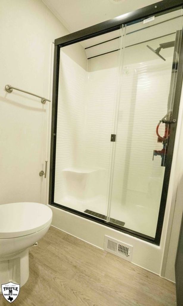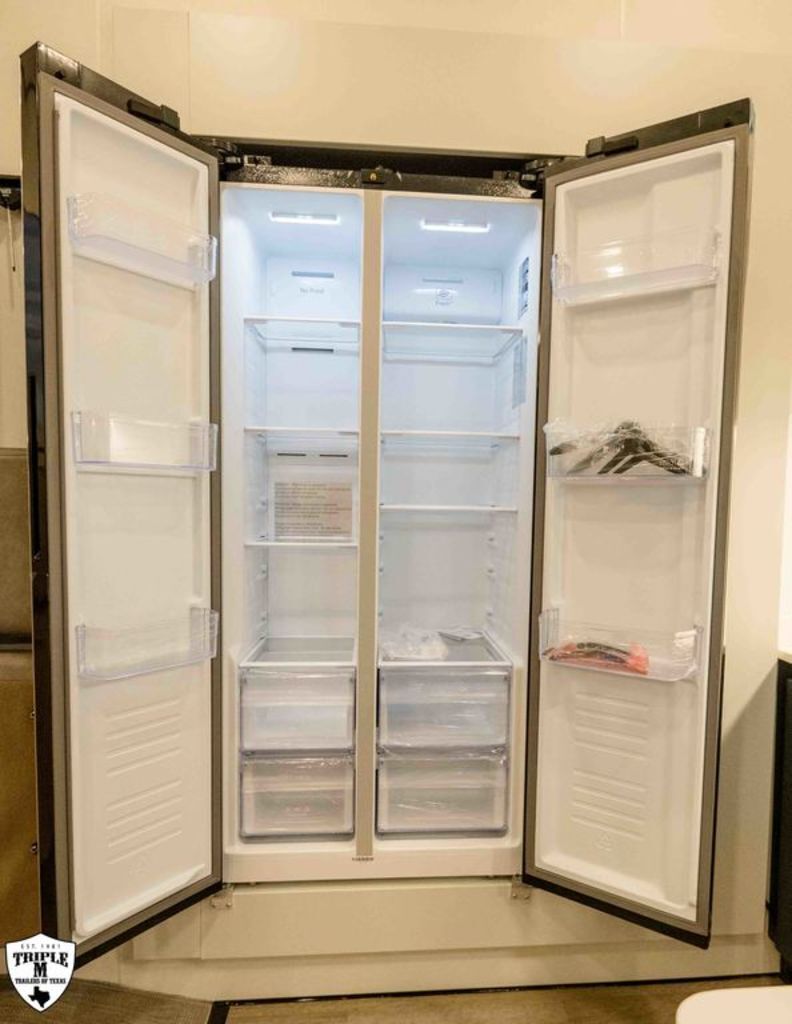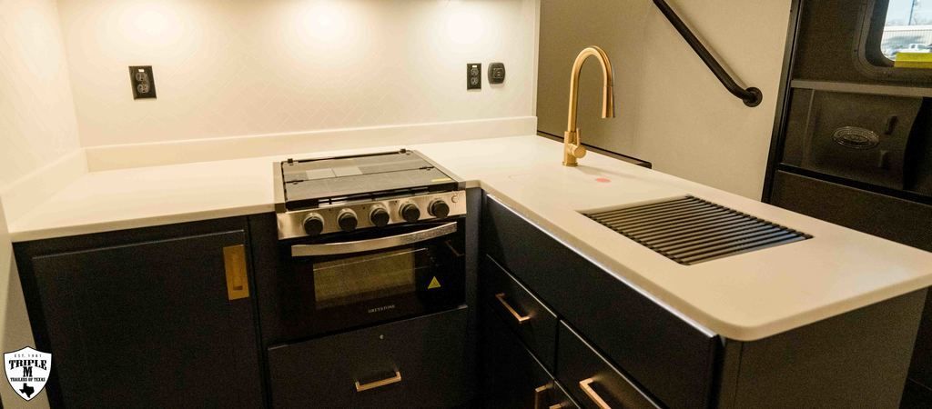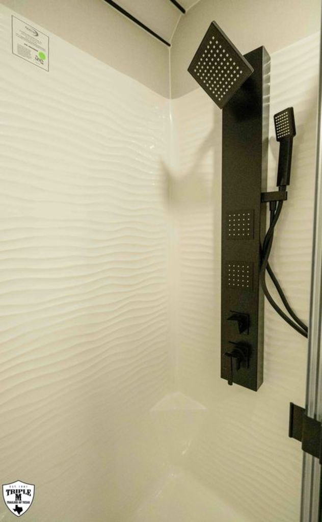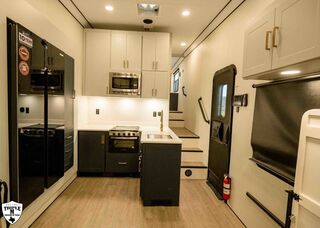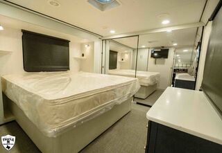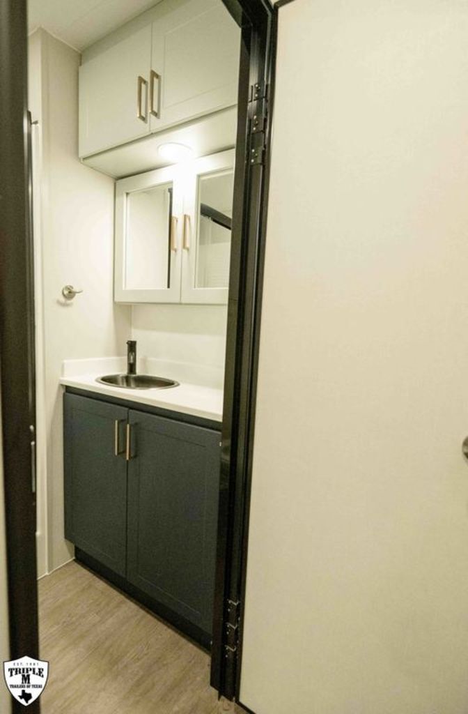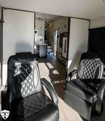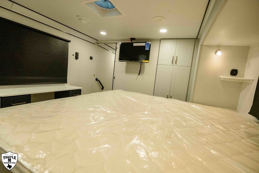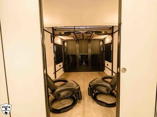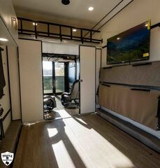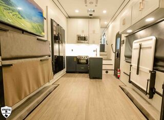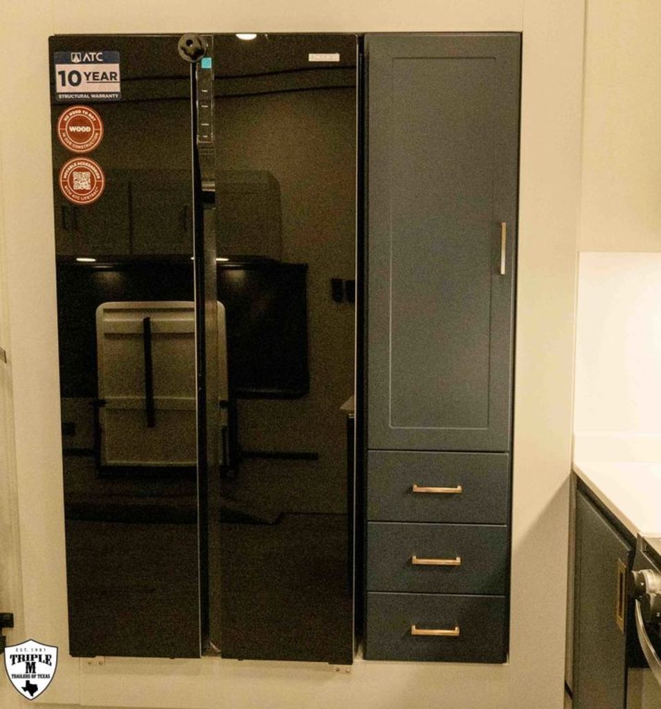 PLa 750 model 4419 44’ LONG / 8’10’ TALL / 8’6 WIDE EXTERIOR COLOR = POLAR WHITE INTERIOR COLOR = LINEN BEIGE CABINET COLOR = NAUTICAL BLUE COUNTERTOP COLOR = VENATO SPARKLE GRAPHICS COLOR = BLACK ABOVE & BEYOND w/ ALL WEATHER PACKAGE CARGO AREA: Cableless Rear Ramp Door Spoiler with Loading Lights LifeTrac Modular Component System Tie Downs (3) Rows of Airline Tracks with Covers Exterior Pass Through Storage TOWING: Hitch GenY Hitch (Gooseneck) Stabilizer System Hydraulic Auto Level Wheels Aluminum Rims/Maxxis Tires Spare Tire Steel Rim Bogey Wheels Backup Camera Prep EXTERIOR LIVING: (2) Scene Lights (Curbside) Fold Out Adjustable Step Power Awning with Light Strip TV Prep Exterior HD Digital TV Antenna with Wifi Router INTERIOR LIVING: Energy Package 1000 with Lithium Battery Touchscreen User Control Panel Dimmable Can Ceiling Lights Smart TV 50? (120V) Entry Door with Tinted Window and Screen Door Frameless Dual Pane Windows with Shades and Screens Flooring Composite with Commercial Grade Vinyl Stereo with Interior and Exterior Speakers KITCHEN/DINING: Aluminum Cabinets with Solid Surface Countertops Dinette Table with 4 Folding Chairs 15 cu ft Refrigerator (12V) Convection Microwave LP 3 Burner Cooktop Kitchen Slide Out BEDROOM: Aluminum Cabinets with Solid Surface Countertops TV Prep in Bedroom Residential Queen Bed with Storage BATHROOM: Aluminum Cabinets with Solid Surface Countertops Porcelain Toilet Shower 30? x 48? with Glass Doors Spa/Jet Shower Fixture HEATING / COOLING: (3) 15K BTU AC with Heat Pump, Soft Start, 5 Year Warranty Furnace = 35K BTU (3) 12V Roof Vent with Remote PLUMBING: City Water Hookup with Fill 100 Gallon Fresh Water Tank 90 Gallon Gray Tank 45 Gallon Waste Tank with Flush 10 Gallon Water Heater (LP Gas/Electric) Heat Pads/Tape on Tanks and Waterlines Exterior Water Spigot (2) 30 lbs LP Tanks with Quick Connect PREMIER Pl? 750 PACKAGE: HD Smart TV 32? (12V) in Bedroom Truma Aquago Instant Water Heater Exterior Shower Slider Tray in Pass Through Storage Generator 6.0K w/ 36 Gallon Tank Fuel Fill Station w/ 36 Gallon Tank 2nd 100 Gallon Fresh Water Tank Happijac Bed Lift Standard Queen Happijac Sofa Sleepers Sofa Sleeper 6’ (Grey) ENERGY PACKAGE 6000 (UPGRADE): 1,200 Watts Solar 6,000 Watt Inverter 100 Amp Charge Controller 810 Amp Hours Heated Lithium Battleborn Battery UPGRADES: HAPPIJAC SOFA ARMRESTS KING SIZE IN BEDROOM 32” HD SMART TV IN GARAGE EXTERIOR LADDER LIFETRAC EXTERIOR CURBSIDE EMPTY = 15,103 GVWR = 21,000