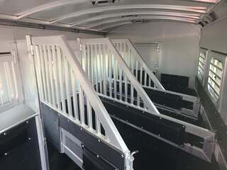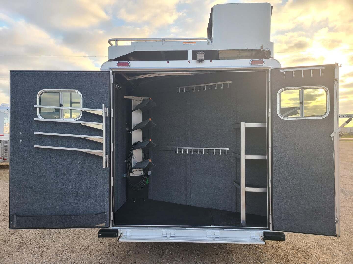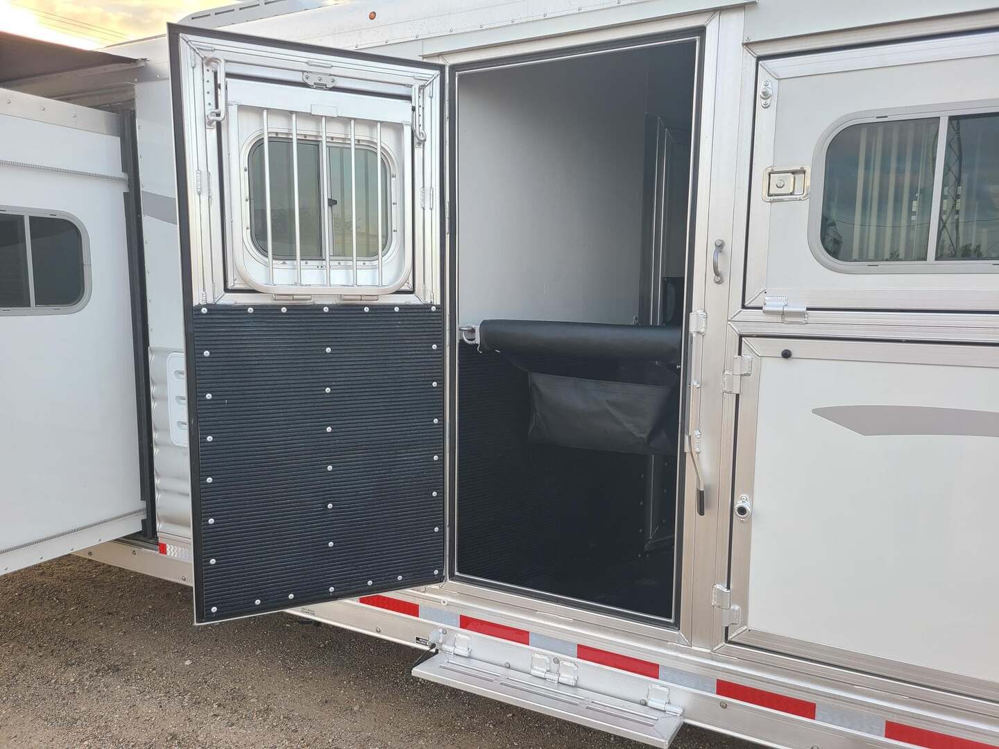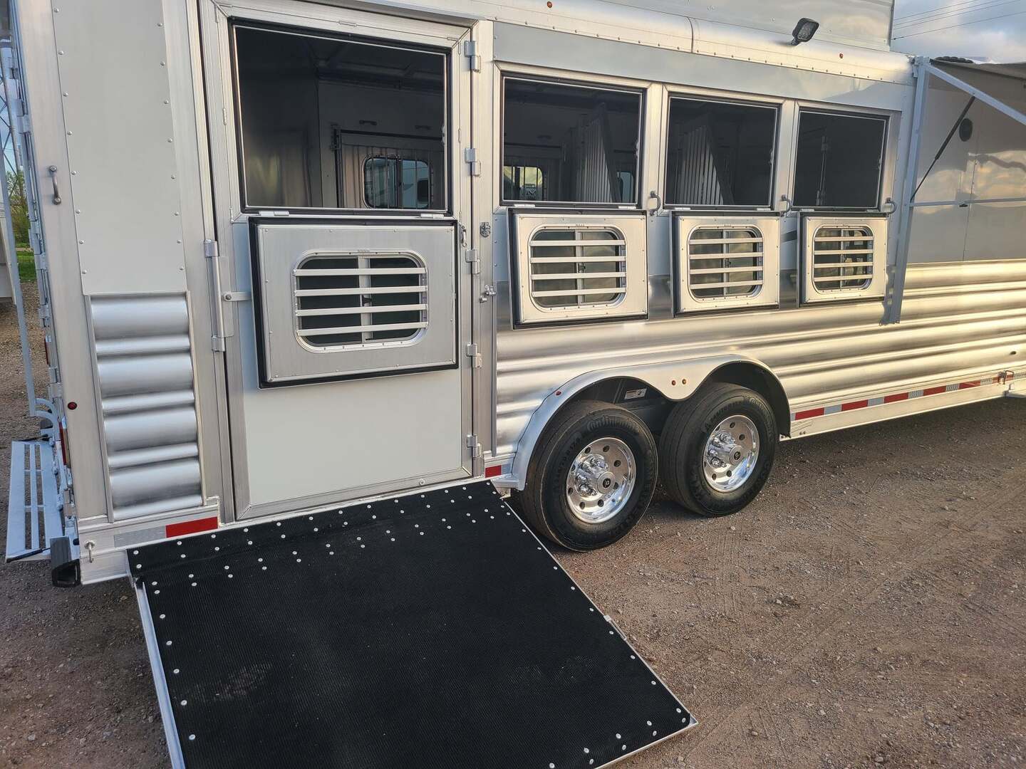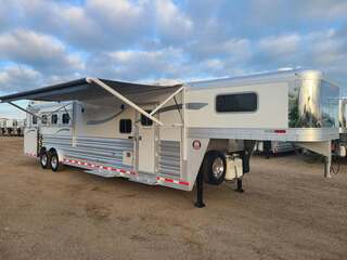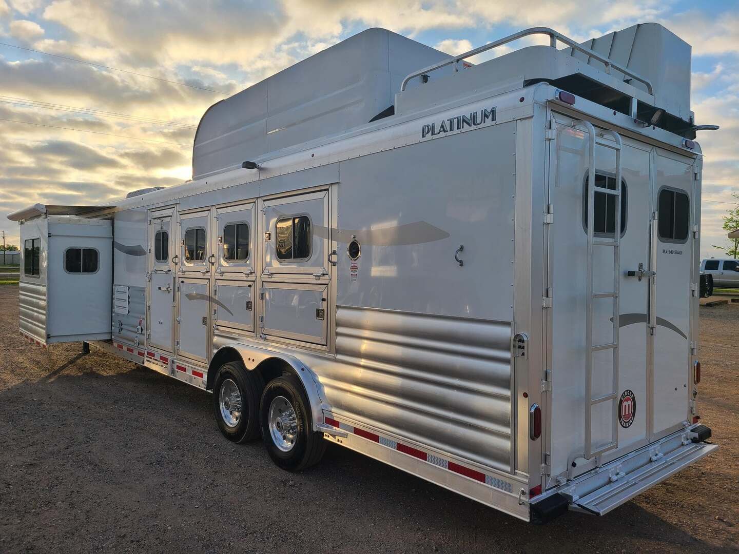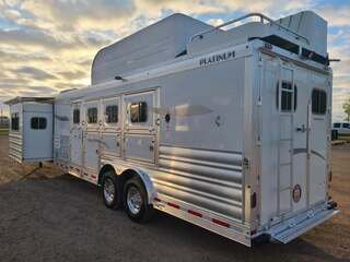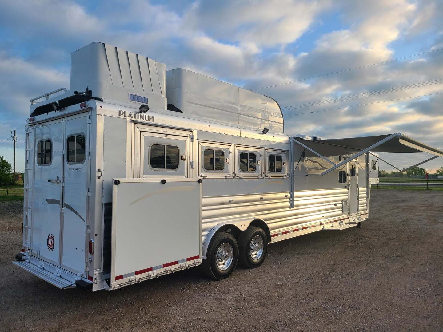 Platinum Coach 4 horse with 13’8” Short wall Proline XP by Outlaw Conversions interior SLIDE OUT with 72” Sofa Sleeper and Corner Bench with SIDE LOAD Platinum Coach features: 8 wide x 33’ long x 7’6” tall 70/30 Rear Doors & SIDE LOAD 3 mangers with escape door at head Drop down window bars on head side Drop down windows on curb side 8’ hay pod & ladder 24” walk through door Baby panel with rubber on first divider Flow through and swing back dividers 2” Blocked axles for additional ground clearance 4 outside halogen load lights 4 tier saddle rack, surrounded by 30 hooks!! 4 tier swing out blanket bar Three shelves in curb side of rear tack area Flow through style steps 10,000# axles 18 ply tires & 17.5” aluminum wheels Flip down 4’ bench  LED load lights Proline XP by Outlaw Conversion Features: 13’8” short wall 72” Sofa Sleeper in 6’ ELECTRIC SLIDE OUT Corner bench next to R/V door Dual-Hydraulic Jacks Dark Knotty Alder cabinetry Wardrobe in nose Onan 4.0 MicroQuiet generator on Platform 15,000 BTU A/C with heat pump 20,000 BTU furnace Electric power awning...NICE!!! 6 gallon hot water heater with Propane heat 60 gallon water tank AM/FM/CD/DVD player with 2 interior and 2 exterior speakers TWO 32” LED flat screens on arm Double bowl almond kitchen sink & faucet 2 Hardwood hat racks over R/V door 6.0 refrigerator Glass cover 2 Burner cooktop Microwave oven with vent hood Extra wide pocket door to bathroom 32” radius shower w/ bronze glass door & vent overhead Porcelain toilet with foot flush Mirror next to walk through door