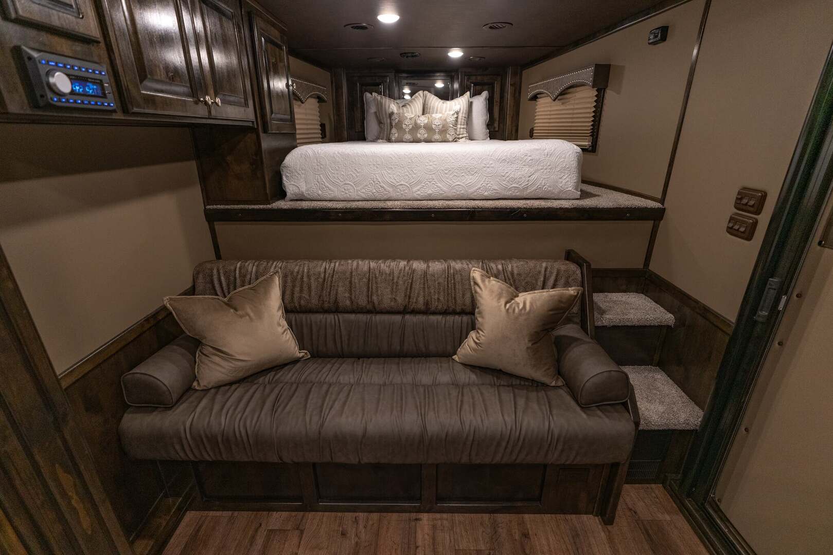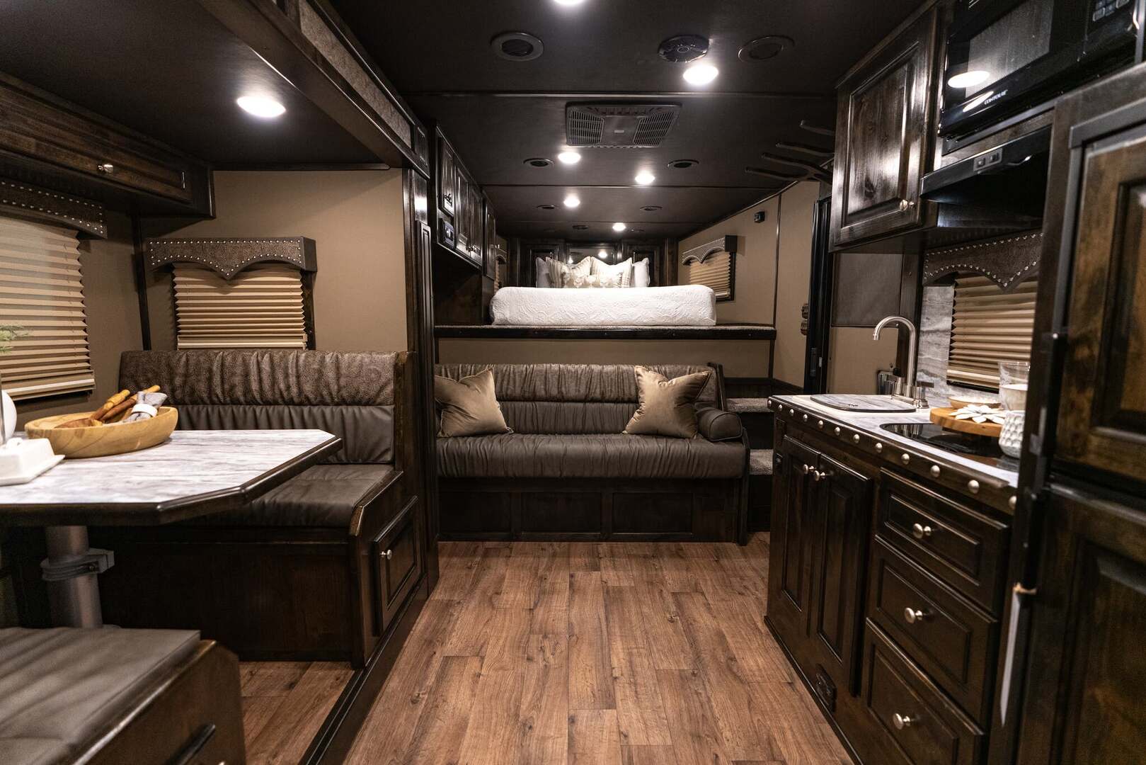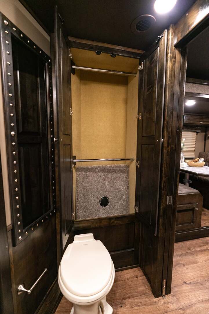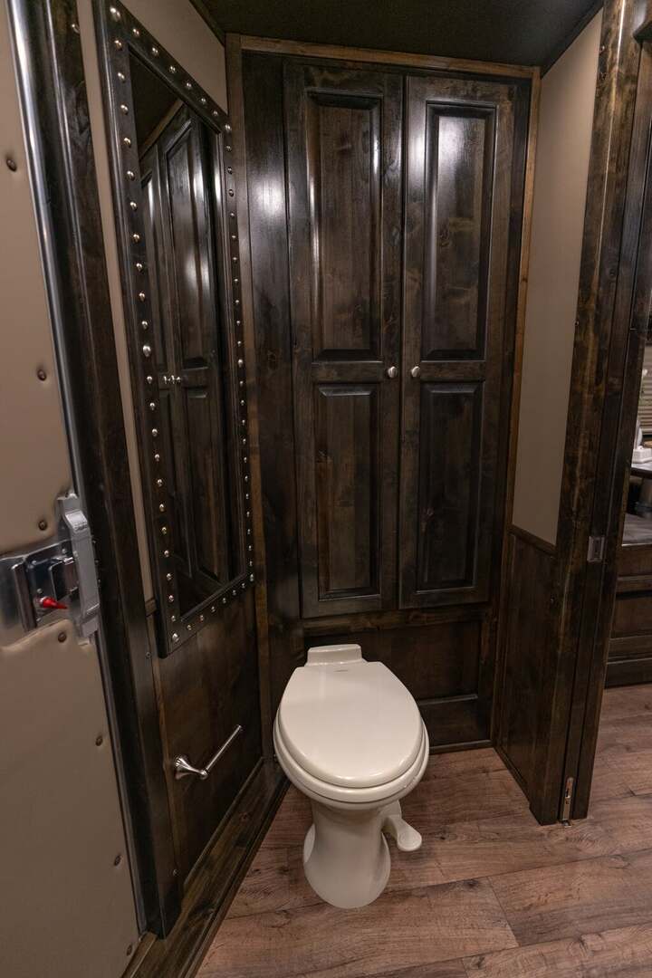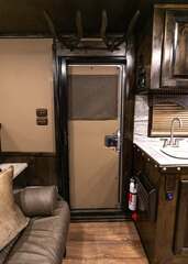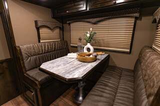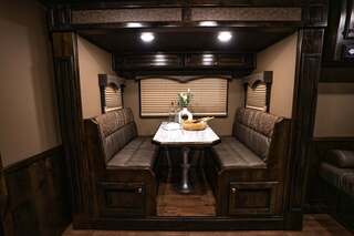 Platinum Coach 4 horse with 14’ Short wall Proline XP by Outlaw Conversions interior SLIDE OUT with 72” Sofa Sleeper and Dinette with SIDE LOAD Platinum Coach features: 8 wide x 33’ long x 7’6” tall 70/30 Rear Doors & SIDE LOAD 3 mangers with escape door at head Drop down window bars on head side Drop down windows on curb side 8’ hay pod & ladder 24” walk through door Baby panel with rubber on first divider Flow through and swing back dividers 2” Blocked axles for additional ground clearance 4 outside halogen load lights 4 tier saddle rack, surrounded by 30 hooks!! 4 tier swing out blanket bar Three shelves in curb side of rear tack area Flow through style steps 10,000# axles 18 ply tires & 17.5” aluminum wheels Flip down 4’ bench  LED load lights Proline XP by Outlaw Conversion Features: 14’ short wall 72” Dinette in 6’ ELECTRIC SLIDE OUT Sofa sleeper at drop wall Dual-Hydraulic Jacks Dark Knotty Alder cabinetry Wardrobe in nose Onan 4.0 MicroQuiet generator on Platform 15,000 BTU A/C with heat pump 20,000 BTU furnace Electric power awning...NICE!!! 6 gallon hot water heater with Propane heat 60 gallon water tank AM/FM/CD/DVD player with 2 interior and 2 exterior speakers 32” LED Smart TV over fridge on door with locking arm Almond kitchen sink &  bronze faucet 2 Hardwood hat racks over R/V door 6.0 refrigerator Glass cover 2 Burner cooktop Microwave oven with vent hood Extra wide pocket door to bathroom 32” radius shower w/ bronze glass door & vent overhead Porcelain toilet with foot flush Mirror next to walk through door