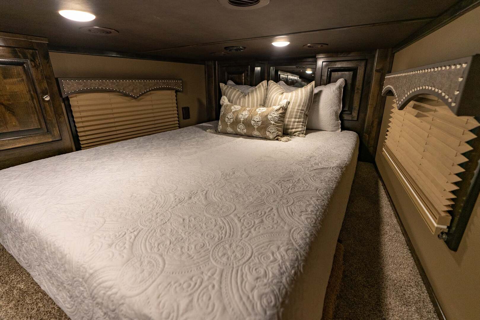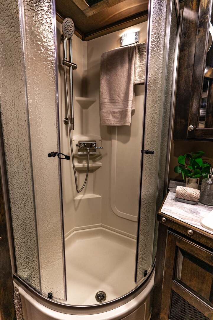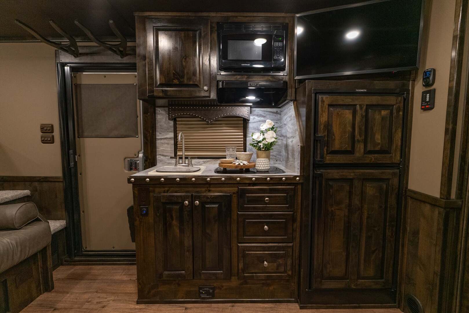 Platinum Coach 4 horse with 14’ Short wall Proline XP by Outlaw Conversions interior SLIDE OUT with 72” Sofa Sleeper and Dinette with SIDE LOAD Platinum Coach features: 8 wide x 33’ long x 7’6” tall 70/30 Rear Doors & SIDE LOAD 3 mangers with escape door at head Drop down window bars on head side Drop down windows on curb side 8’ hay pod & ladder 24” walk through door Baby panel with rubber on first divider Flow through and swing back dividers 2” Blocked axles for additional ground clearance 4 outside halogen load lights 4 tier saddle rack, surrounded by 30 hooks!! 4 tier swing out blanket bar Three shelves in curb side of rear tack area Flow through style steps 10,000# axles 18 ply tires & 17.5” aluminum wheels Flip down 4’ bench  LED load lights Proline XP by Outlaw Conversion Features: 14’ short wall 72” Dinette in 6’ ELECTRIC SLIDE OUT Sofa sleeper at drop wall Dual-Hydraulic Jacks Dark Knotty Alder cabinetry Wardrobe in nose Onan 4.0 MicroQuiet generator on Platform 15,000 BTU A/C with heat pump 20,000 BTU furnace Electric power awning...NICE!!! 6 gallon hot water heater with Propane heat 60 gallon water tank AM/FM/CD/DVD player with 2 interior and 2 exterior speakers 32” LED Smart TV over fridge on door with locking arm Almond kitchen sink &  bronze faucet 2 Hardwood hat racks over R/V door 6.0 refrigerator Glass cover 2 Burner cooktop Microwave oven with vent hood Extra wide pocket door to bathroom 32” radius shower w/ bronze glass door & vent overhead Porcelain toilet with foot flush Mirror next to walk through door