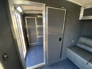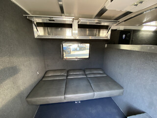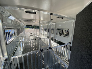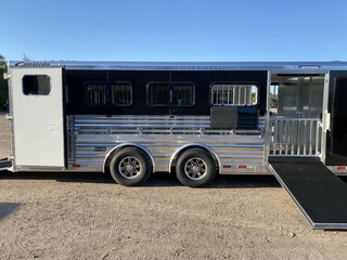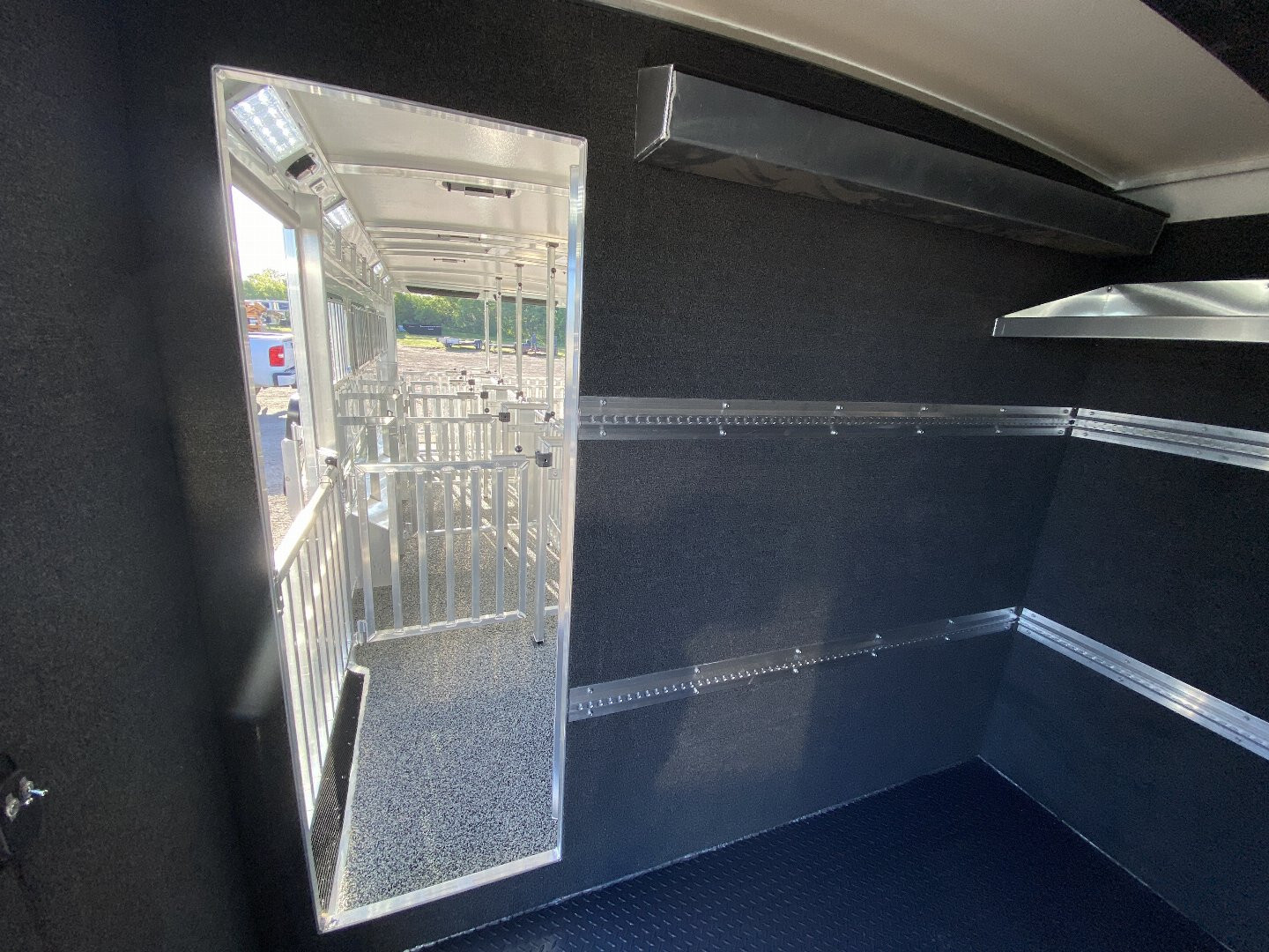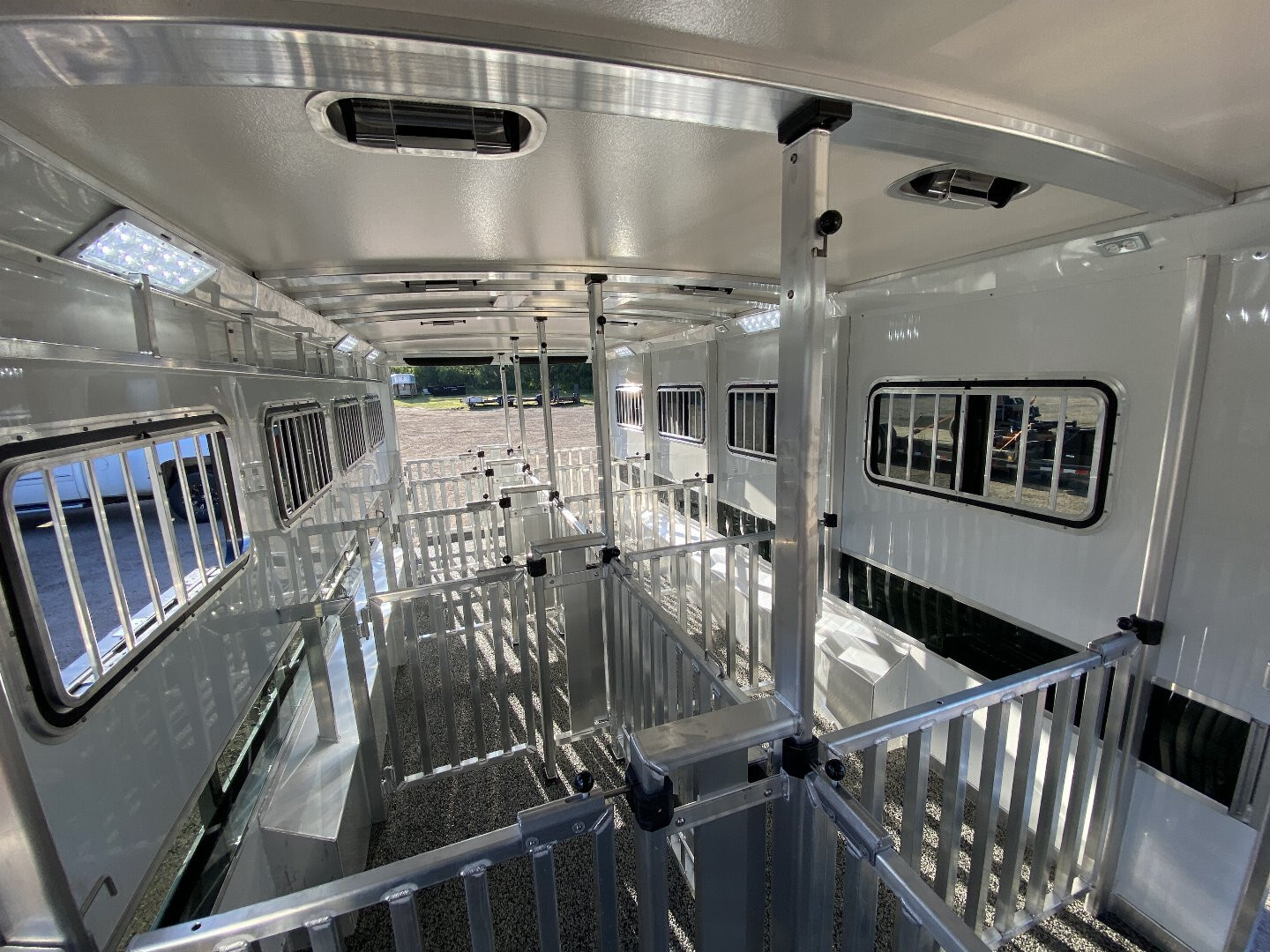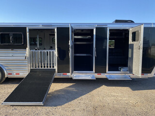 2025 Cimarron 10 Pen Showstar XL Black with Polished Aluminum 31’9” Box Length 6’ 8” Height 8’ Wide 9’ Gooseneck Nose 53” Drop Wall for Gooseneck more Truck Bed Clearance 2-7000 Axles Electric Brakes w/ AIR RIDE Aluminum 16” Wheels Hydraulic Jack LED Lights LED Load Lights 6’5” Front Tack 32” Door 22” Pass Through Tack Door Back Up Lights Generator Brackets 50/50 Rear Doors with Ramps 10 Pen Adjustable 32” Escape Door Drivers Side Front Pen 48” Side Ramp Front Pen Fold Down Air Gaps Head Padding above Pen Area Doors 110v 50 amp Electric Package Outlets A/C in Front Tack w/Heat Strips A/C Frame Out in Pen Area Carpet Lined 75” Long Fold Down Couch in Front Tack Airliner rack Feed Pan Storage WERN Flooring Lots of Extras Ready to Go Show!