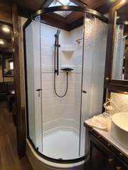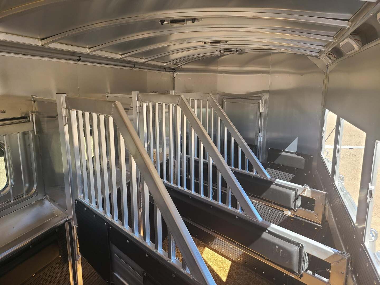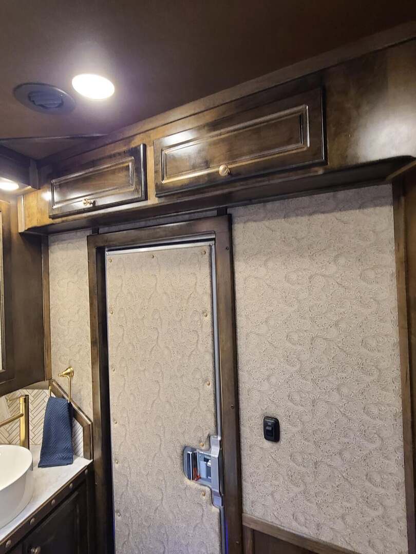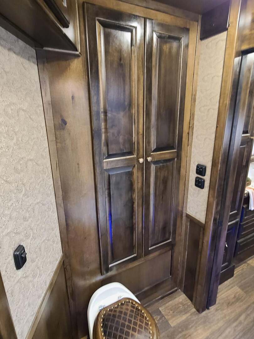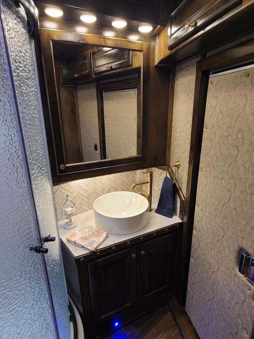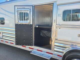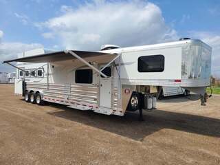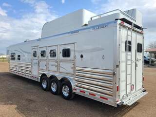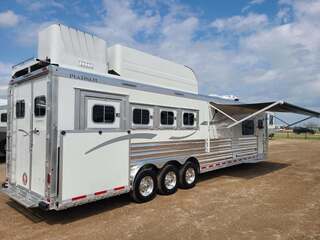 Platinum Coach 4 Horse 15’ 8” short wall Outlaw Conversion features: 8 x 35 x 8 tall 78” Couch & 72” Dinette floor plan Onan 4.0 Generator with 16 gallon fuel tank Only 70 hours on generator 15,000 BTU A/C with heat pump 32” Smart TV’s in living and bed area Winegard Connect 2.0 antenna for WiFi AM/FM/CD/DVD player with exterior speakers 6.0 Propane / Electric refrigerator 60 gallon water tank 20,000 BTU furnace 6 gallon propane water heater Two burner recessed cooktop Convection oven over cooktop Mocha Quartz kitchen sink with pull-out fauctet Slide out trash can under pantry storage Front bench area with storage underneath 34” radius shower in bathroom Porcelain toilet in front of double rod closet with leather on lid Vanity and sink under medicine cabinet next to shower Beautiful vessel sink, custom ordered for this design Pocket door to bathroom with mirror on bathroom side 24” walk through door to horses 18’ Two-Step awning Platinum Coach features: Tri-8k axles with 17.5” aluminum wheels & 18 ply tires Side load configuration, LOADED REAR TACK WERM flooring in horse compartment 3 mangers, escape door on first stall, head side 52” tall spring loaded side ramp, 46” last stall 8’ hay pod with generator landing Flow through dividers, telescoping last divider Stud divider with rubber on first stall Drop down windows on head and hip side Drop down window bars on head side Carpeted rear tack, loaded with bars, hooks, trays, and shelves 2-30# propane bottles Double aluminum battery box with ON/OFF switch 15,000# Equalizer Hydraulic jack THIS TRAILER WAS ONLY USED 5 TIMES AND TRADED IN ON A 5 HORSE!!