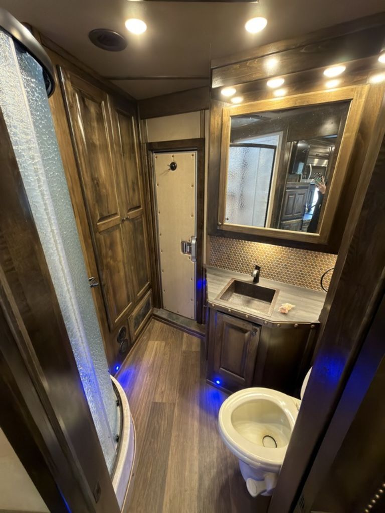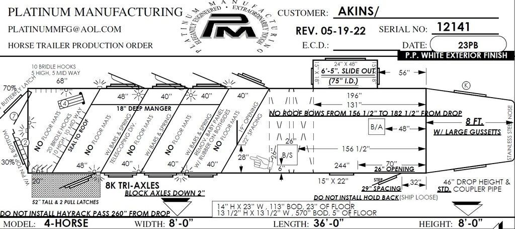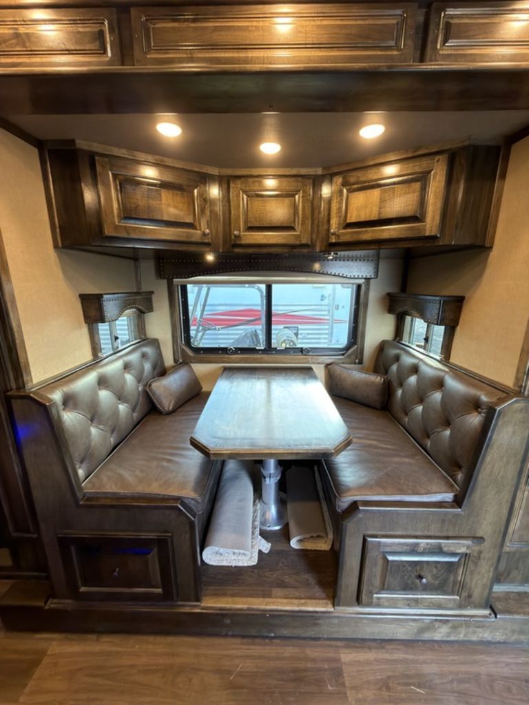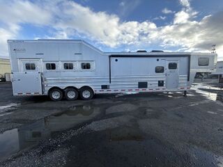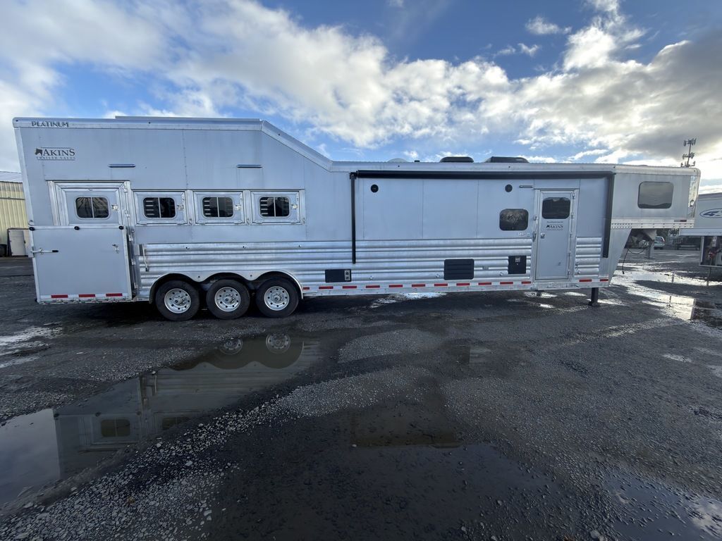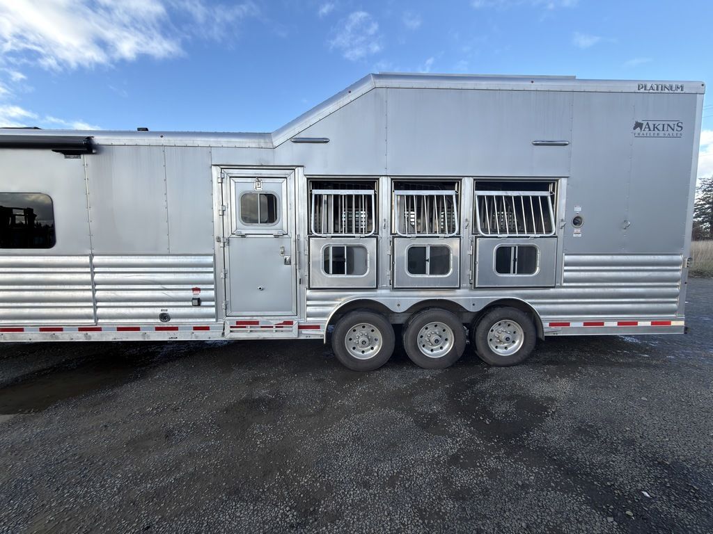 2024 Platinum Coach 4 H 16’ 4” LQ with Outlaw Conversion Features May Include: STRUCTURAL 8’ Tall 8’ Wide 16’ 4” Living Quarter 36’ Floor Length 44’ Overall Length Empty Weight: 11,175 lb. GVWR: 25,000 lb. 4 Horse Side Load All Aluminum Framing Insulated Horse Area EXTERIOR One-Piece Aluminum Roof Skin Silver Metallic Exterior Package 2 Batteries and Boxes Power Awning w/Cover, & LED Lights 18 FT Integrated Hay Pod With LadderDual-Leg Hydraulic Jack 30 LB Propane TanksSTALL AREA 4 Horse Side LoadLoading Ramp Aluminum Floors Permanent WERM Flooring (Color TBD) Drop Down Windows on Head and Tail SideFully Matted Walls Interior and Exterior Tie Rings Two-way pop up ventsAluminum Padded Dividers with Slam LatchesLower Stud Wall (first stall)Escape Door in First Stall with Drop Down WindowExterior Step at Escape Door 18” Deep Mangers (Every Stall but First) Walk Through Door from LQ to Horse Area TACK ROOM Full Rear Tack Carpeted Bridle Hooks Upper and Lower (4)-Tier Stationary Saddle Rack Corner Shelves Larger Upper Shelf APPLIANCE 6-Cubic Ft. Refrigerator LP/120v Stainless Convection Microwave Oven 2-Burner Cooktop w/Cover INTERIOR DECOR Knotty Alder Maple - Mocha Brio Interior Package Countertops โ€“ Formica w/Nail Heads on EdgeBella Dinette Sleeper - Leather with Tufted Backs w/Wood Stained Table Bella Sofa Sleeper 72” - Leather Tufted Back with Table Bedding โ€“ Outlaw Flex Queen Mattress Vinyl Flooring Soft Touch Walls Steps to Bed Area PLUMBING6 Gallon LP/120v Water Heater w//Electric Start 60 Gal Fresh Water Tank 30 Gallon Each Grey and Black Water Tank ELECTRICAL On Board Generator (2) 32” LED Flat Screen Smart TV 4 Interior and 2 Exterior Speakers Ducted 25,000 BTU Furnace โ€“ 4 Ducts Ducted 15,000 BTU A/C with Heat Strip and Thermostat Connect 2.0 (WiFi, 4G, OTA, AM/FM) BATHROOM Vanity, Medicine Cabinet with Mirror Standard Faucet with Mirror Porcelain Almond Toilet with Foot Flush 32” Radius w/Skylight, Rocky Mountain Closet Skylight CABINETSSolid Hardwood Raised Panel Square Cabinet Doors Front Gooseneck Cabinet Please Note, this trailer is on consignment. Being Sold AS IS. This trailer has been ran through our service department. Pickup & Delivery time is based on the service department’s schedule at the time of purchase.*Please review all features with a salesperson. We try our best, but sometimes features and dimensions get mislisted. Thank you!*Akins Trailer Sales541-995-4884* Located in Harrisburg, Oregon* Financing Available* Trade-Ins Considered