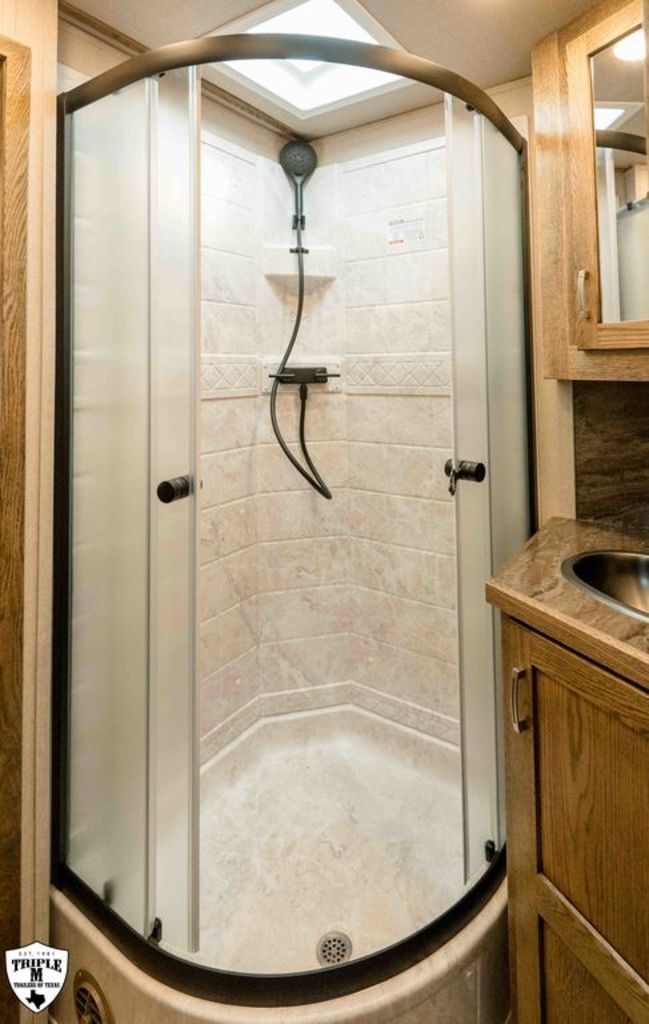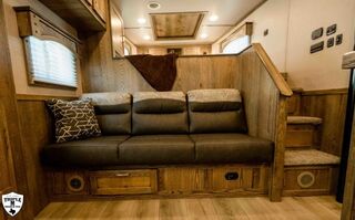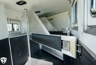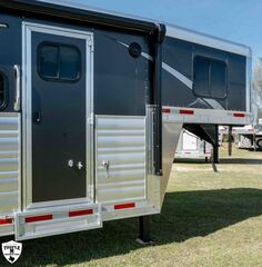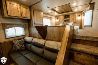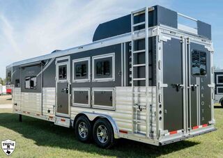 3H CHARGER w/ 13’ SOFA ON THE RISER LQ 27’ FLOOR / 35’ OVERALL8’ WIDE / 7’6 TALLSOFA / SLEEPER ON THE RISERDINETTE IN THE SLIDE OUTDUCTED ACDAY/NIGHT SHADESWINDOWS IN SLIDE OUT END WALLSINTERIOR PACKAGE:Pass Thru DoorDual BatteriesSkylight in ShowerRain Sensor FanENTERTAINMENT PACKAGE:TV (Upgraded to 32”)Stereo w/ (2) Inside & Outside SpeakersDUCTED ACROCKY MOUNTAIN RADIUS SHOWER10 GAL H2O HEATERRECESSED COOKTOPDAY/NIGHT SHADES3 WAY SWITCH FOR LIGHTS IN HORSE AREALIGHTED GRAB HANDLEPOLISHED NOSE WRAPDROP DOWN WINDOWS ON BOTH SIDESADDITIONAL STEP & BAUER LATCH ON SIDE ACCESS DOOREXTRA CLEARANCE LIGHTSADDITIONAL TAIL LIGHTSHAYRACK w/ LADDERFULL SLATSHORSE AREA PACKAGE:Side Access DoorSaddle BossesBottom Stall DividerPOLISHED NOSE WRAPDUAL HYDRAULIC JACK7K TORSION AXLES w/ 16” G RANGE TIRESGUNSMOKE ALUMINUM RIMSSMOKED RED OAK WOOD PACKAGEBRONZITE COUNTERTOPSELEGANCE SEAL w/ VALPORAISO STONE INSERTMATTE BLACK METALLIC SKINEMPTY = 10,860 (EST)GVWR = 14,000