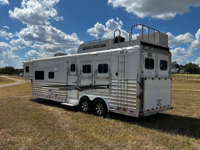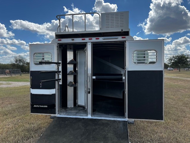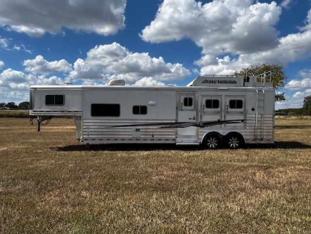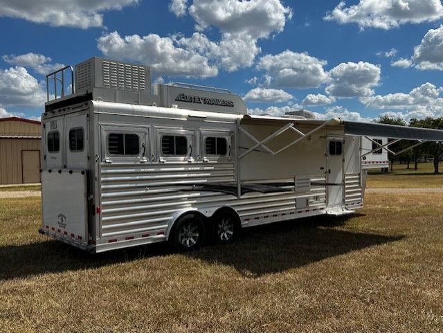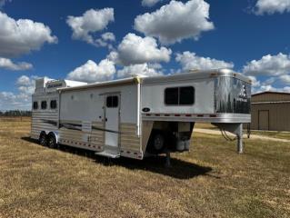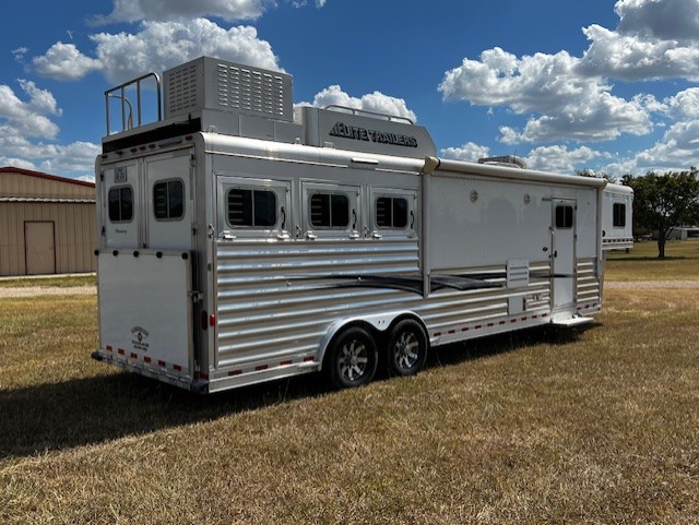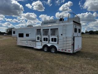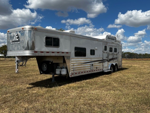Original owner has this Elite 3 horse aluminum trailer with 12'8 living quarters for sale located in Midlothian Texas. This trailer is in immaculate condition and has been kept under cover since day 1. The trailer has been pulled less than 4,000 miles and is like new in every aspect. The LQ's have the Outback conversion. It also has a factory installed generator on top of the hay rack, drop down windows both sides, mangers, collapsible tack area, interior and exterior load lights and 14 ply load range G tires that show no wear or scuffs. This trailer looks like it rolled off the lot yesterday and is priced to sell. Clear title in hand.