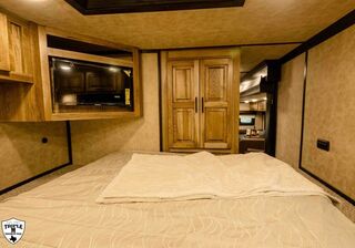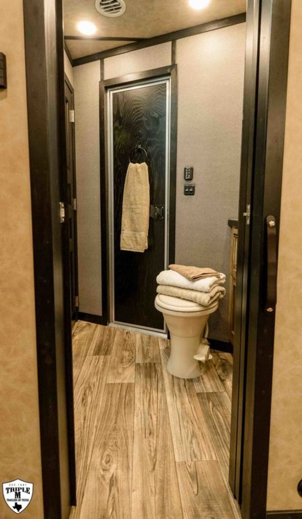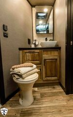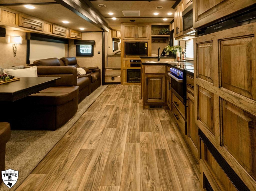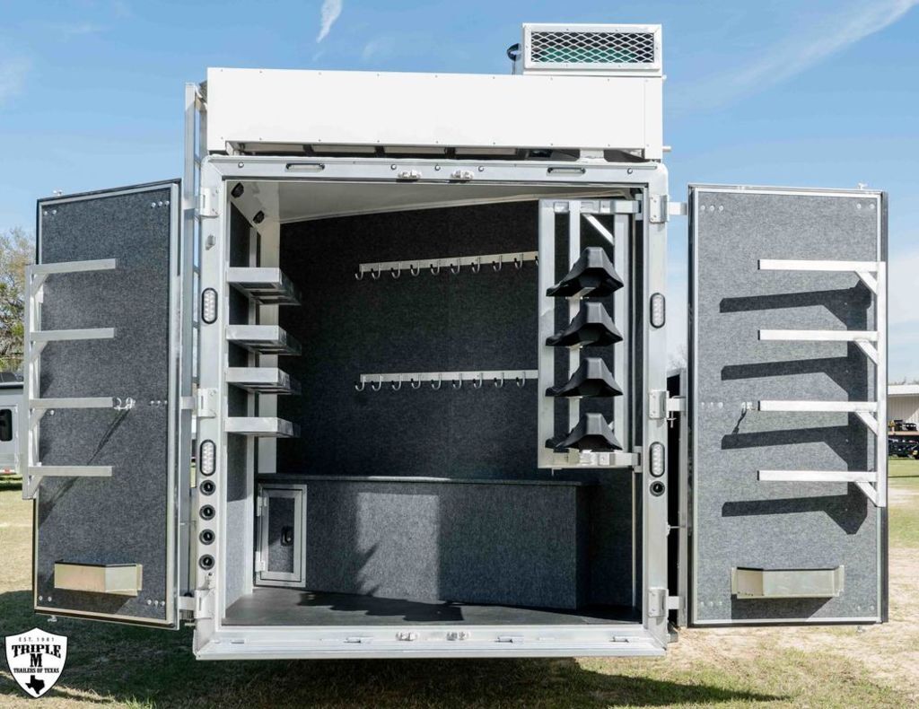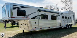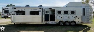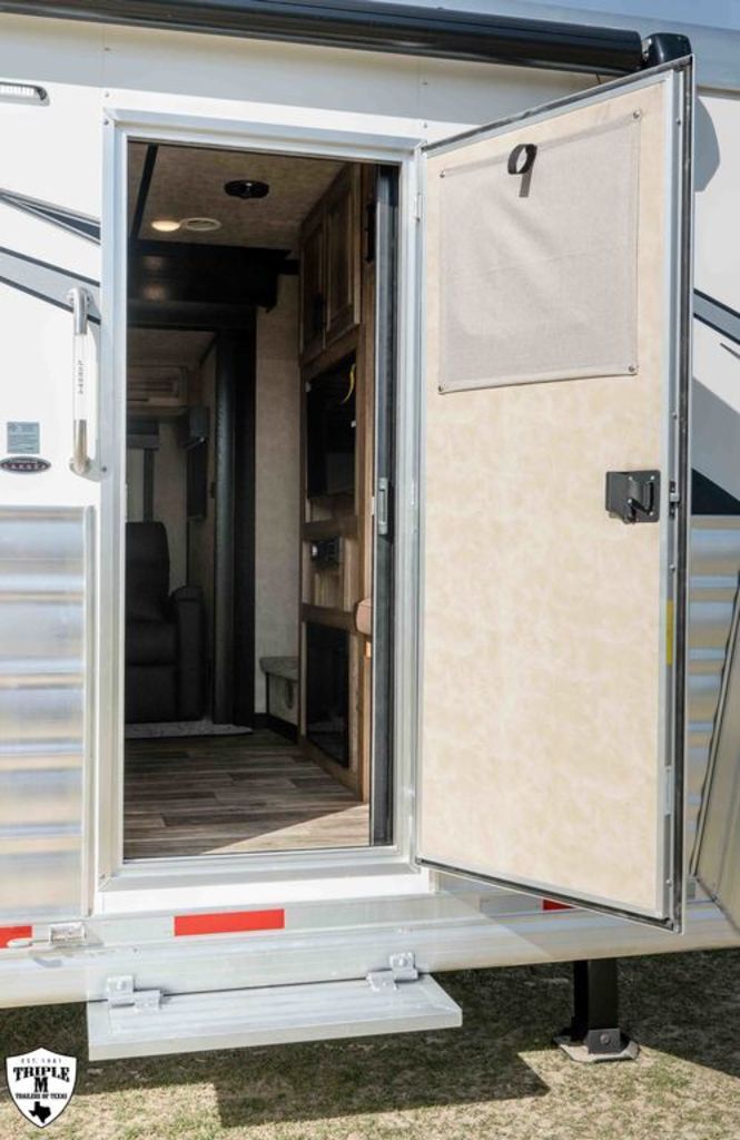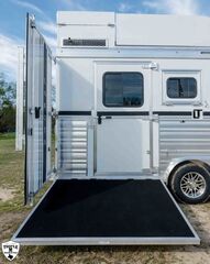 4 HORSE SIDE LOAD w/ 18’ LQ w/ BENCH SEATING 39’ FLOOR / 47’ OVERALL 8’ WIDE / 8’2 TALL body DROP DOWN WINDOWS ON BOTH SIDES REAR SIDE LOAD (includes): 50/50 rear Doors Full Carpeted Rear Tack Side Ramp over Last Door (2) Swinging Blanket Bars on each Rear Door (4) Bridal Trays (2) Brush Trays, one each Door Full Rear Step ADD 1’ TO REAR TACK 60 GALLON H2O IN REAR TACK SWING OUT SADDLE RACK ON CURB SIDE ALUMINUM SKID PLATE @ REAR OF TRAILER CENTER ENTERTAINMENT RECLINERS ILO SOFA EXTRA WARDROBE w/ HANGING RODS (2) A/C UNITS w/ SOFT START ADDED 50 AMP SERVICE HAYPOD w/ 5.5 GAS GEN EXTRA LIGHTS 12v FRIDGE WARDROBE ILO BAR FULL FRONT RISER SMOKED HICKORY CABINETS MEMPIN STRAW SOFT TOUCH DURKIN CHAULK SOFT TOUCH IN BATHROOM BRONZITE COUNTERTOP PEBBLE BACKSPLASH VOYAGER FINA LINOLEUM ELEGANCE CHOCOLATE FURNITURE CONVERTOR/INVERTOR COMBO (1) 5K LITHIUM BATTERIES DUAL SOLAR POWER WHITE SKIN EMPTY = 16,260 GVWR = 21,000