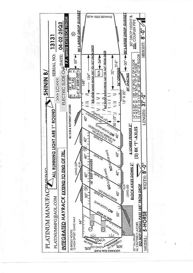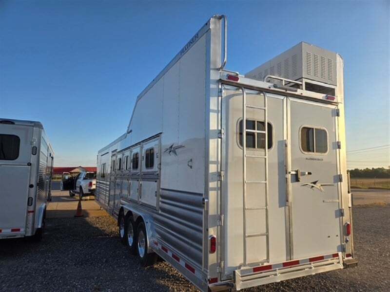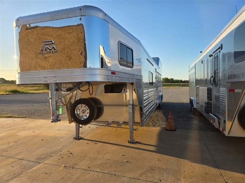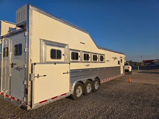 ON ORDER...COMING FEBRUARY 2026...HUGE YEAR END DISCOUNT...$46,732.50 OFF MSRP 2026 PLATINUM 5H REAR SIDE LOAD WITH 14’ SHORT WALL OUTLAW CONVERSIONS PROLINE XP LQ SLIDE OUT...SOFA...DINETTE...INTERGRATED HAYPOD 8’ Wide x 37’ Long x 8’ Tall LIVING QUARTERS FEATURES: 5 YEAR CRAFTSMANSHIP WARRANTY Onan 4.0 Microquite Gas Generator 72” Pull out sofa sleeper Dinette in slide that’s makes into a bed Power awning with metal weather shield and LED lights AM/FM Radio/CD/DVD (2) Interior and (2) exterior speakers (2) LED flat screen smart TVs 12v USB Cell phone outlets Lighted grab handle at LQ door Exterior porch light at LQ door Folding screen door Power roof vent with fan above shower Power vent hood above cooktop Full length mirror in wood frame 7.0 Cu ft LP/120v refrigerator Kitchen drawers 2-Burner recessed cooktop with flush mount glass cover Microwave ove 6 Gallon LP/120v water heater with electric start 60 Gallon fresh water tank Exterior water faucet under nose (2) 30 lb LP tanks with auto change over 15,000 BTU ducted air conditioner with heat strip 20,000 BTU ducted LP furnace Bathroom vanity with medicine cabinet and mirror 32” Radius shower with sliding door Day and night pleated window shades Snap cover over LQ door window Queen mattress Corner cabinets with fixed shelf and mirror in nose Walk thru door from bathroom to stall area TRAILER FEATURES: Rear side load with full width rear tack (3) 8,000 lb HD Dexter-T rubber torsion axles Electric / hydraulic brakes Axles blocked 2” and gooseneck raised 2” to allow for greater clearance between truck bed and gooseneck (7) 245/70R17.5 Continental HTL2 18 ply tires (7) 17.5” 8 Hole aluminum wheels Dual hydraulic jacks WERM flooring in horse area and rear tack Horse area walls and ceiling are lined and insulated Aluminum battery box Intergrated haypod with enclosed lid Generator compartment mounted on roof with platform Full width holdup rear step 50/50 Rear doors with lockable seal plate Stainless steel nose Round LED clearance lights Additional clearance lights on each top rail (3) LED exterior load lights (45) Bridle hooks (3) Brush trays (5) Saddle racks (5) Blanket bars Full width rear tack sealed to roof and floor All walls carpeted in rearbtack Flow thru dividers 1st stall divider is full bottom with flow thru bars  Bottom divider is rubber lined on both sides Rear divider is telescoping Escape door at head of 1st stall stall  Drop down feed door with separate drop down window bars at head of each stall Drop down door at rear of each stall Manger with exterior access door at 2nd, 3rd, 4th and 5th stalls Fold up flow thru step at escape door and LQ door Camper door latch and butter fly latch at escape door MSRP: $241,732.50 Year End Discount: $46,732.50 SHININ’ B PRICE: $195,000.00 Financing Available with approved credit...Delivery Available