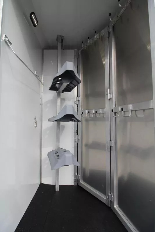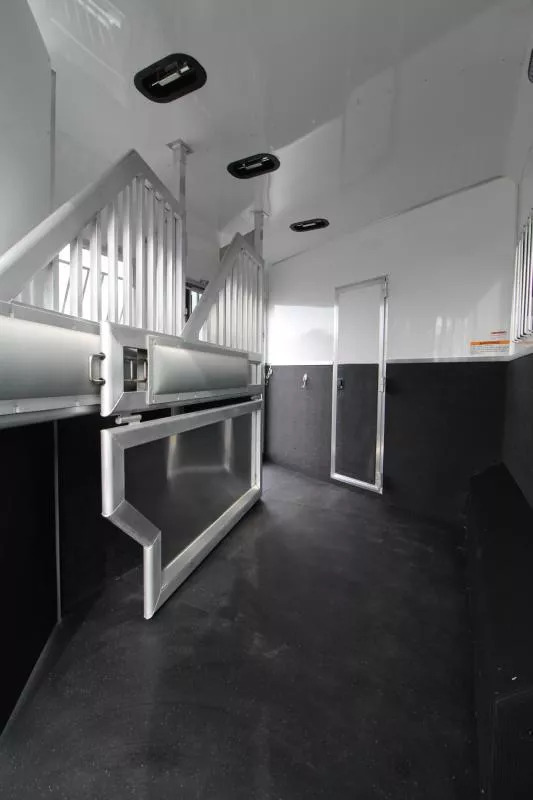 Trailer Features: All Aluminum Construction 8’ Wide 7000# Axles Polished Aluminum Wheels Dual Leg Hydraulic Jack Extruded Slat Outside of Horse Area Folding step at escape door Hay Rack & Ladder Stainless Steel Nose Wrap Full Front Riser Wall Cover Keyless Entry 320W Solar Panel Power Awning w/ Weather shield and light Single Piece Aluminum Roof Side & Rear Load Lights Spare Tire (2) 5 gal. LP Tanks (2) RV Batteries Double Tail Lights LQ Features: LED Puck Lighting in Ceiling Barnwood Linoleum Floor 10 gal. Water Heater Convection Microwave Dream Dinette 2 Burner Recessed Cooktop Dometic Refrigerator Porcelain Toilet Cable Driven Slide Out A/C 12V Fan in Bathroom Glass Shower Door Solid Wood Cabinet Doors Stainless Steel Sinks Soft Touch Pleated day/night Shades Sofa/Sleeper Mattress Gas Furnace 24” TV Radio - interior & exterior speakers Horse Area Features: Air Flow Dividers Escape Door w/ Drop Down Window Step at Escape Door Feed Bag in 1st Stall Stud Divider 55/45 Rear Doors LED Lighting Rubber Wall Mats Rubber Floor Mats Tack Area Features: Collapsible Rear Tack Flip down step Blanket Bar Brush Tray Bridle/Halter Hooks - extra added 3 Tier Saddle Rack on Removable Post LED Dome Light Total height from ground to top of hayrack: 11’6” ** Descriptions Subject to Error** For more information on this trailer please contact Double J Trailers at 360-225-1234. Thank You! Financing available to qualified buyers! All trailer prices are cash prices. Thank you! Trades Welcome Two Lots To Better Serve You! Woodland Washington & Albany Oregon We have over 250 trailers in stock. Please view our entire inventory at [www.double-j.com](http://www.double-j.com/) thank you! *Double J imposes a surcharge of 3% on credit card purchases of amounts greater than $500*