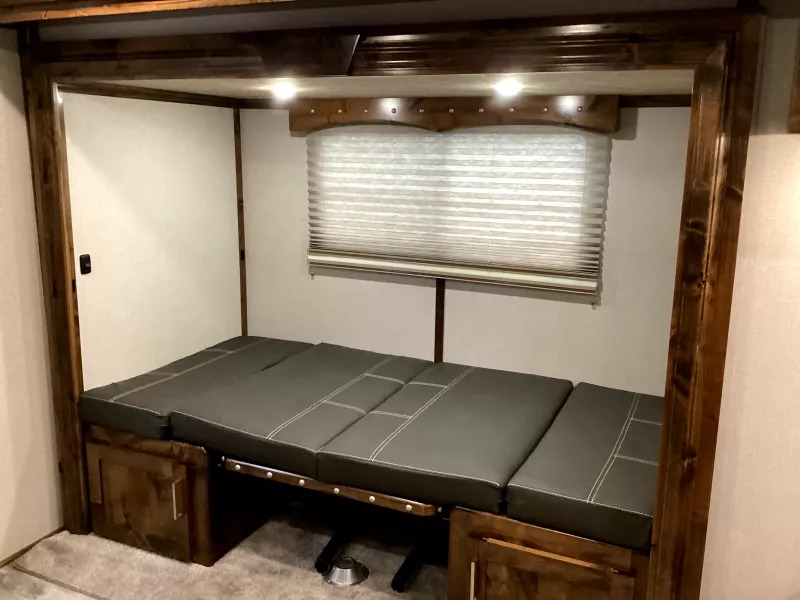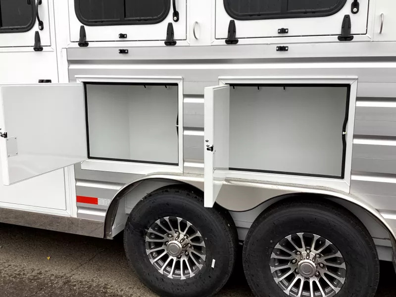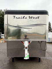 Trails West knows the importance of ease on the road. That’s why we design each living quarters horse trailer to suit your needs. We take the extra step of constructing not only the trailer shell, but the living quarters area as well in our in-house facility in Preston, Idaho. Come see why Trails West has built a reputation for quality, durability and dependability with this unit being a prime example! Travel in style and comfort with this spacious trailer to your next outing with your equine partners. Upgrades: Convenience Package which includes: Spare Tire, Water Tank, Tack Door Organizer, (3) Exterior Load Lights & Sport Boot Bag Exterior Faucet, Outlet, Shower & Speakers 320-watt Solar Hay Pod & Ladder Portable Generator Ready Stainless Nose Pass Through Door Roll Out Screen Door Shower Dome Escape Door Stud Divider Black Out Package Construction & Exterior: Camper Door w/ 24” Window 24” x 48” Egress Window 18” x 18” Kitchen Window 8’0” Gooseneck Dual Hydraulic Jacks Retractable Step Under Camper Door Power Awning Interior: Soft Touch Ceiling Synthetic Leather Sofa or Cushions Wood Valances Day/Night Shades Color Coordinated Interior Vinyl Floor w/ Wood Print Throughout Hardwood Cabinetry Safety: Locking Water Fill Door Fire Extinguisher CO/Smoke Detector L.P. Detector Alternate Emergency Exit Heathing/Insulation: Dual 5 gal. Propane Tanks w/Auto Changeover Fully Insulated Floor, Roof and Walls 18,000 BTU Forced Air Furnace(ducted to bathroom) Ducted A/C Galley: 2 Burner Cooktop w/Range Hood 8 cu. ft Double-door Refrigerator Sink Wood Trimmed Counter Tops Flip-Up Counter Top Extension Microwave/Convection Oven Electrical: Locking Battery Box AM/FM Stereo Monitor Panel 12v Outlets 110v Outlets 110v/12v Power Converter w/Charger 30” Service Cord TV Antenna w/Power Booster Porch Light by Camper Door Recessed LED Lighting Lighted Grab Handle Sleeping Accommodations: Queen Size Bed Bedspread, Pillows & Shams Sofa/Dinette Converts into Bed Bathroom: 36” x 40” Shower Stall 12v Exhaust Fan Fresh Water Flush Toilet Wash Basin w/Vanity Large Wardrobe Closet Fresh & Waste Water Systems: Low Point Fresh Water Drains Demand Type Water Pump Combination Locking Water Center 48 gal. Fresh Water Tank 28 gal. Black Holding Tank 28 gal. Gray Holding Tank 6 gal. DSI Water Heater Water Heater By-Pass Sewer Hose Storage Compartment Sewer Hose & Adapter Horse Area: 8’0” Wide 7’4” Inside Height .050 Aluminum Exterior Sheets Drop Down Feed Doors (head side) Sliding Windows (tail side) Double Rear Doors Rubber Wall Mats Pop-Up Roof Vents (each stall) Slam Latch Dividers Hoof Grip Flooring Tack Area: Folding Rear Tack Swing out Saddle Rack Bridle Hooks LED Dome Light ** Descriptions Subject to Error** For more information on this trailer please contact Double J Trailers at 360-225-1234. Thank You! Financing available to qualified buyers! All trailer prices are cash prices. Thank you! Trades Welcome Two Lots To Better Serve You! Woodland Washington & Albany Oregon We have over 250 trailers in stock. Please view our entire inventory at [www.double-j.com](http://www.double-j.com/) thank you! *Double J imposes a surcharge of 3% on credit card purchases of amounts greater than $500*