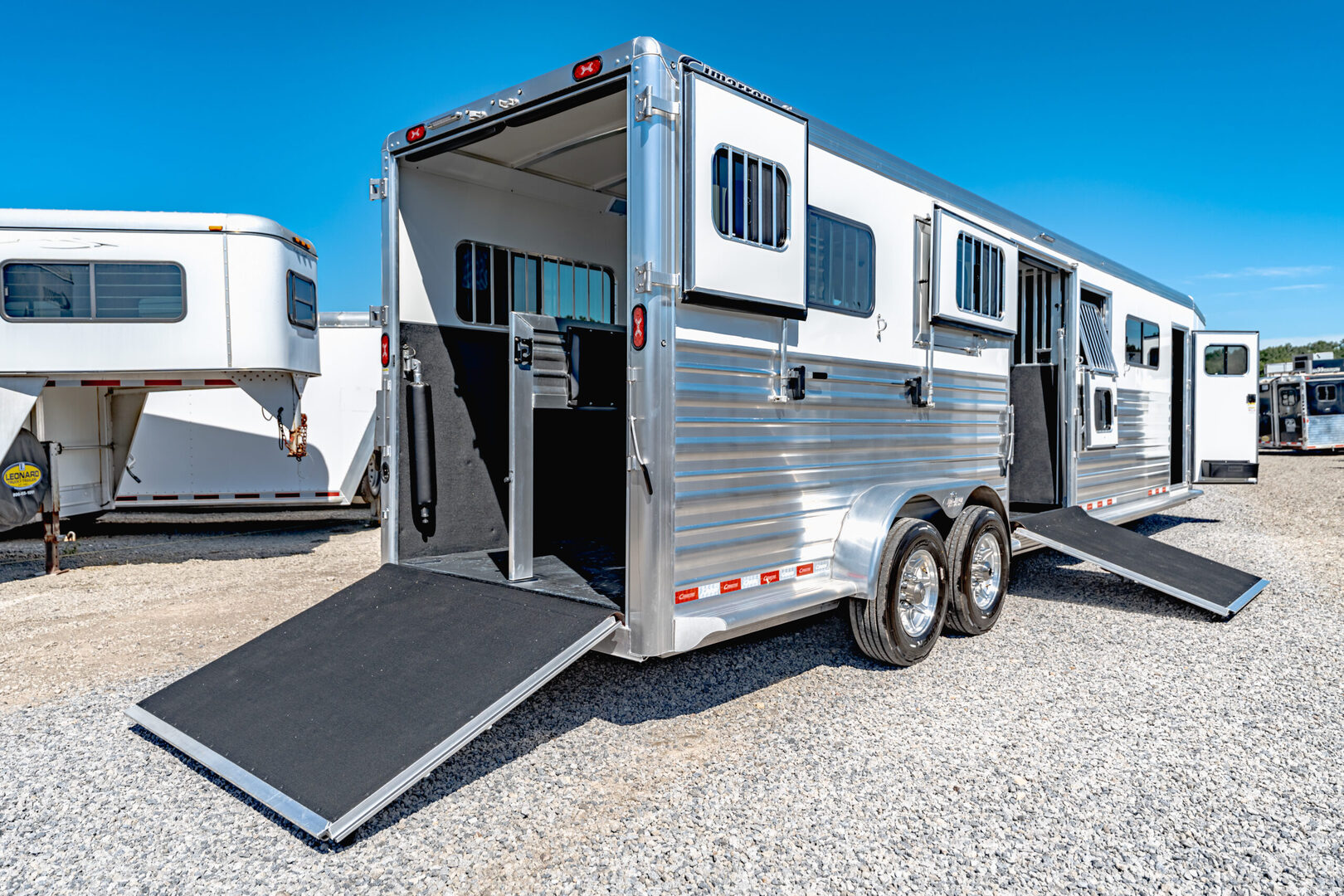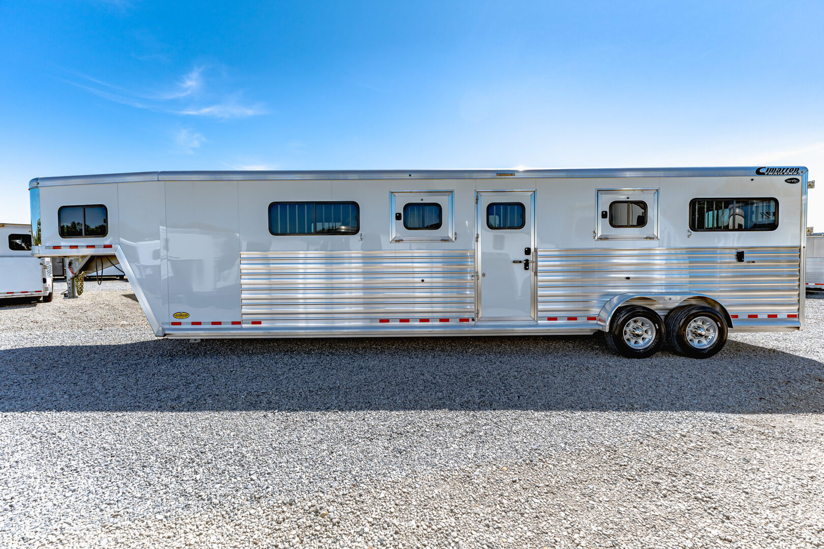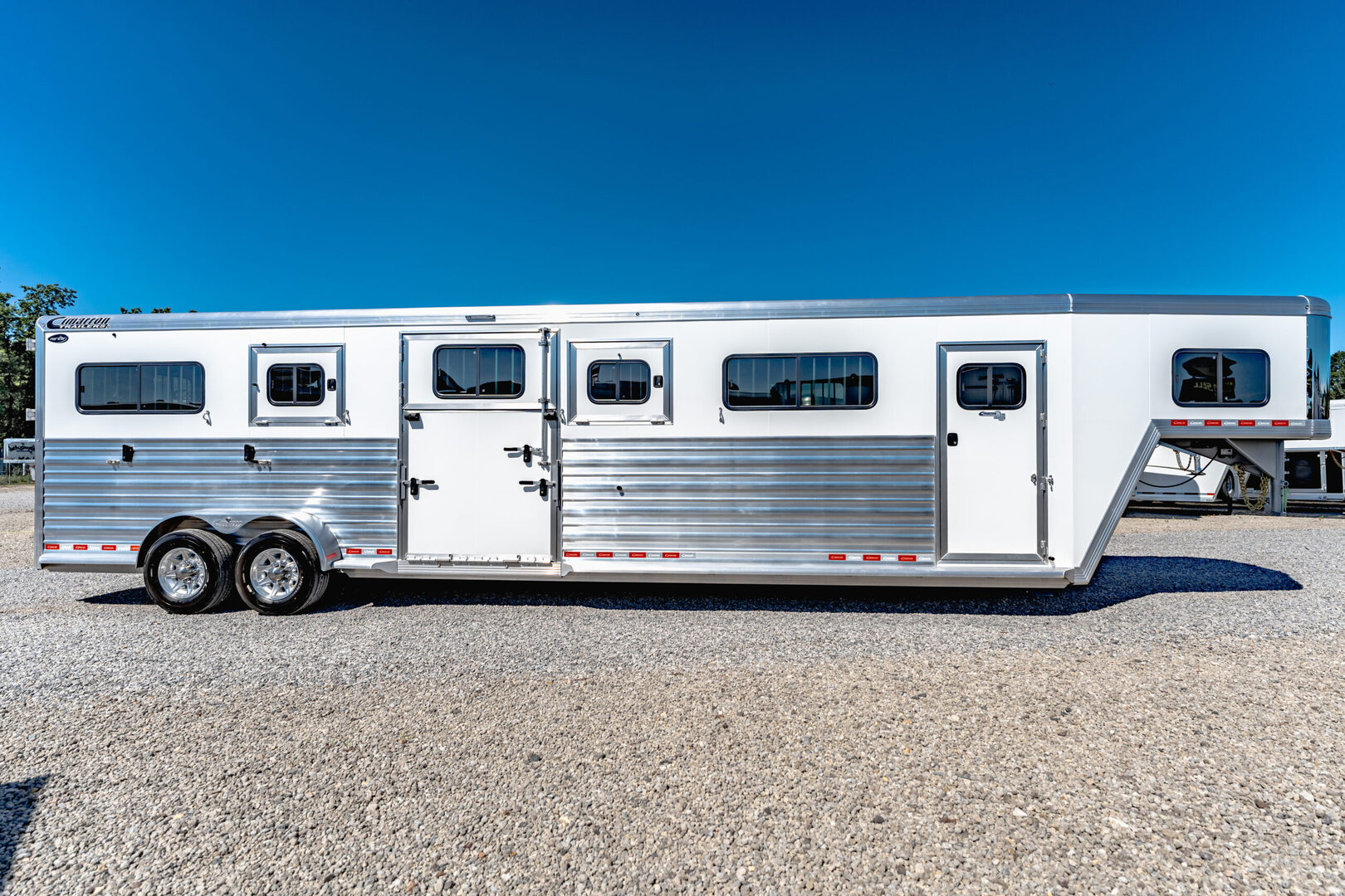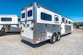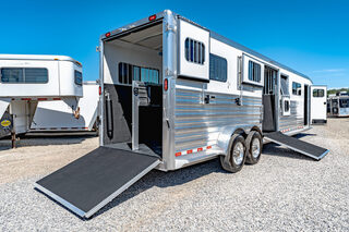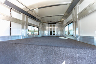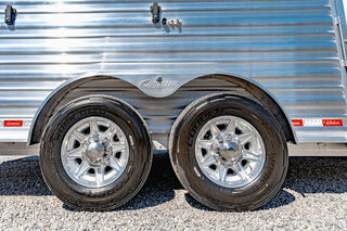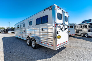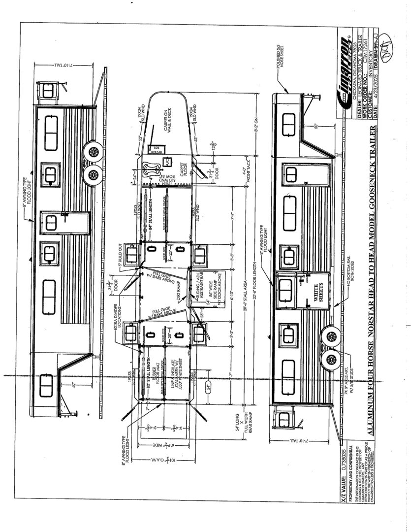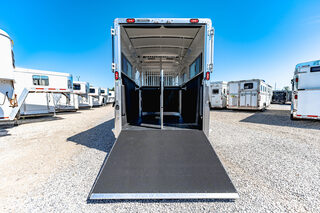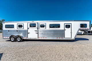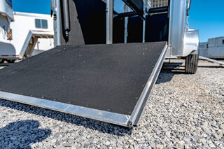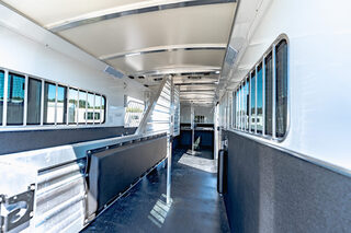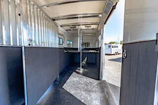 Drive train 7,000# Dexter torsion axles -extruded side slats at stall area, lower body running boards are full length, led awning lights, solid partition wall, full height and width of front tack wall, primary door front tack room door 32’’ wide, carpet floor, GN wall and GN deck, sliding type of windows for front tack, ramp 54’’ tall with swing around doors above in stall area, head side fold down type with safety bars feed doors, full center gate -bars above, ramps side -60’’ wide x54’’ upper door and rest. Strap, 2 partial dividers, swinging solid type for head grills, dome lights, adjustable saddle rack, added recessed paddle latch on side access door, window slider 19x34 in stall area, -in partition wall 54’’ from floor, centered, extra divider location, straight load to move both dividers to LH side wall, use 30’’ bolster pads on butt and breast bars, adjustable fold down bar at side ramp. Call for more details!!