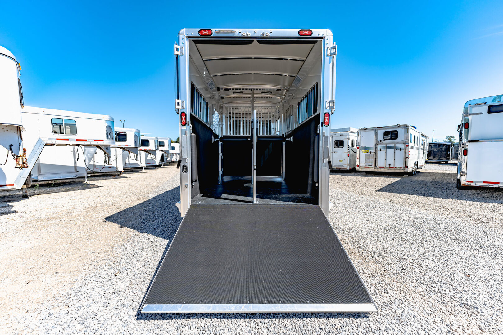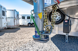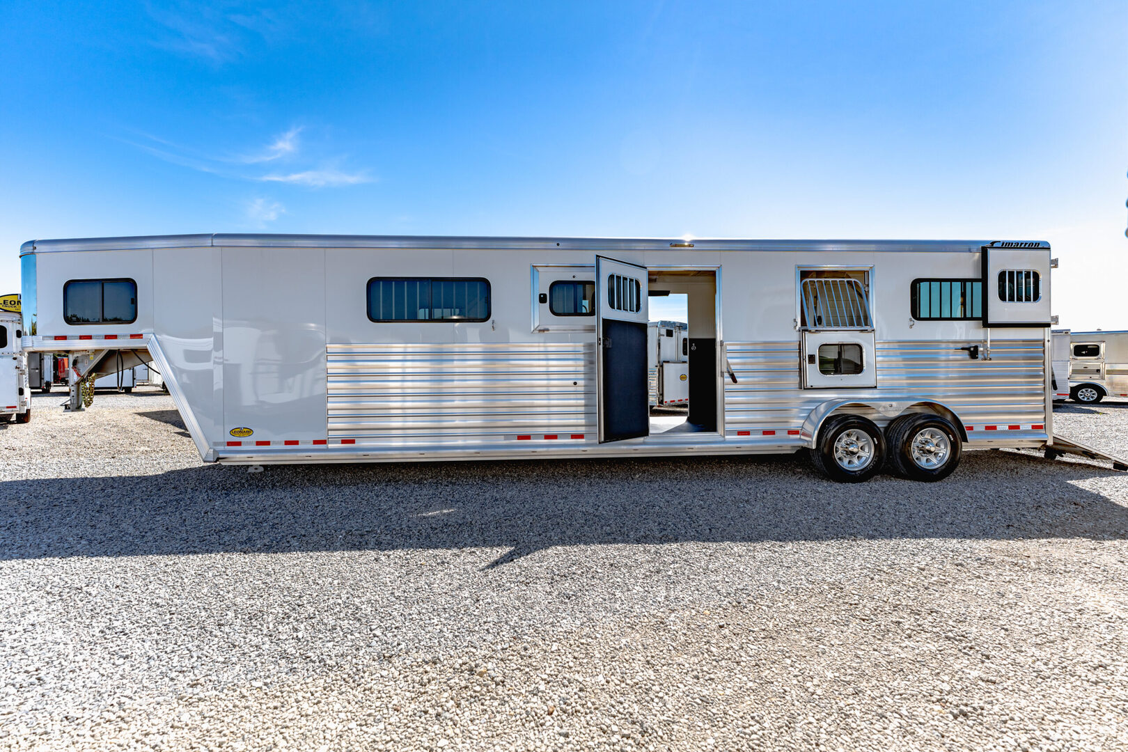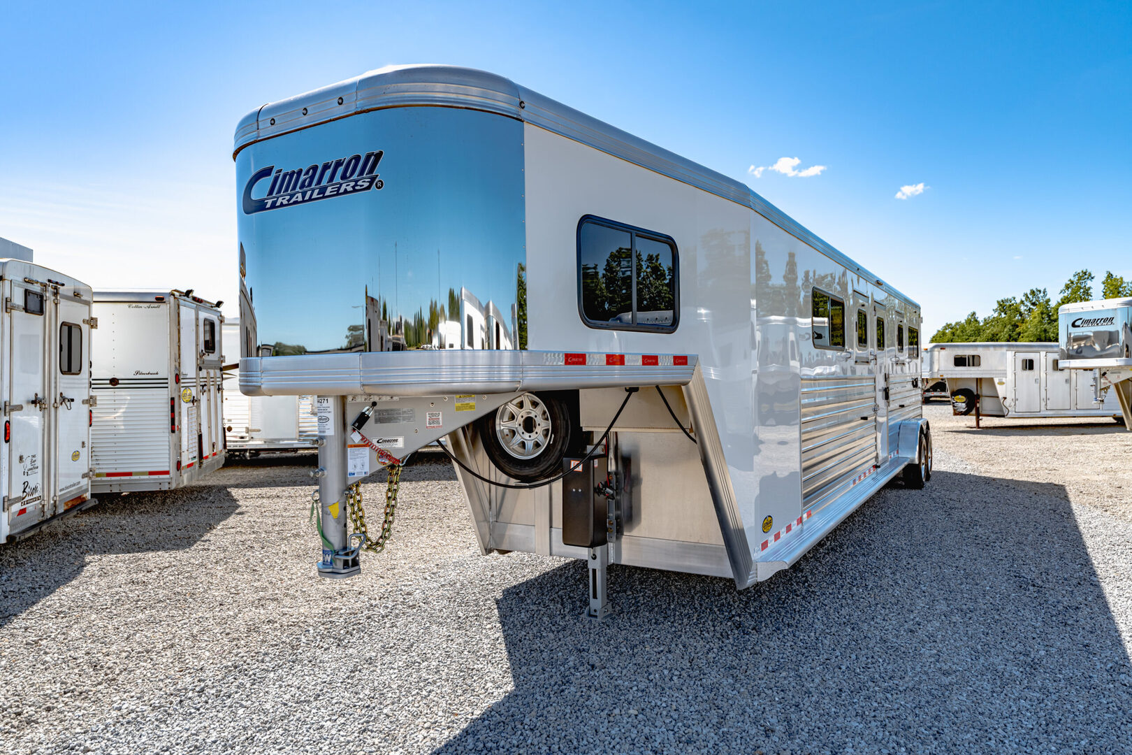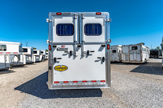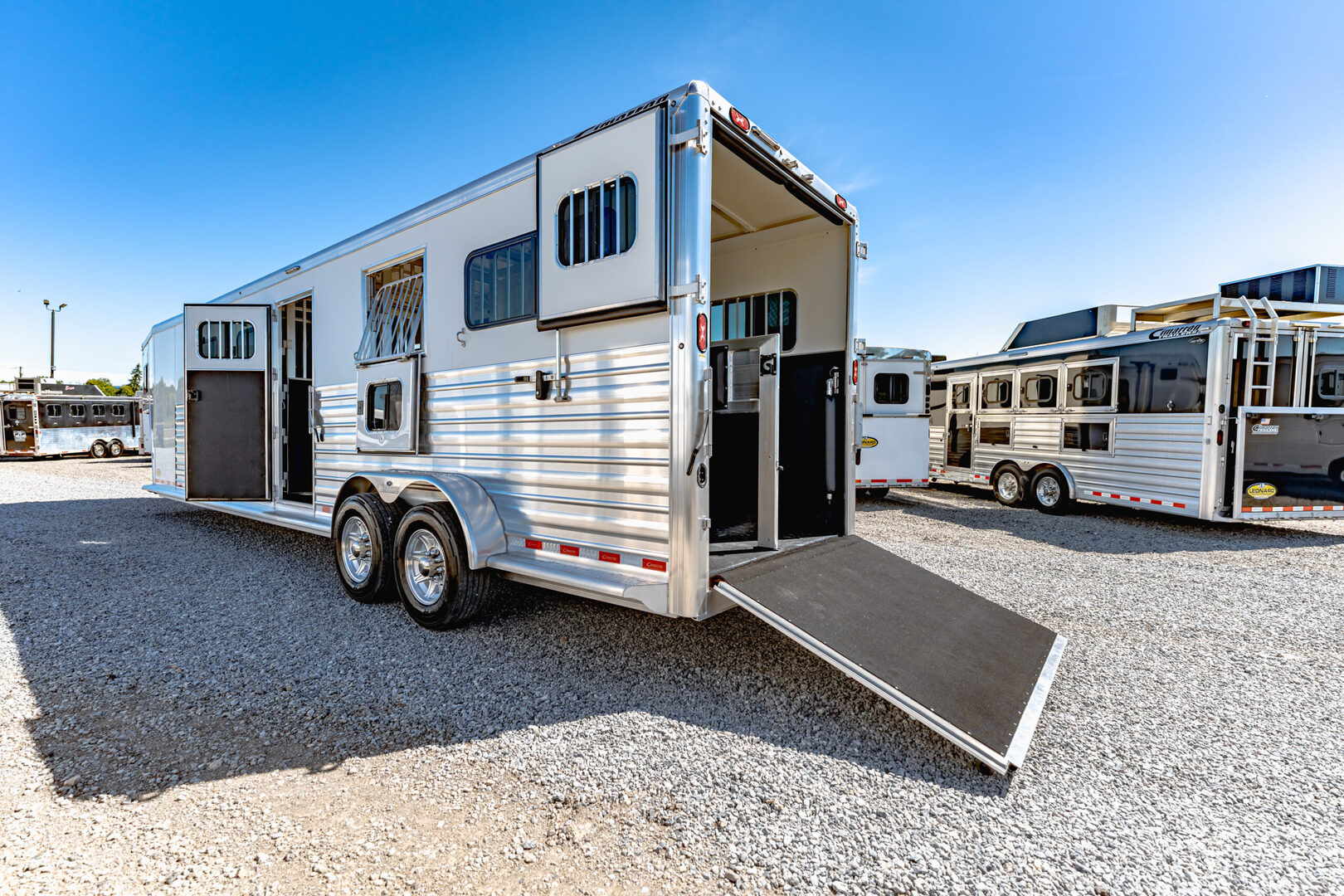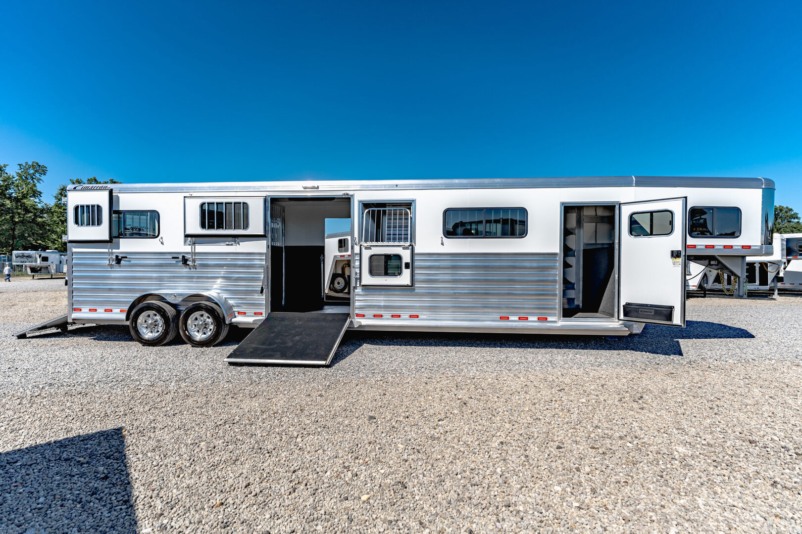 Drive train 7,000# Dexter torsion axles -extruded side slats at stall area, lower body running boards are full length, led awning lights, solid partition wall, full height and width of front tack wall, primary door front tack room door 32’’ wide, carpet floor, GN wall and GN deck, sliding type of windows for front tack, ramp 54’’ tall with swing around doors above in stall area, head side fold down type with safety bars feed doors, full center gate -bars above, ramps side -60’’ wide x54’’ upper door and rest. Strap, 2 partial dividers, swinging solid type for head grills, dome lights, adjustable saddle rack, added recessed paddle latch on side access door, window slider 19x34 in stall area, -in partition wall 54’’ from floor, centered, extra divider location, straight load to move both dividers to LH side wall, use 30’’ bolster pads on butt and breast bars, adjustable fold down bar at side ramp. Call for more details!!