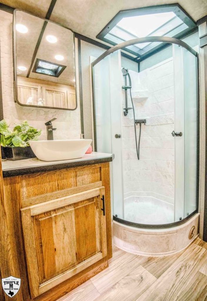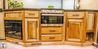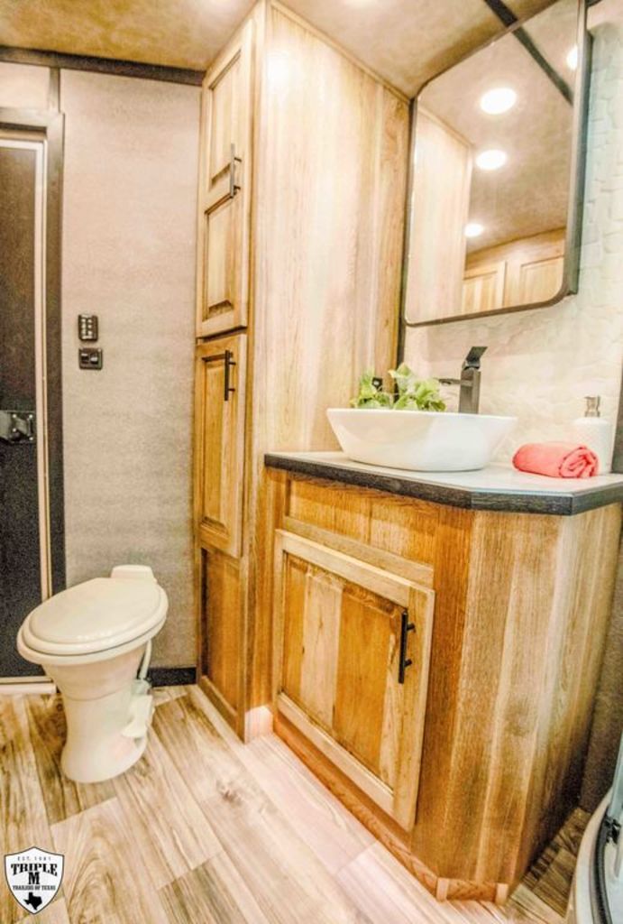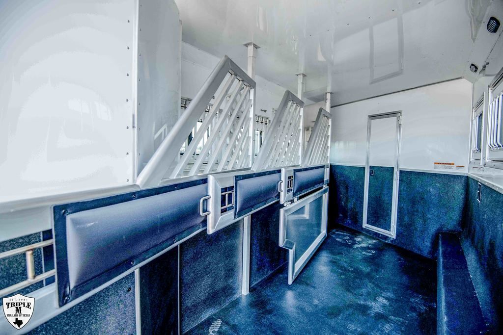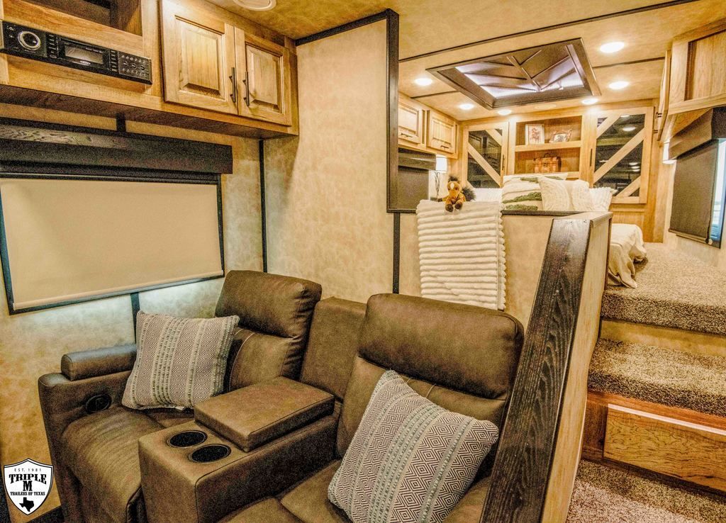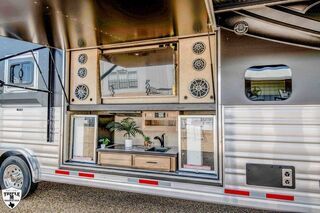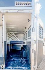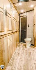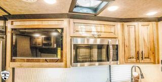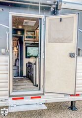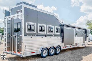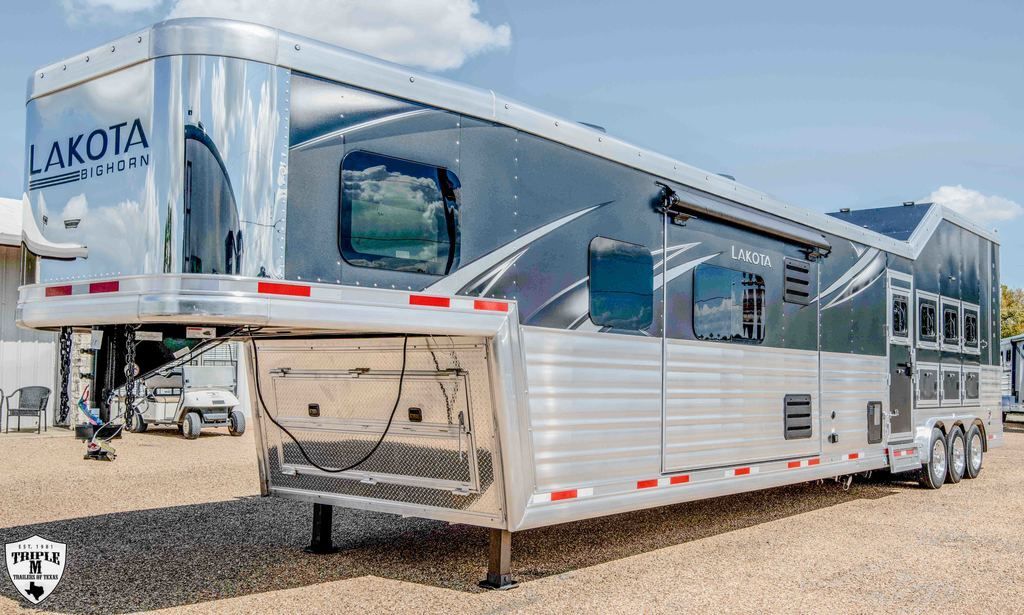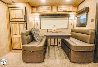 4H OUTDOOR KITCHEN w/ ONAN 5.5 GEN 45’ 7 & 3/4” OVERALL 37’ 6 & 1/2” FLOOR 8’ WIDE / 8.2” TALL OUTDOOR KITCHEN w/ TV, STEREO, SINK, STOVE TOP EXTRA LED LIGHTS, ROPE LIGHTS INTEGRATED HAYPOD w/ GEN RACK 5.5 ONAN GEN (2) AC UNITS w/ 50 AMP SERVICE CUSHION COUPLER 66” ENTERTAINMENT RECLINERS ilo SOFA ON RISER DINETTE IN SLIDE 9’ FLUSH SLIDE OUT SMOKED HICKORY SOFT TOUCH WALLS & CEILING (MEMPIN STRAW) BATH ACCENT SOFT TOUCH (DURKIN CHALK) COUNTER TOPS (ARENITE CREAM) KITCHEN TILE BACK SPLASH (GLAZZIO) BATH TILE BACK SPLASH (PEBBLE) LINOLEUM (VOYAGER fINA) DROP DOWN WINDOWS ON BOTH SIDES DOUBLE HAT RACK 40LB LP TANKS ilo 20LB 50/50 REAR DOORS w/ SWING OUT SADDLE RACK EXTRA CLEARANCE LIGHTS ROPE LIGHTS IN OUTDOOR KITCHEN AREA ROPE LIGHT IN HORSE AREA FULL FRONT RISER WALL (3) 7K AXLES w/ 17.5 G RANGE TIRES ALUMINUM RIMS MATTE BLACK METALLIC EMPTY = 16,770 GVWR = 21,000