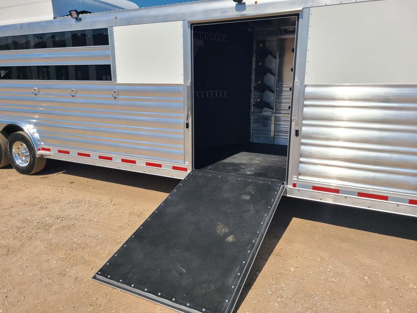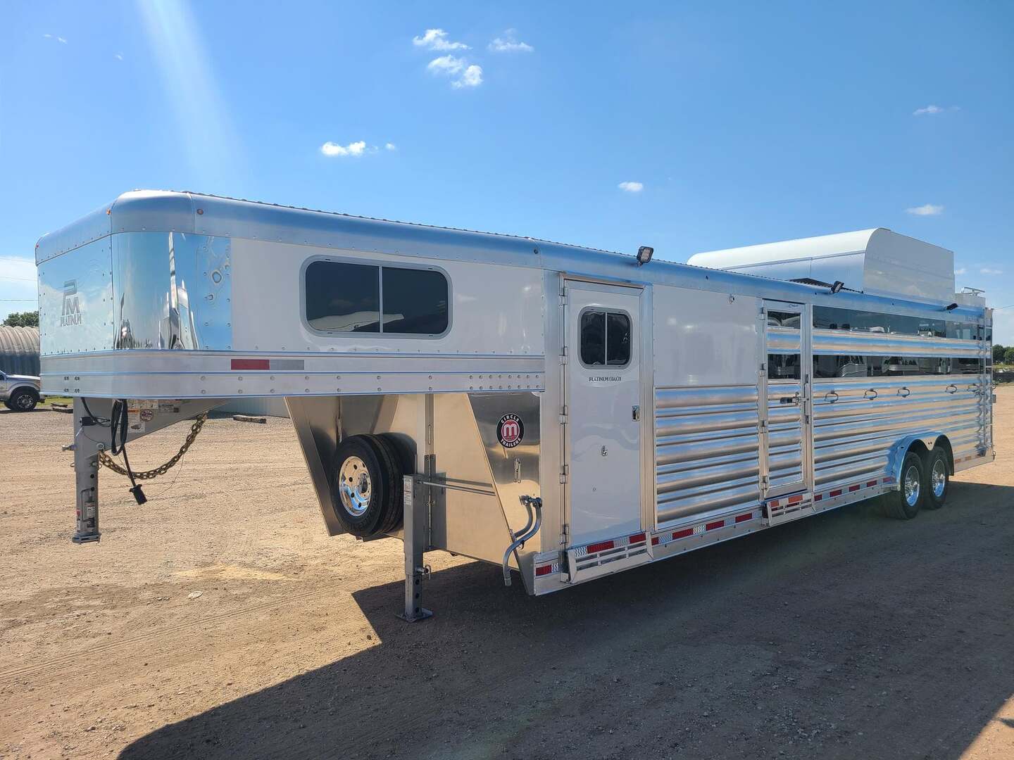 THIS TRAILER IS ON ORDER AND WILL ARRIVE IN MARCH Platinum Coach 32’ Stock Combo 8 x 32 x 7 tall 4’6” straight wall front dressing room Carpeted bulkhead wall in dressing room with 20 hooks Lunar dome roof vent and clothes rod in dressing room Mid tack with 54” on driver side, 102” on curb side Full height spring loaded side ramp to mid tack 8 saddle racks, 8 blanket bars, 20 hooks in mid tack Large shelf over three brush trays in dressing room Three horse dividers, two center gates Baby panel on first divider Remove horse dividers to create 3 box stalls Full width spring loaded rear ramp Double rear doors with anti-rack hardware Rubber on side walls and rear gates to protect from kicks Plexiglas & Track on drive and passenger side Plexiglas storage tray on front of mid tack, above hooks LED Load lights x 7 on outside 7 lights on top rail 8’ hay pod with 4’ landing 5-two way roof vents in horse area 8000# axles with 17.5” Alcoa wheels & 18 ply tires x 5 Axles blocked 2” for additional ground clearance