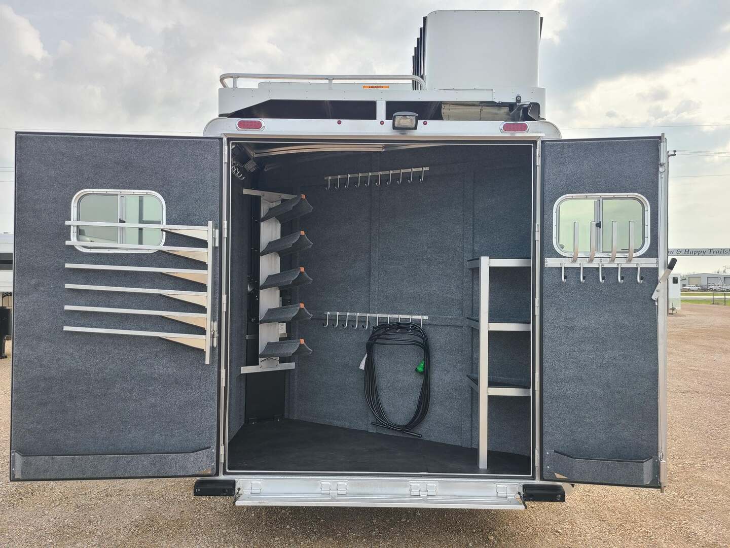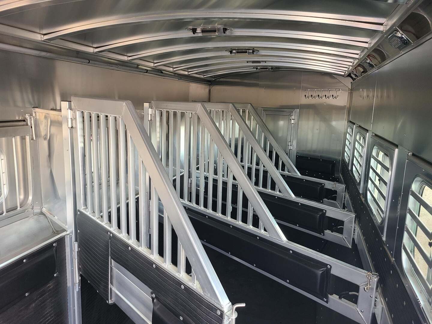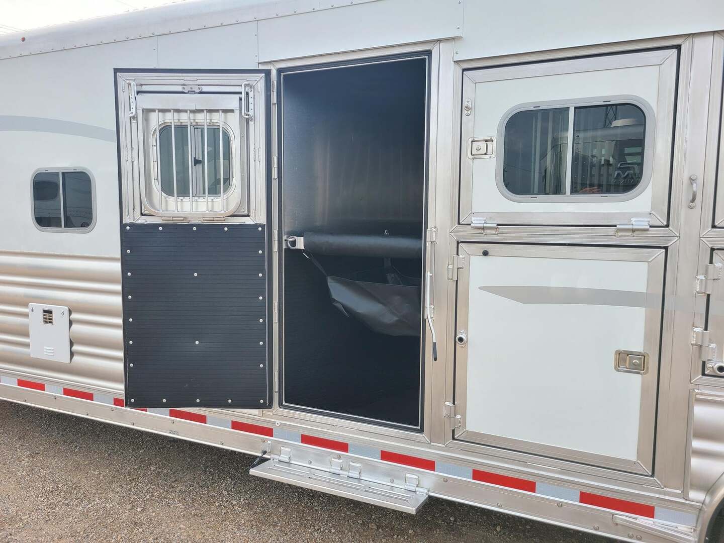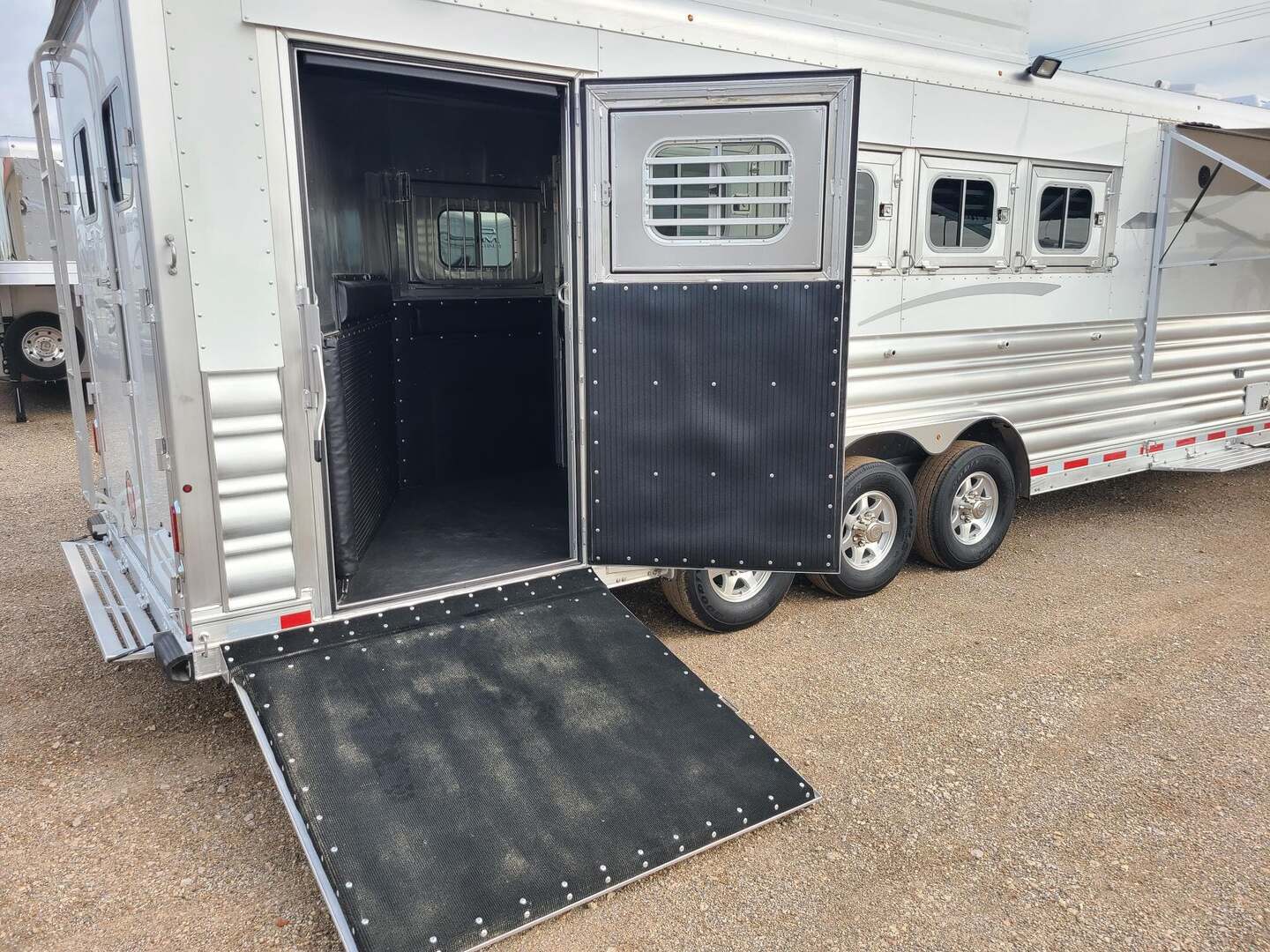 THIS TRAILER IS ON ORDER AND WILL ARRIVE IN MAY Platinum Coach 5 horse with 12’10” Proline XP by Outlaw Conversion  Proline XP by Outlaw Conversion features: Onan 4.0 generator with fuel tank behind saddle rack Flip down bunk over sofa, with corner bench...sleep 4 or 5! Two burner glass top cooktop Microwave with built-in vent hood Sinks in kitchen and bath 15,000 BTU A/C with HEAT PUMP 20,000 BTU furnace 6.0 propane / electric refrigerator 6 gallon water heater, 12V DC or 110V AC 60 gallon water tank Two 24” Smart TV’s one in living, one bed area AM/FM/CD/DVD player with 2 exterior speakers 14’ Dometic power awning with aluma guard cover 32” radius shower with power vent overhead Toilet in front of vanity / sink area Large closets in living and bath area 3 drawers under kitchen counter Two hat racks over door with sliding screen 24” walk through door to horse compartment Dual leg hydraulic jacks Double aluminum battery box Two 30# propane bottles Platinum Coach features: 8 x 35 x 8 tall Side load configuration LOADED rear tack, shelves, splint boots, EVERYTHING!! 4 mangers, escape door on first stall Drop down windows head and hip Drop down window bars on head side Flow through and spring-back dividers Stud divider on first stall 8’ enclosed hay pod  Three 8k axles, 14 ply tires, Aluminum wheels