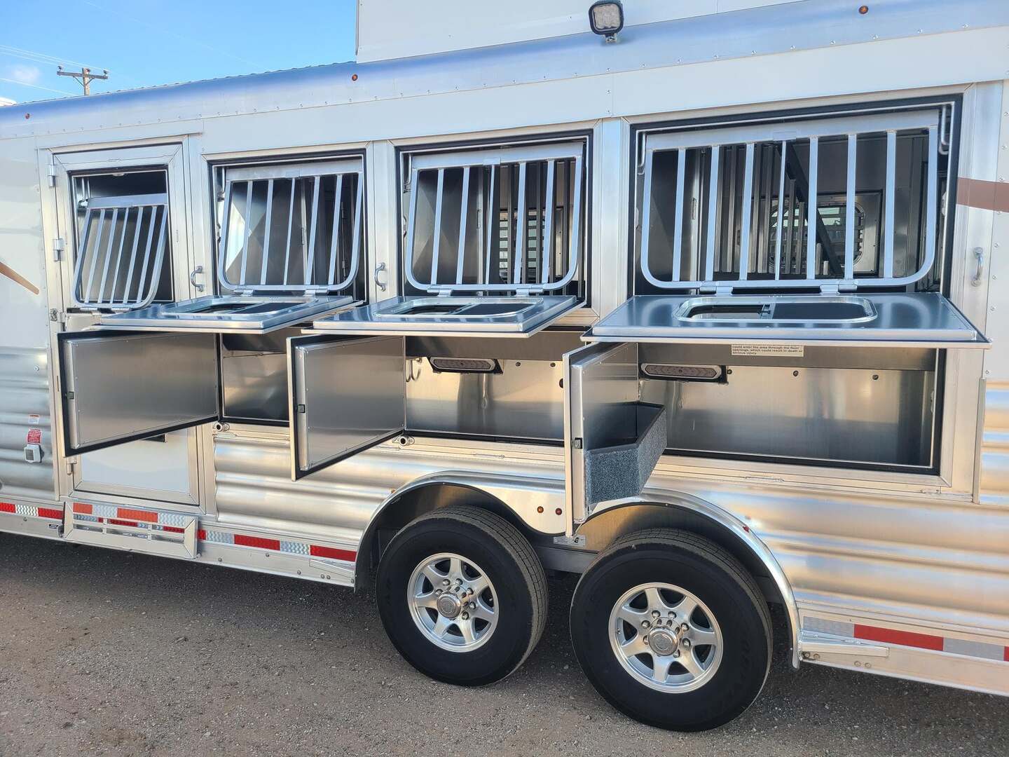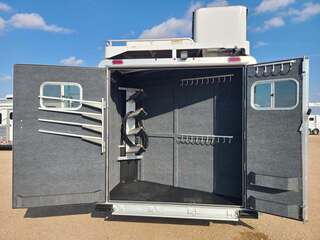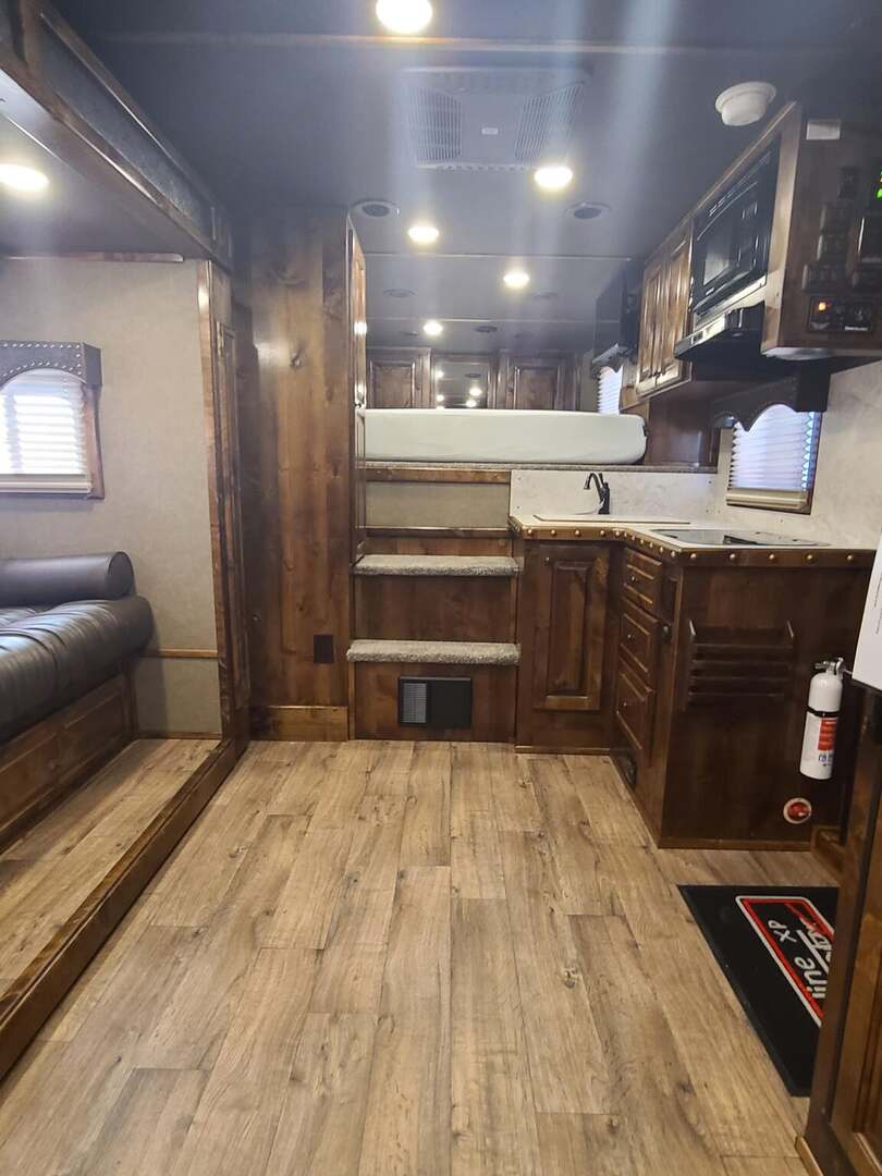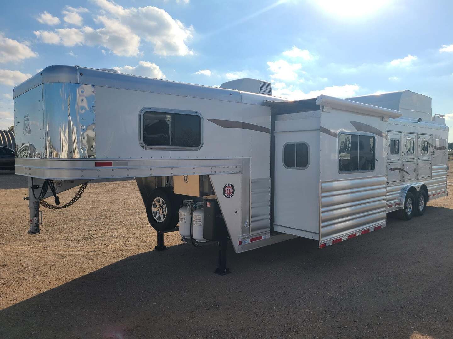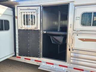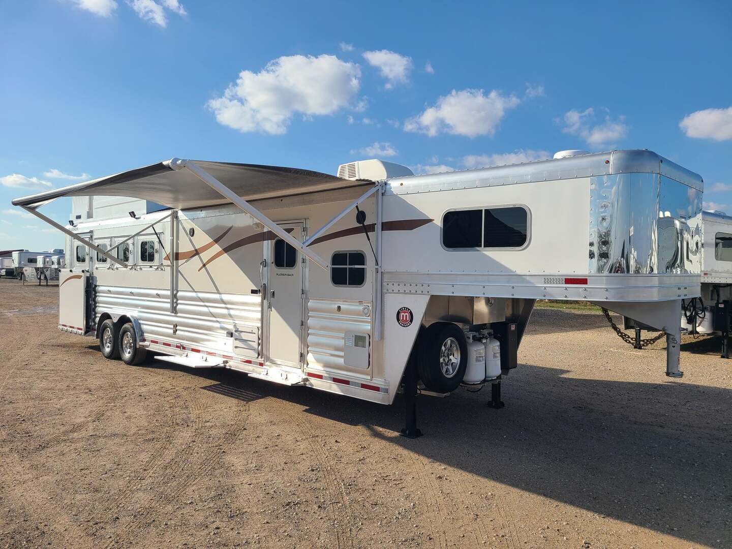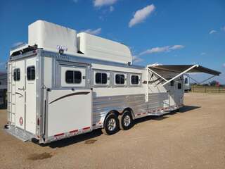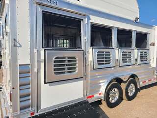 THIS TRAILER IS ON ORDER AND WILL ARRIVE IN JULY Platinum Coach 4 horse 12’8” Side Load with Slide Out Outlaw Conversions Select Series features: Onan 4.0 MicroQuiet generator Power Dometic awning over LQ  Dark Knotty Alder wood interior 72” Sofa sleeper with custom leather accent 15,000 BTU A/C with heat strip 20,000 BTU propane furnace 7.0 propane / electric refrigerator 6 gallon propane / electric water heater 2-30# propane bottles TWO TV’s, one 24” in bed, one 24” in living AM/FM/CD/DVD player with 2 exterior speakers Double hat racks over sliding screen Flip down bench on outside Double sink in kitchen with covers Two burner cooktop under CONVECTION oven with vent hood 32” radius shower next to LARGE double rod closet Vanity sink with toilet in front Pocket door separating LQ from horse area 24” walk through door to horse compartment Platinum Coach features: 8 x 32 x 7’6 tall 6’ slide out for MASSIVE amounts of room in LQ Side load configuration....pack all your things! 8,000# axles, blocked 2” for more clearance 14 Ply Goodyear G-614 tires on aluminum wheels 6’ enclosed hay pod in front of generator box on landing 3 mangers, escape door on first stall Drop down windows on head and hip Drop down window bars on head side Stud divider on first stall Flow-through and spring-back dividers Dual leg hydraulic jack Double aluminum battery box Round LED clearance lights LED load lights