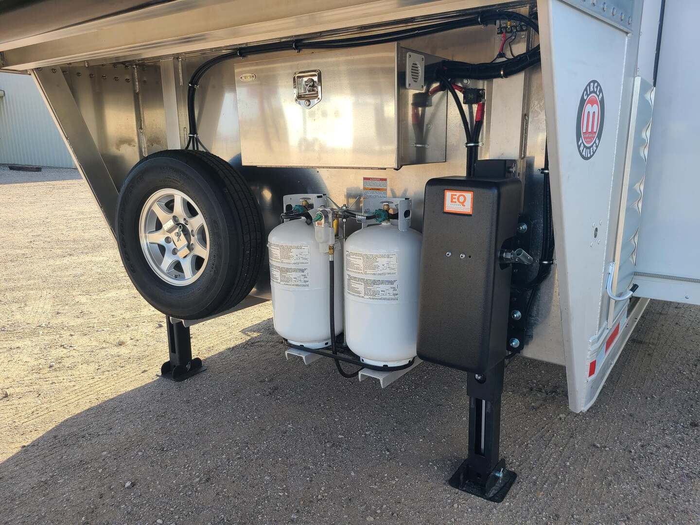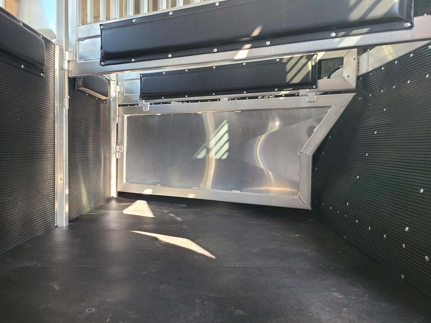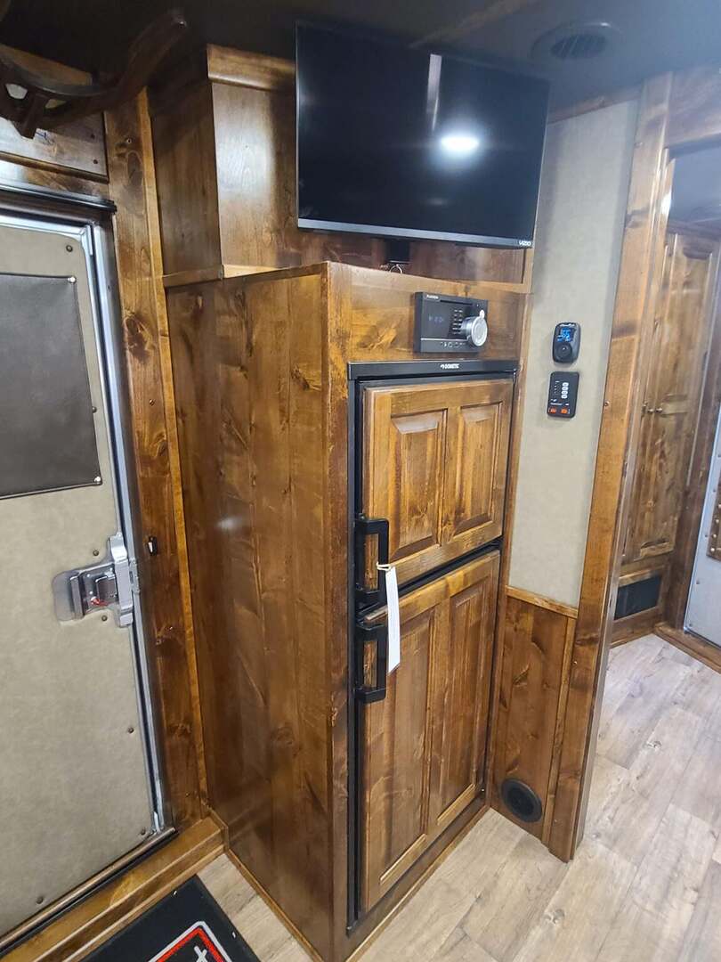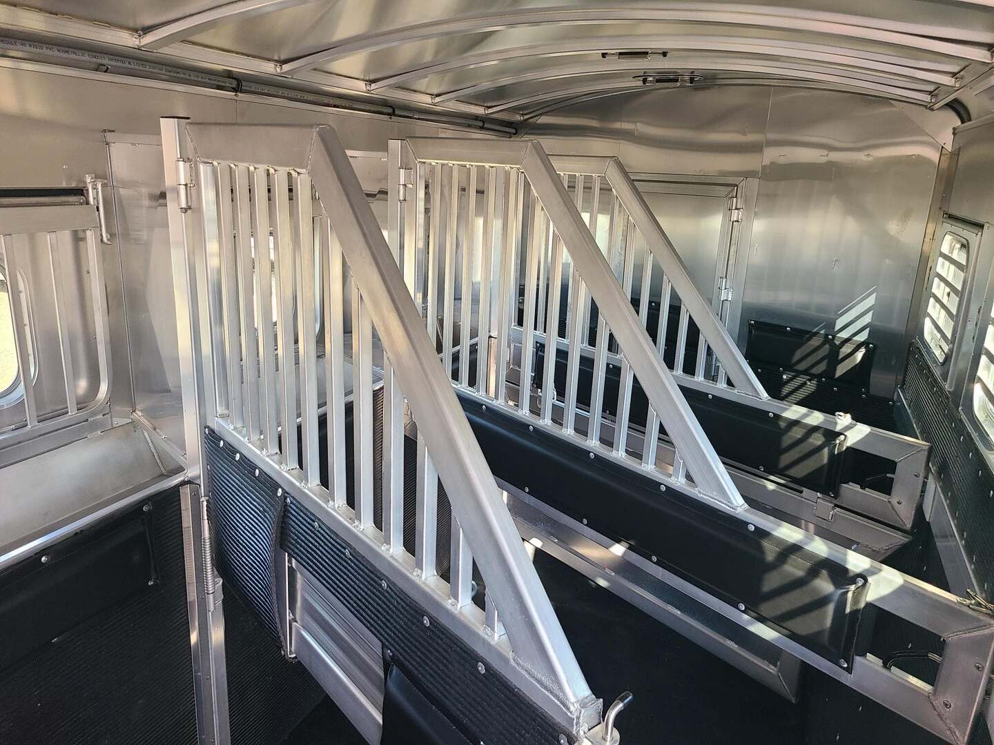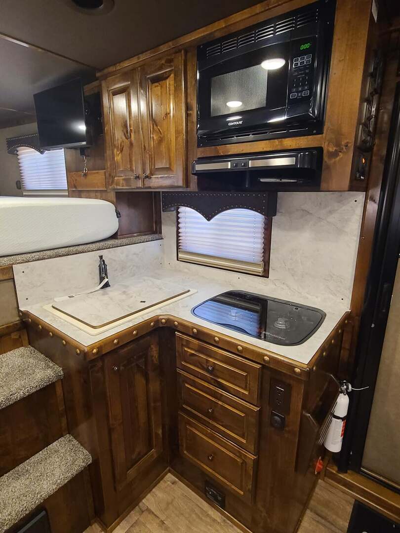 THIS TRAILER IS ON ORDER AND WILL ARRIVE IN JULY Platinum Coach 4 horse 12’8” Side Load with Slide Out Outlaw Conversions Select Series features: Onan 4.0 MicroQuiet generator Power Dometic awning over LQ  Dark Knotty Alder wood interior 72” Sofa sleeper with custom leather accent 15,000 BTU A/C with heat strip 20,000 BTU propane furnace 7.0 propane / electric refrigerator 6 gallon propane / electric water heater 2-30# propane bottles TWO TV’s, one 24” in bed, one 24” in living AM/FM/CD/DVD player with 2 exterior speakers Double hat racks over sliding screen Flip down bench on outside Double sink in kitchen with covers Two burner cooktop under CONVECTION oven with vent hood 32” radius shower next to LARGE double rod closet Vanity sink with toilet in front Pocket door separating LQ from horse area 24” walk through door to horse compartment Platinum Coach features: 8 x 32 x 7’6 tall 6’ slide out for MASSIVE amounts of room in LQ Side load configuration....pack all your things! 8,000# axles, blocked 2” for more clearance 14 Ply Goodyear G-614 tires on aluminum wheels 6’ enclosed hay pod in front of generator box on landing 3 mangers, escape door on first stall Drop down windows on head and hip Drop down window bars on head side Stud divider on first stall Flow-through and spring-back dividers Dual leg hydraulic jack Double aluminum battery box Round LED clearance lights LED load lights