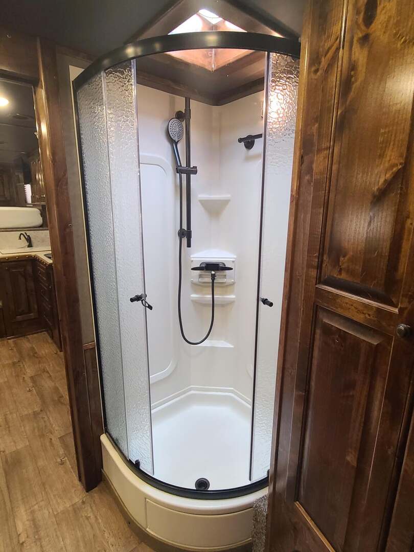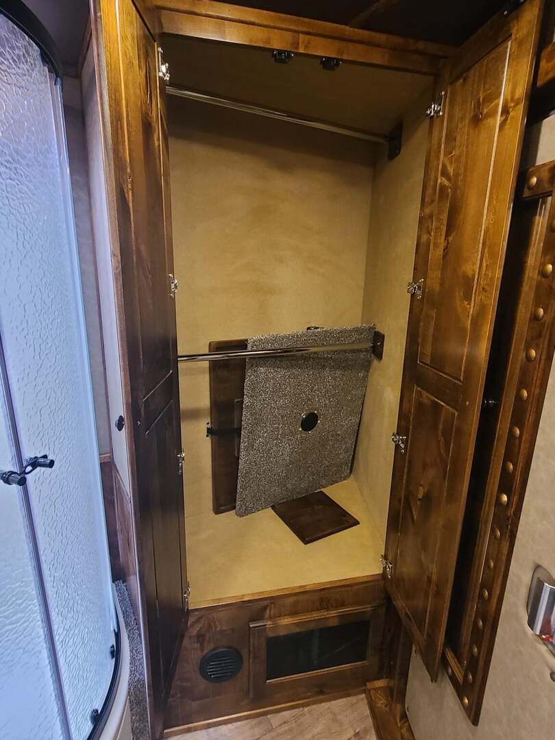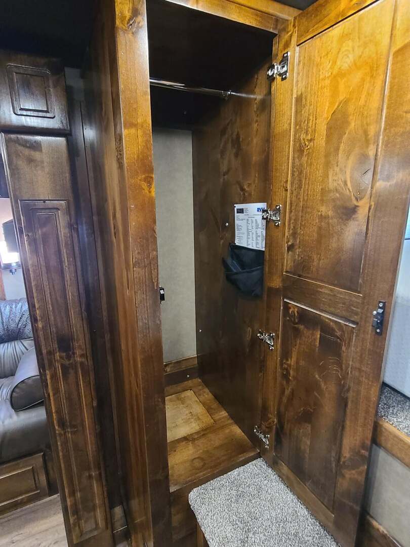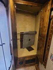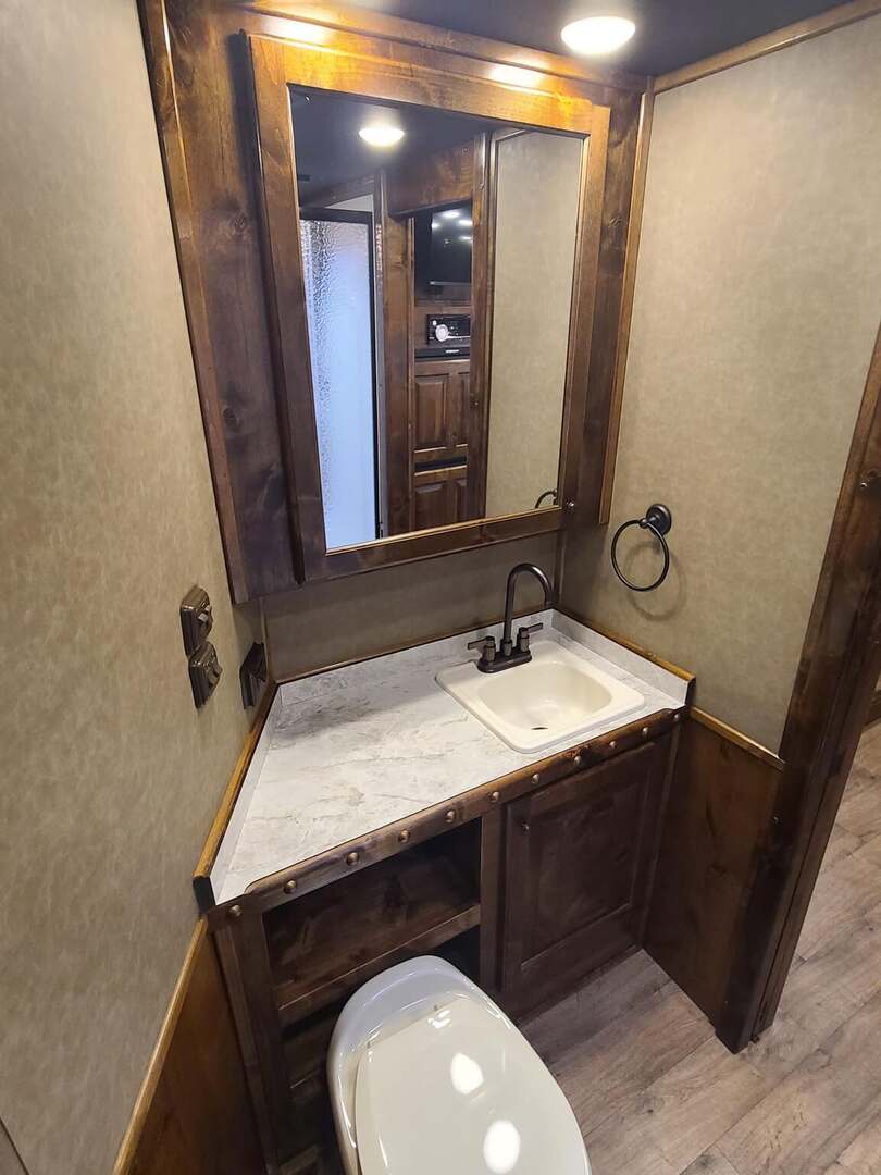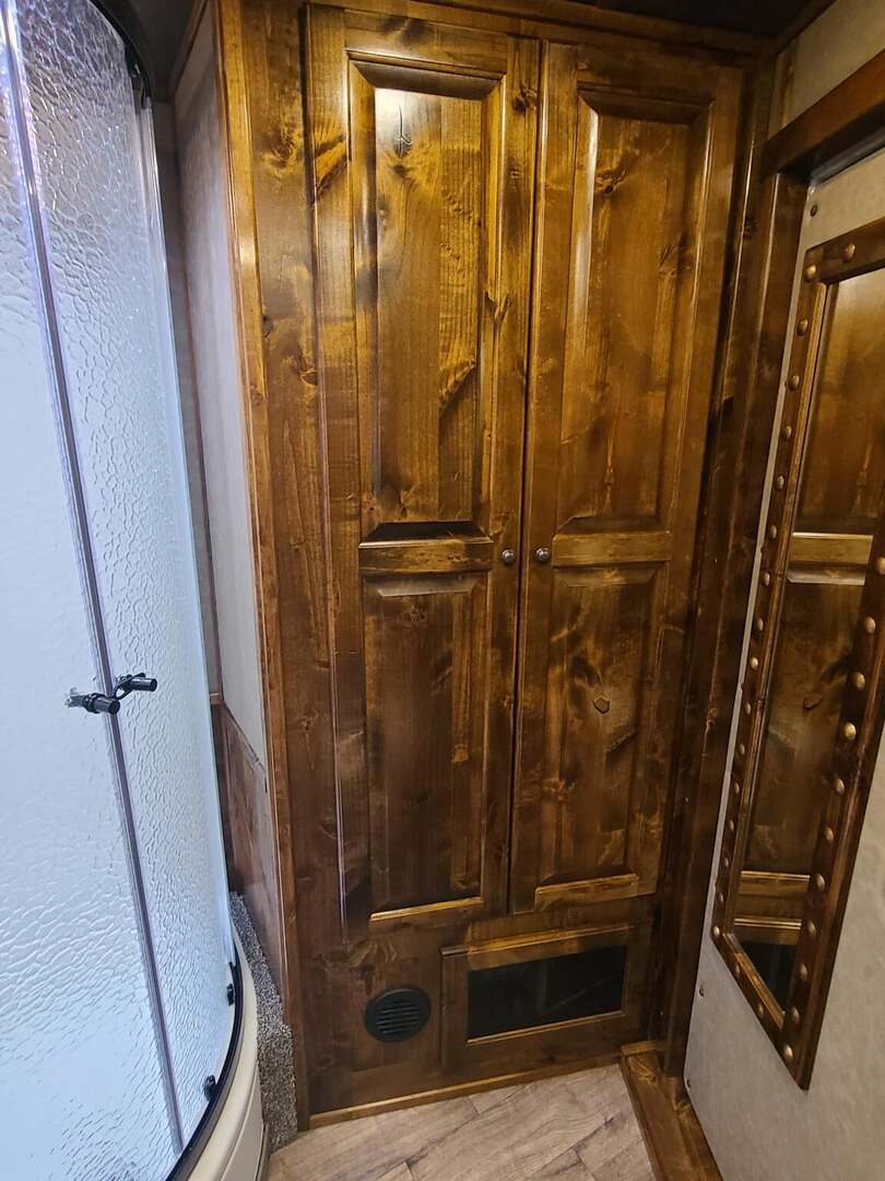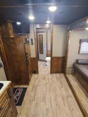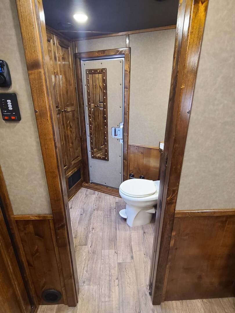 THIS TRAILER IS ON ORDER AND WILL ARRIVE IN JULY Platinum Coach 4 horse 12’8” Side Load with Slide Out Outlaw Conversions Select Series features: Onan 4.0 MicroQuiet generator Power Dometic awning over LQ  Dark Knotty Alder wood interior 72” Sofa sleeper with custom leather accent 15,000 BTU A/C with heat strip 20,000 BTU propane furnace 7.0 propane / electric refrigerator 6 gallon propane / electric water heater 2-30# propane bottles TWO TV’s, one 24” in bed, one 24” in living AM/FM/CD/DVD player with 2 exterior speakers Double hat racks over sliding screen Flip down bench on outside Double sink in kitchen with covers Two burner cooktop under CONVECTION oven with vent hood 32” radius shower next to LARGE double rod closet Vanity sink with toilet in front Pocket door separating LQ from horse area 24” walk through door to horse compartment Platinum Coach features: 8 x 32 x 7’6 tall 6’ slide out for MASSIVE amounts of room in LQ Side load configuration....pack all your things! 8,000# axles, blocked 2” for more clearance 14 Ply Goodyear G-614 tires on aluminum wheels 6’ enclosed hay pod in front of generator box on landing 3 mangers, escape door on first stall Drop down windows on head and hip Drop down window bars on head side Stud divider on first stall Flow-through and spring-back dividers Dual leg hydraulic jack Double aluminum battery box Round LED clearance lights LED load lights