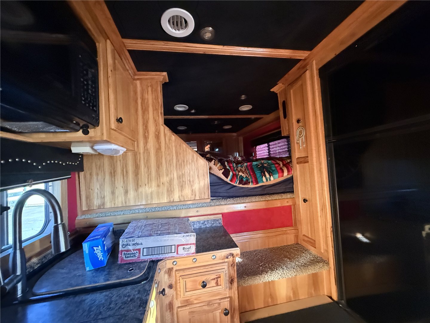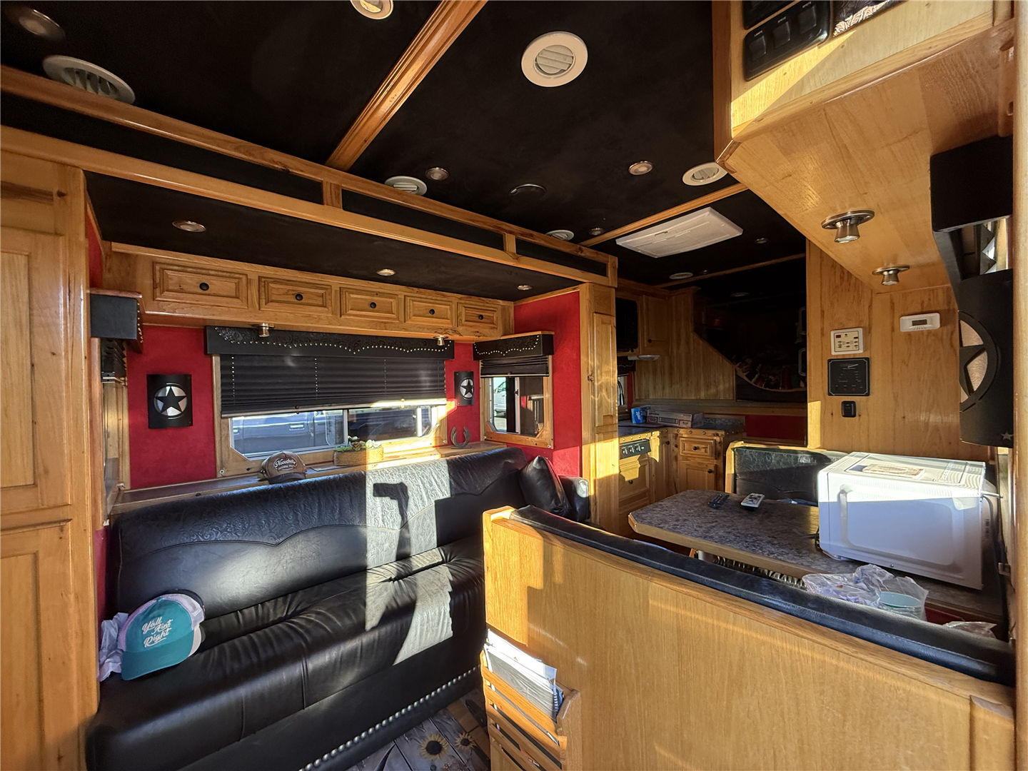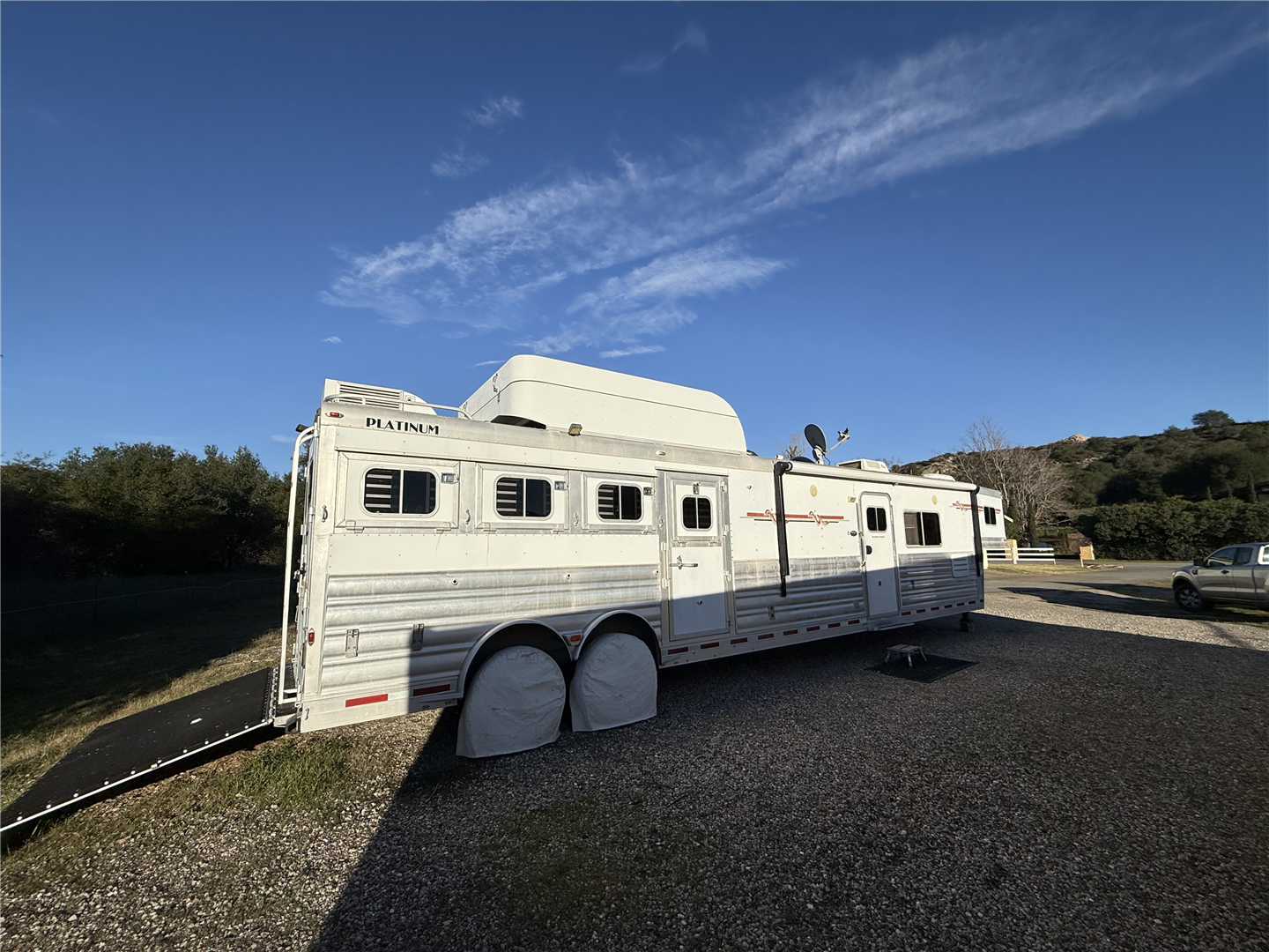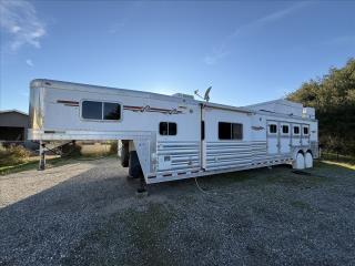 2007 Custom-built, 4 horse, Platinum trailer! Comes with a 19’ short wall LQ. 7’ slide with sofa sleeper. 8.0 refrigerator, 3 burner cook top, convection/microwave. Onan generator with in house on/off switch, TV, radio, double propane, dual hydraulic jacks, enclosed hay pod, two tanks, 60 gallons of water capacity, bridle racks, saddle rack and saddle pad bars, outside and inside lights, ramp for loading. Overall trailer length is 48’6”. Call or text for more additional information.