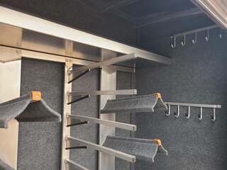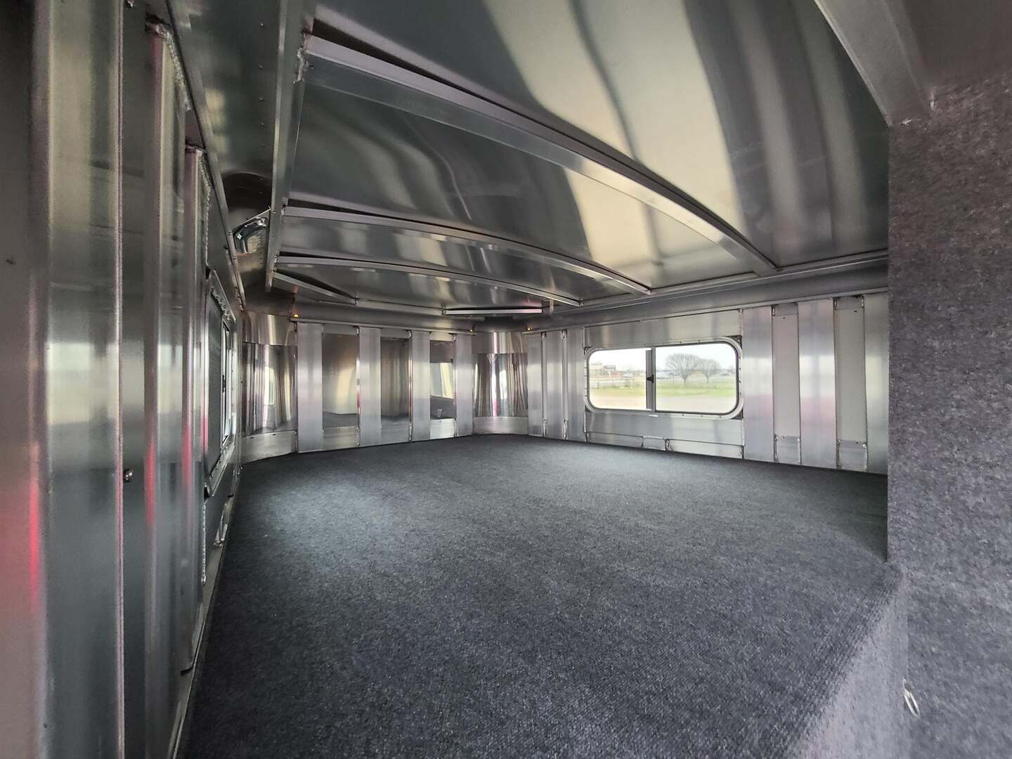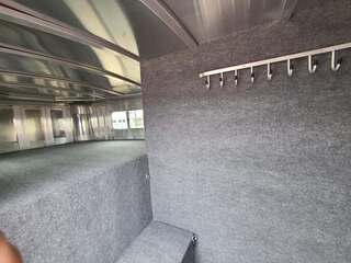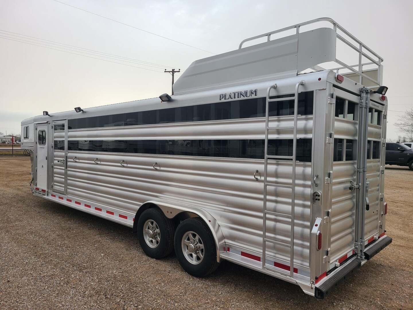 THIS TRAILER IS ON ORDER AND WILL ARRIVE IN APRIL Platinum Coach 6 horse Perfect Trainer / Side Tack!! 7’6” wide x 27’ long x 7 tall Side tack with 6 saddles, 6 bars, 4 brush trays, 30 bridle hooks!!!! Dressing room with boot box, carpet on walls, and hooks on slant wall Clothes rod in dressing room nose area, curb side Full width shelf above saddle racks & blanket bars Plexiglas & Track on driver and passenger side, not rear gates Flow through dividers and stud divider with rubber on first divider Glued stall mats on driver and passenger side Break divider on last stall, allows divider to fully open when rear gates are closed 6 two-way roof vents in horse compartment...MAX AIR FLOW!! Flow through steps for side tack and dressing room 6’ hay rack 7 lights on top rail 7 halogen load lights 7200# axles & 14 ply tires Aluminum 16” wheels Stainless Steel on Nose White Exterior Skin