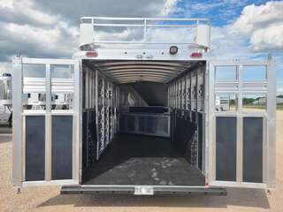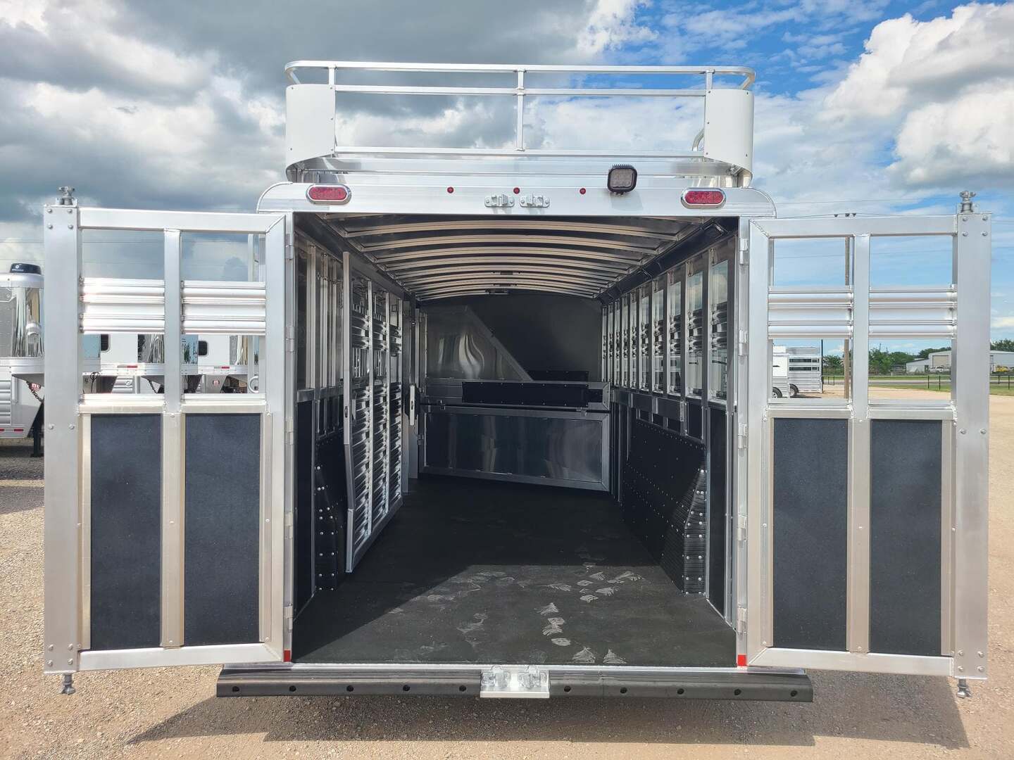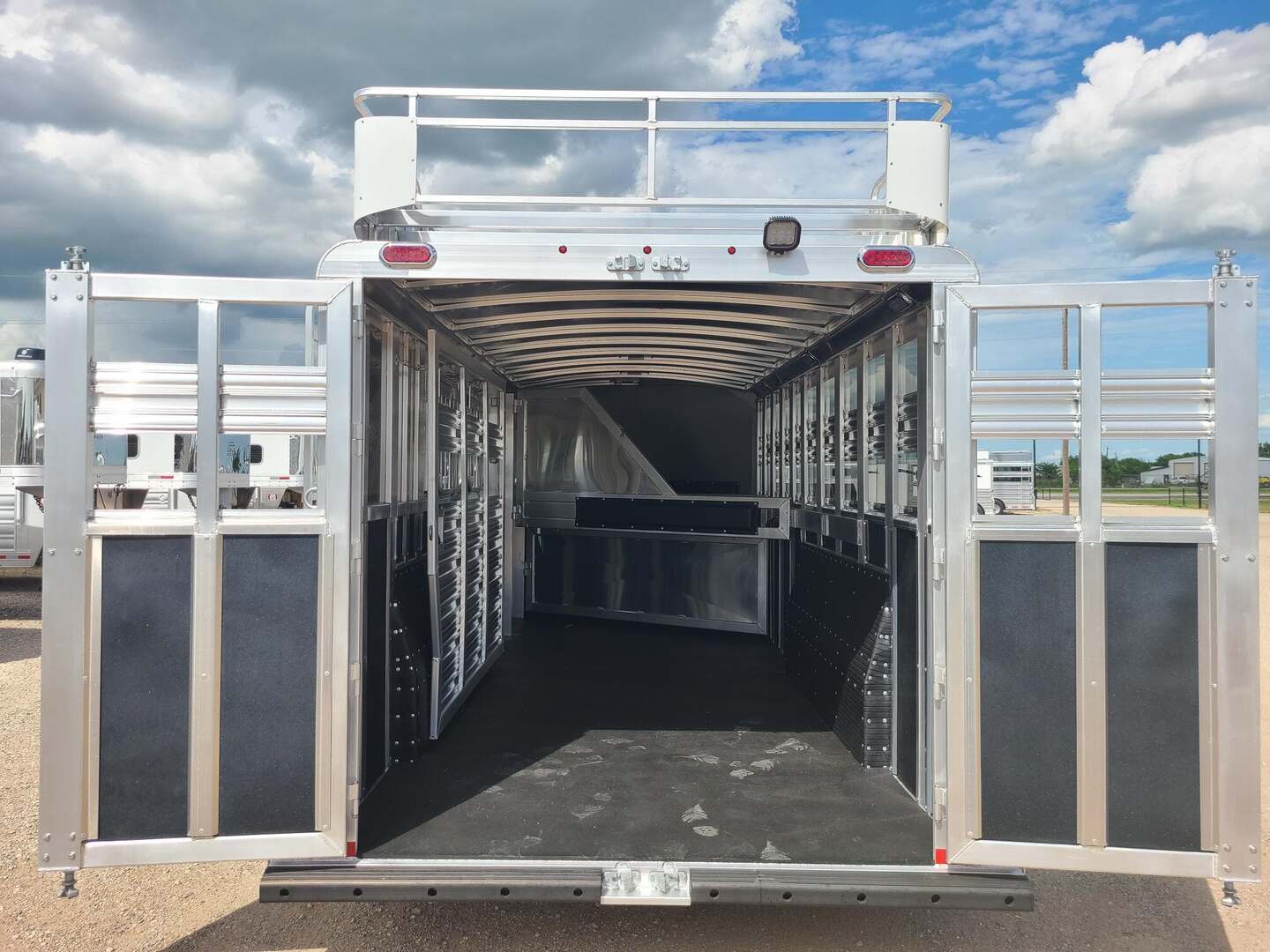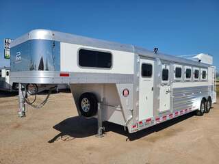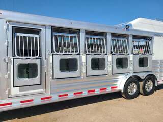 THIS TRAILER IS ON ORDER AND WILL ARRIVE IN APRIL Platinum Coach  4 or 5 horse Perfect Trainer / Side Tack!! 7’6” wide x 25’ long x 7 tall Side tack with 6 saddles, 6 bars, 4 brush trays, 30 bridle hooks!!!! Dressing room with boot box, carpet on walls, and hooks on center wall Clothes rod in dressing room nose area, curb side Full width shelf above saddle racks & blanket bars Drop down windows on head side, Plexiglas & track on rump wall Horse divider in first stall with removable baby panel Horse divider on second stall Center gate on third section...haul three behind center gate Glued stall mats on driver and passenger side 3 two-way roof vents in horse compartment...MAX AIR FLOW!! Flow through steps for side tack and dressing room 6’ hay rack 7 round LED clearance lights on top rail 5 LED load lights 7000# axles & 10 ply tires Aluminum 16” wheels Stainless Steel on Nose White Exterior Skin
