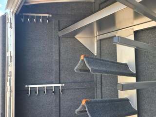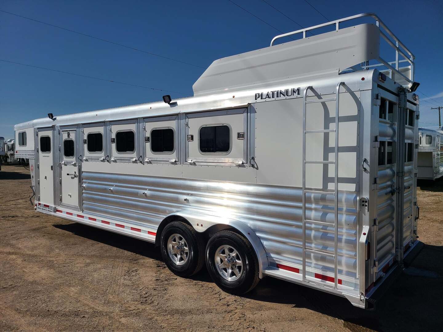 THIS TRAILER IS ON ORDER AND WILL ARRIVE IN APRIL Platinum Coach  4 or 5 horse Perfect Trainer / Side Tack!! 7’6” wide x 25’ long x 7 tall Side tack with 6 saddles, 6 bars, 4 brush trays, 30 bridle hooks!!!! Dressing room with boot box, carpet on walls, and hooks on center wall Clothes rod in dressing room nose area, curb side Full width shelf above saddle racks & blanket bars Drop down windows on head side, Plexiglas & track on rump wall Horse divider in first stall with removable baby panel Horse divider on second stall Center gate on third section...haul three behind center gate Glued stall mats on driver and passenger side 3 two-way roof vents in horse compartment...MAX AIR FLOW!! Flow through steps for side tack and dressing room 6’ hay rack 7 round LED clearance lights on top rail 5 LED load lights 7000# axles & 10 ply tires Aluminum 16” wheels Stainless Steel on Nose White Exterior Skin
