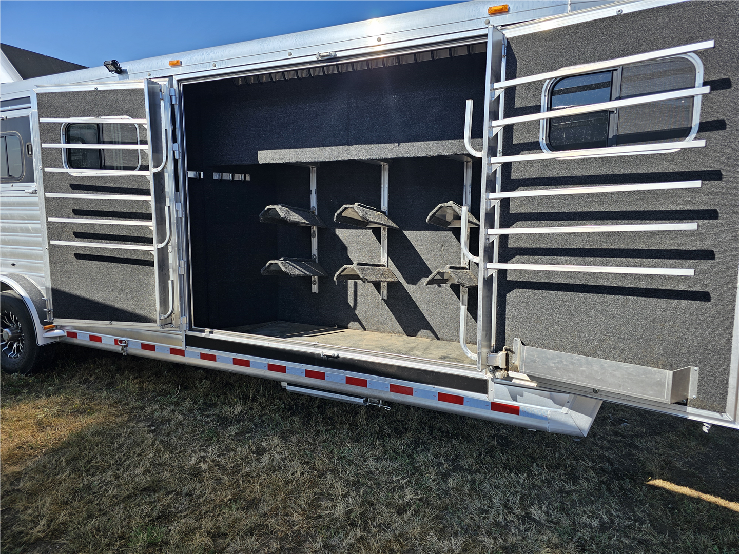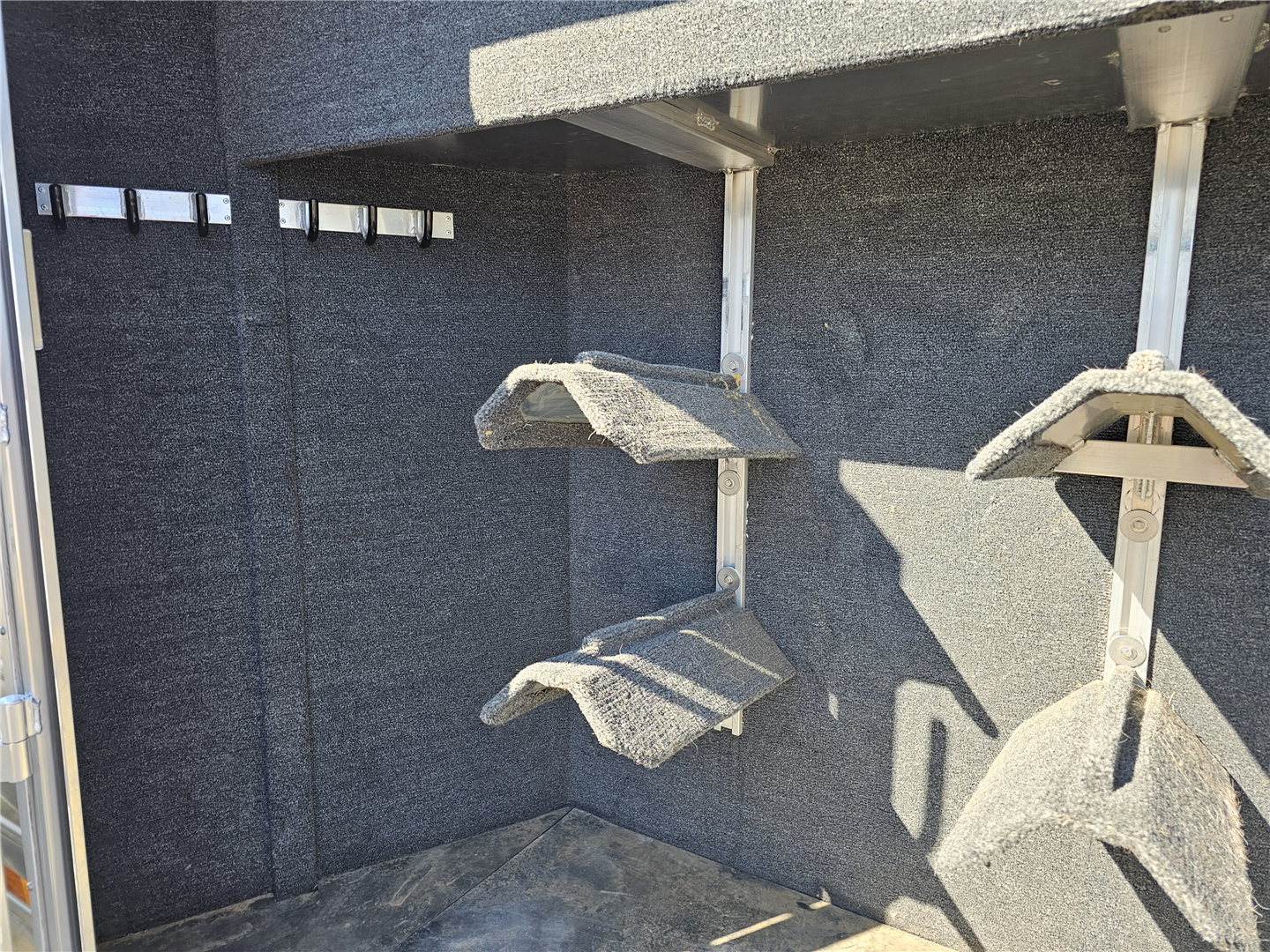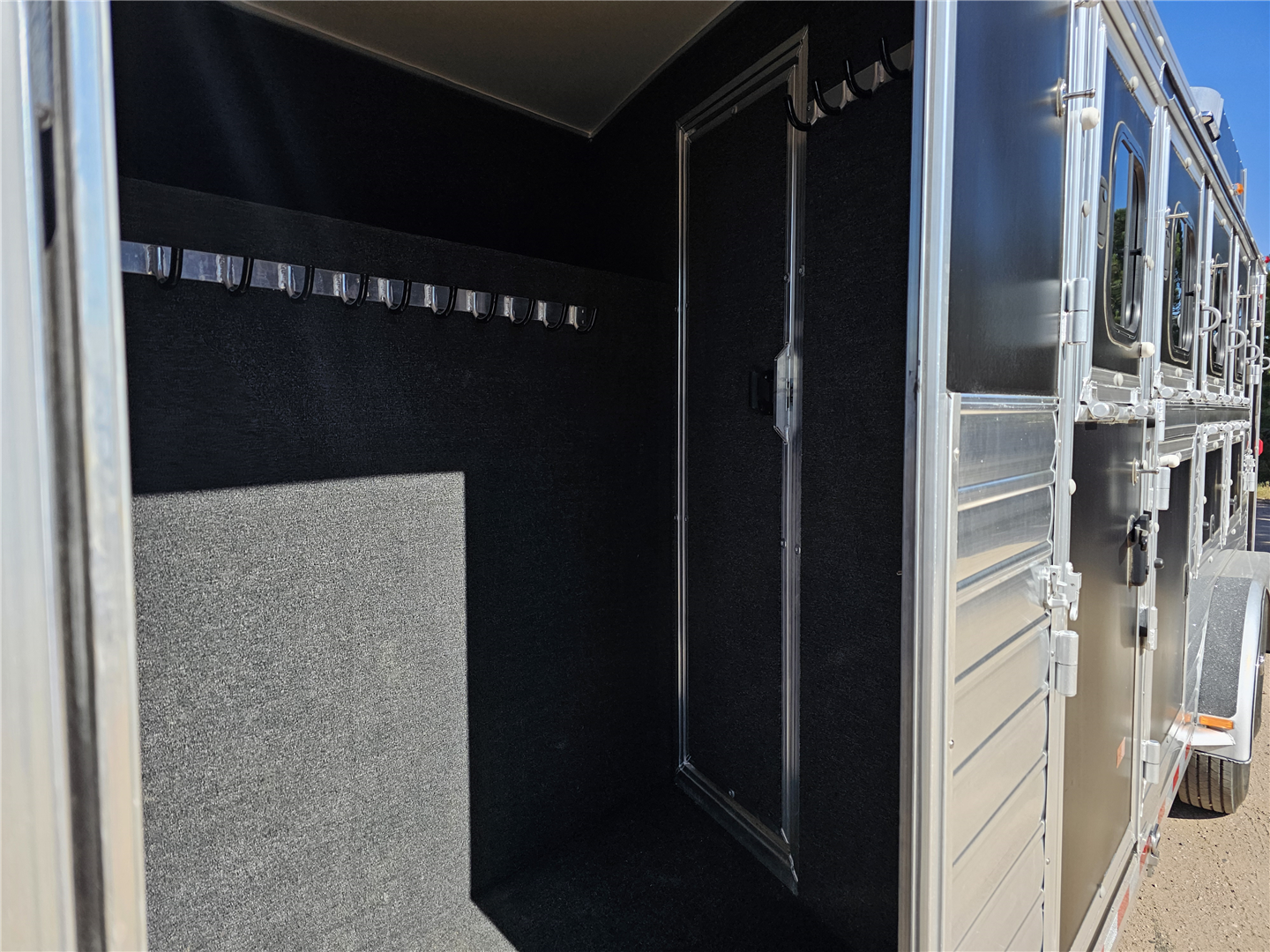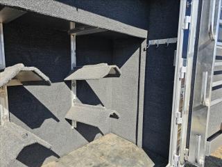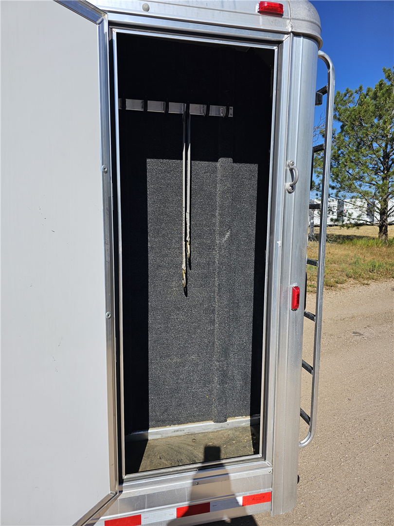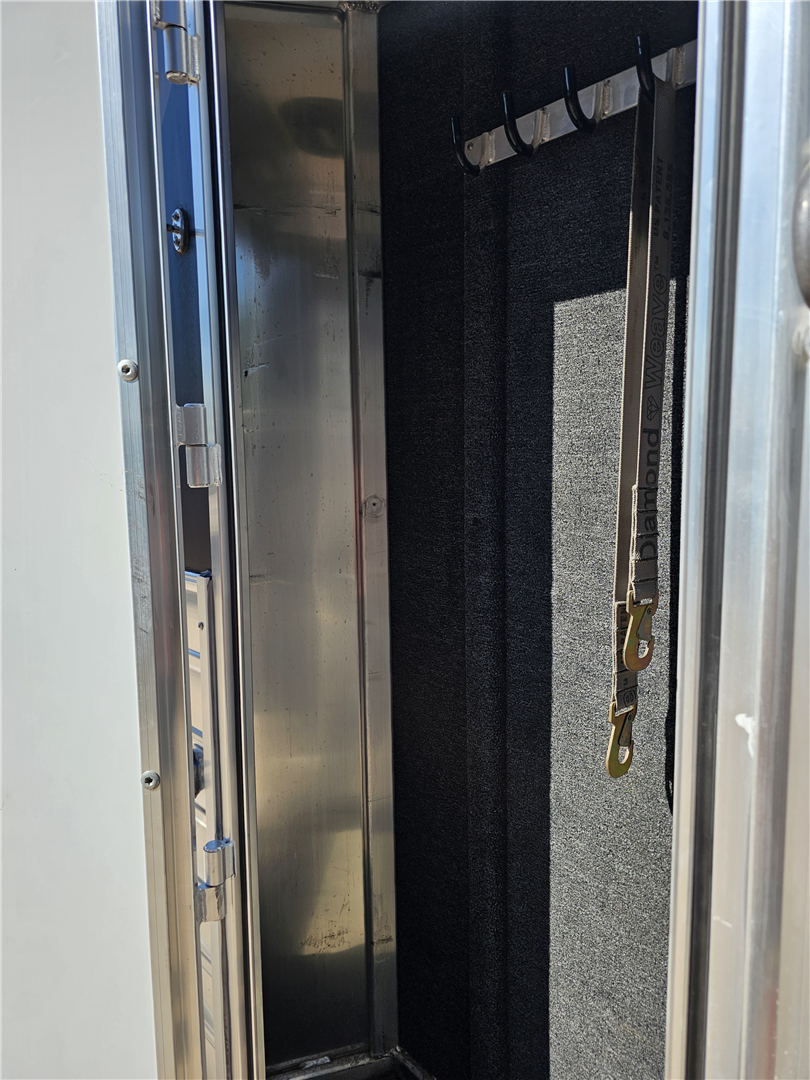 Hart trailers are famous for their outstanding durability and reliable performance over time. This particular trailer lives up to that reputation, having been customized with every available option to meet your needs. This trailer was the owner of Branding Iron personal trailer. It has been meticulously maintained and is ready for its next adventure. This trailer is 7'6'' wide and 7'1'' tall. There are 3 mangers in the back 3 stalls with an escape door in the first stall as well as a lower divider wall. Outside you have easy access to all of the mangers with a door at each stall, the first door being full height. Behind the mangers there is the broom closet. A great storage for rakes water tanks and more. Both front and back have drop down windows with the front having drop down bars as well. The floor has been upfitted with WERM flooring giving the horses less vibration, more cushion and more traction in addition to those features probably the most important is flooring is non porous meaning urine never gets to your aluminum floor protecting it. In the dressing room there is a pass through door to the first stall, brush box and loads of bridle hooks. Now to get to the highlight of this trailer- The Smart Tack. Open those double doors and admire the easy access to your 4 saddle racks and bridle hooks right there at ground level. There are additional bridle hooks along the top wall as well.