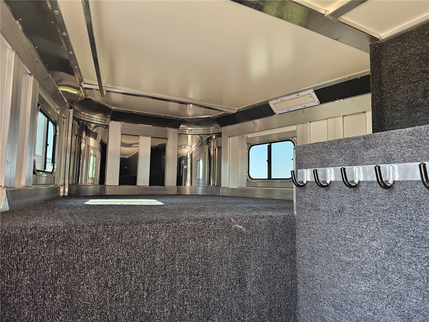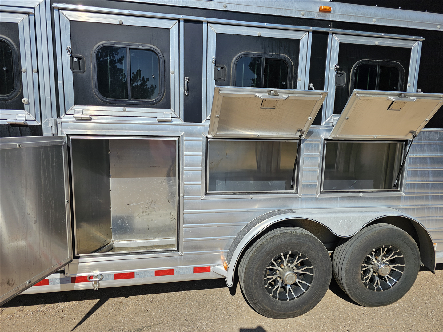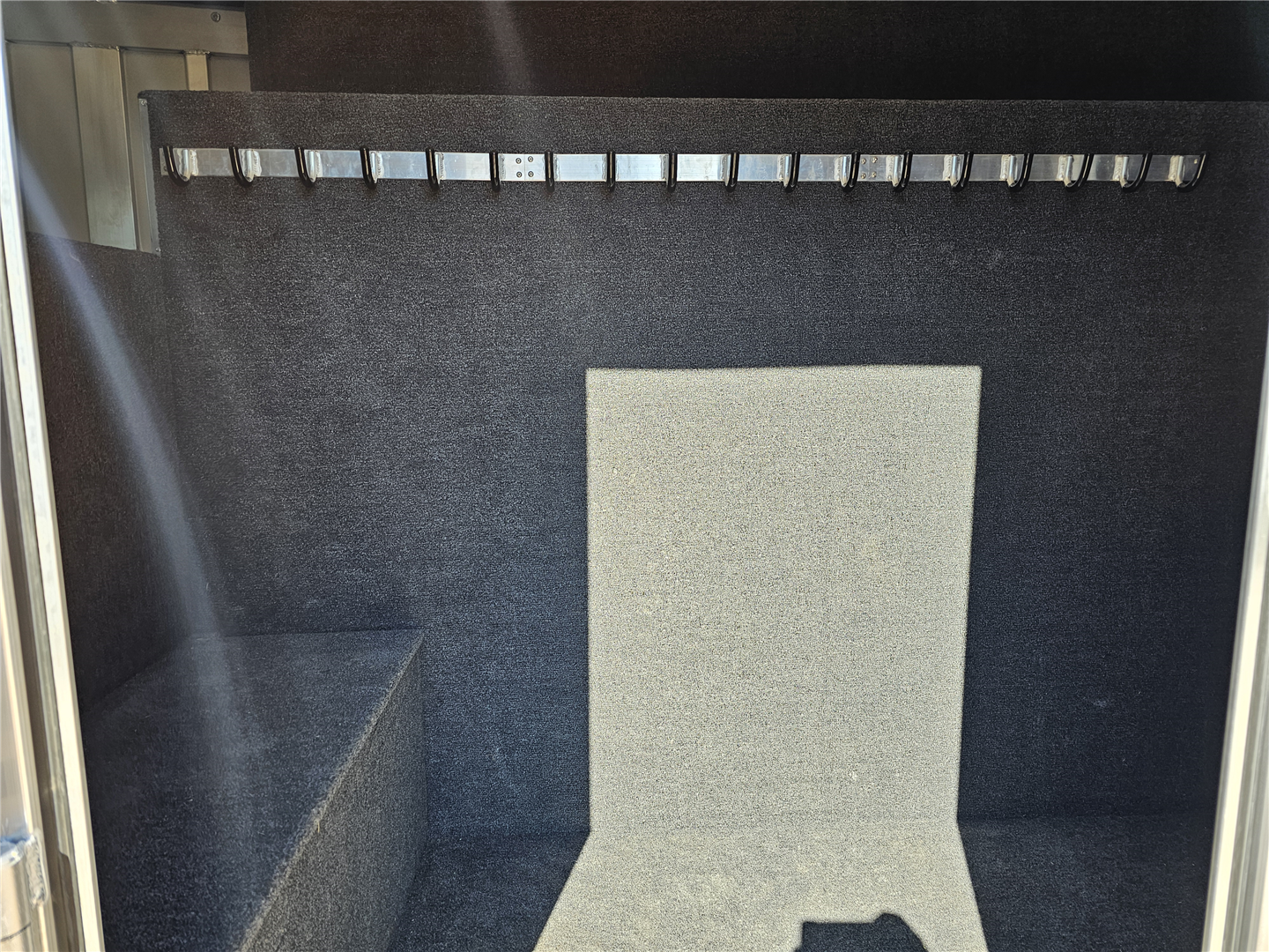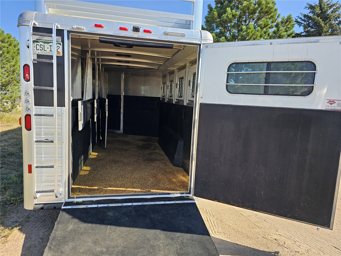 Hart trailers are famous for their outstanding durability and reliable performance over time. This particular trailer lives up to that reputation, having been customized with every available option to meet your needs. This trailer was the owner of Branding Iron personal trailer. It has been meticulously maintained and is ready for its next adventure. This trailer is 7'6'' wide and 7'1'' tall. There are 3 mangers in the back 3 stalls with an escape door in the first stall as well as a lower divider wall. Outside you have easy access to all of the mangers with a door at each stall, the first door being full height. Behind the mangers there is the broom closet. A great storage for rakes water tanks and more. Both front and back have drop down windows with the front having drop down bars as well. The floor has been upfitted with WERM flooring giving the horses less vibration, more cushion and more traction in addition to those features probably the most important is flooring is non porous meaning urine never gets to your aluminum floor protecting it. In the dressing room there is a pass through door to the first stall, brush box and loads of bridle hooks. Now to get to the highlight of this trailer- The Smart Tack. Open those double doors and admire the easy access to your 4 saddle racks and bridle hooks right there at ground level. There are additional bridle hooks along the top wall as well.