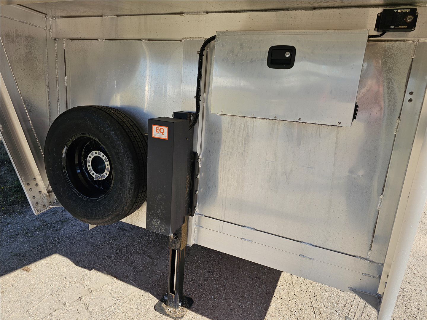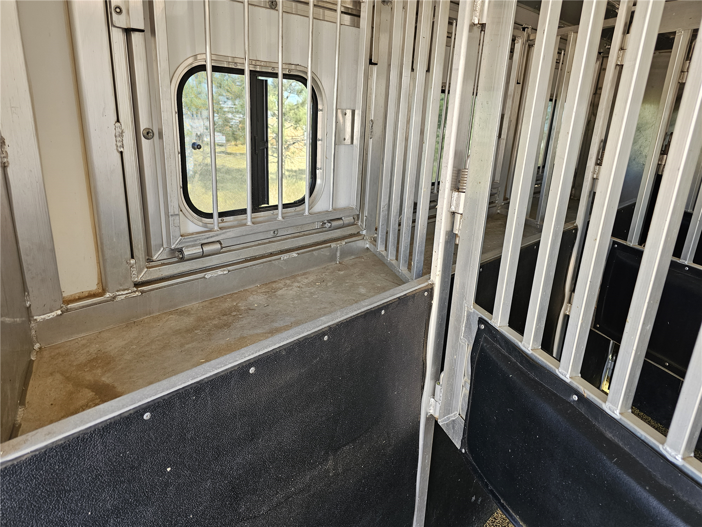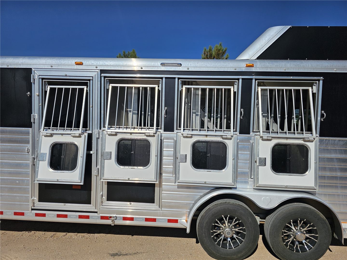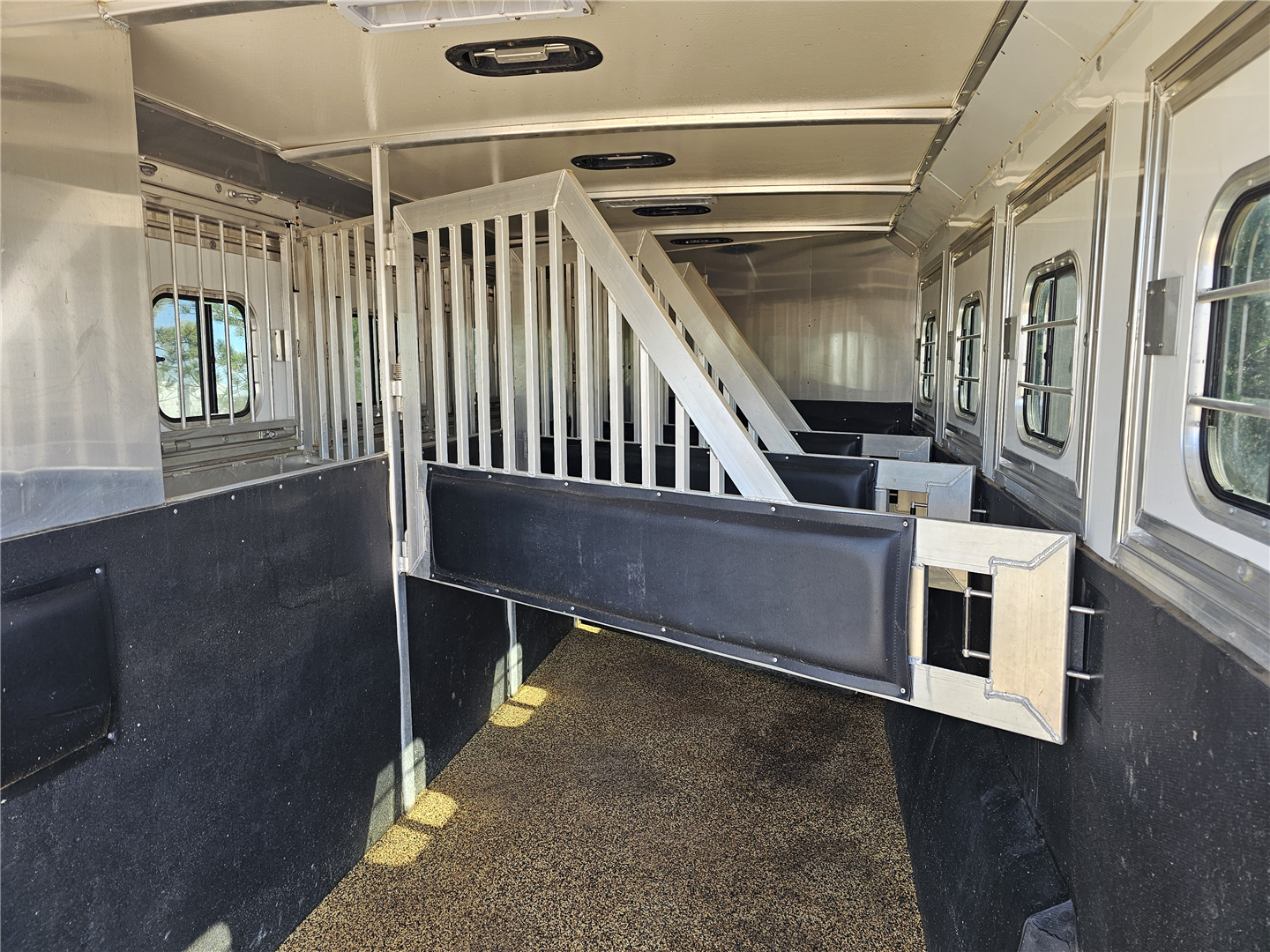 Hart trailers are famous for their outstanding durability and reliable performance over time. This particular trailer lives up to that reputation, having been customized with every available option to meet your needs. This trailer was the owner of Branding Iron personal trailer. It has been meticulously maintained and is ready for its next adventure. This trailer is 7'6'' wide and 7'1'' tall. There are 3 mangers in the back 3 stalls with an escape door in the first stall as well as a lower divider wall. Outside you have easy access to all of the mangers with a door at each stall, the first door being full height. Behind the mangers there is the broom closet. A great storage for rakes water tanks and more. Both front and back have drop down windows with the front having drop down bars as well. The floor has been upfitted with WERM flooring giving the horses less vibration, more cushion and more traction in addition to those features probably the most important is flooring is non porous meaning urine never gets to your aluminum floor protecting it. In the dressing room there is a pass through door to the first stall, brush box and loads of bridle hooks. Now to get to the highlight of this trailer- The Smart Tack. Open those double doors and admire the easy access to your 4 saddle racks and bridle hooks right there at ground level. There are additional bridle hooks along the top wall as well.