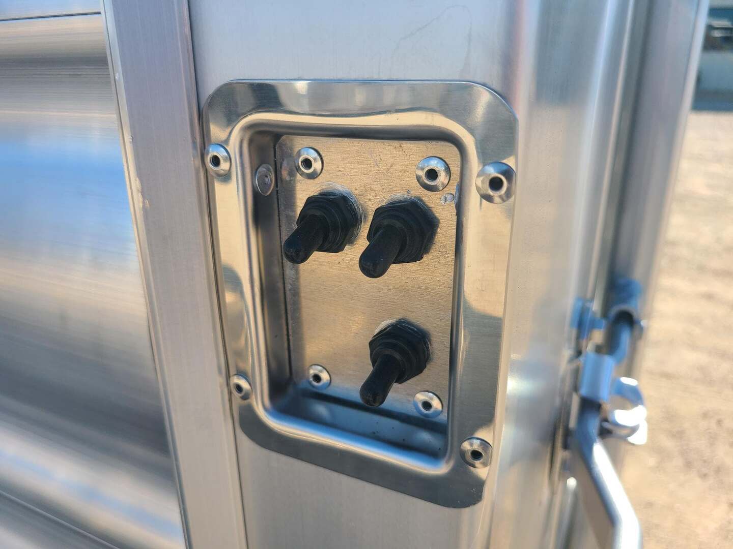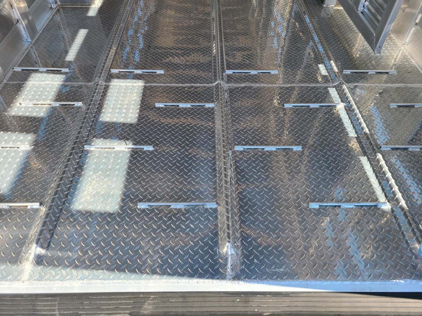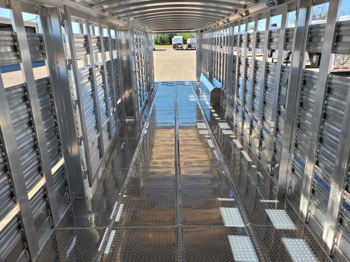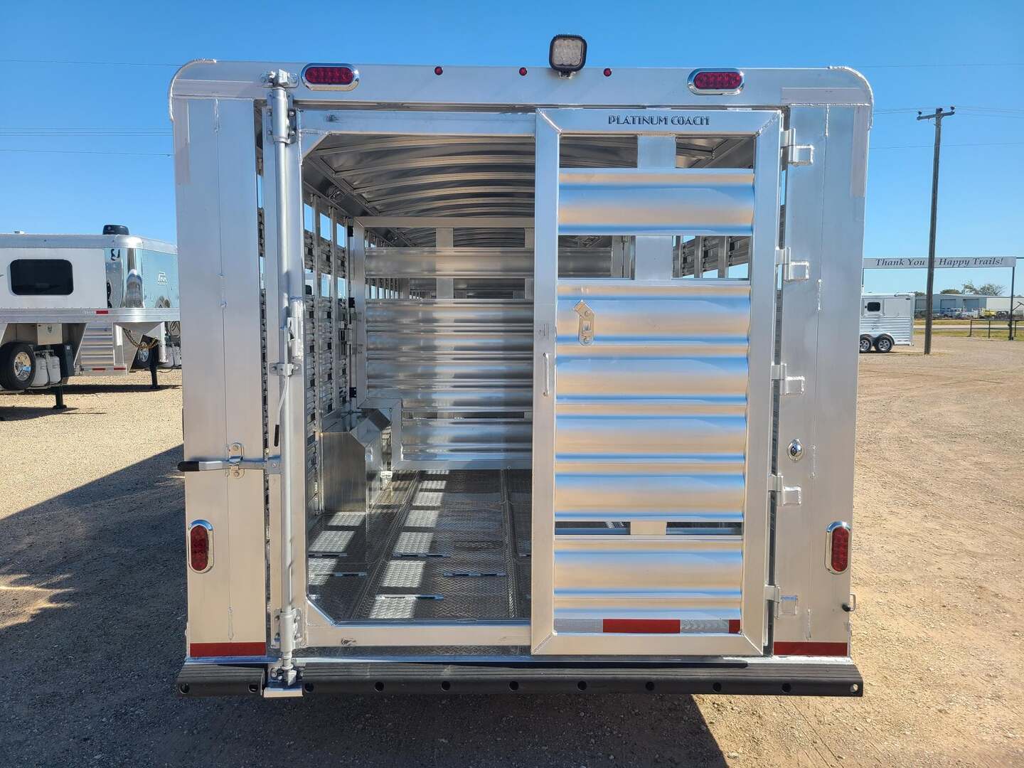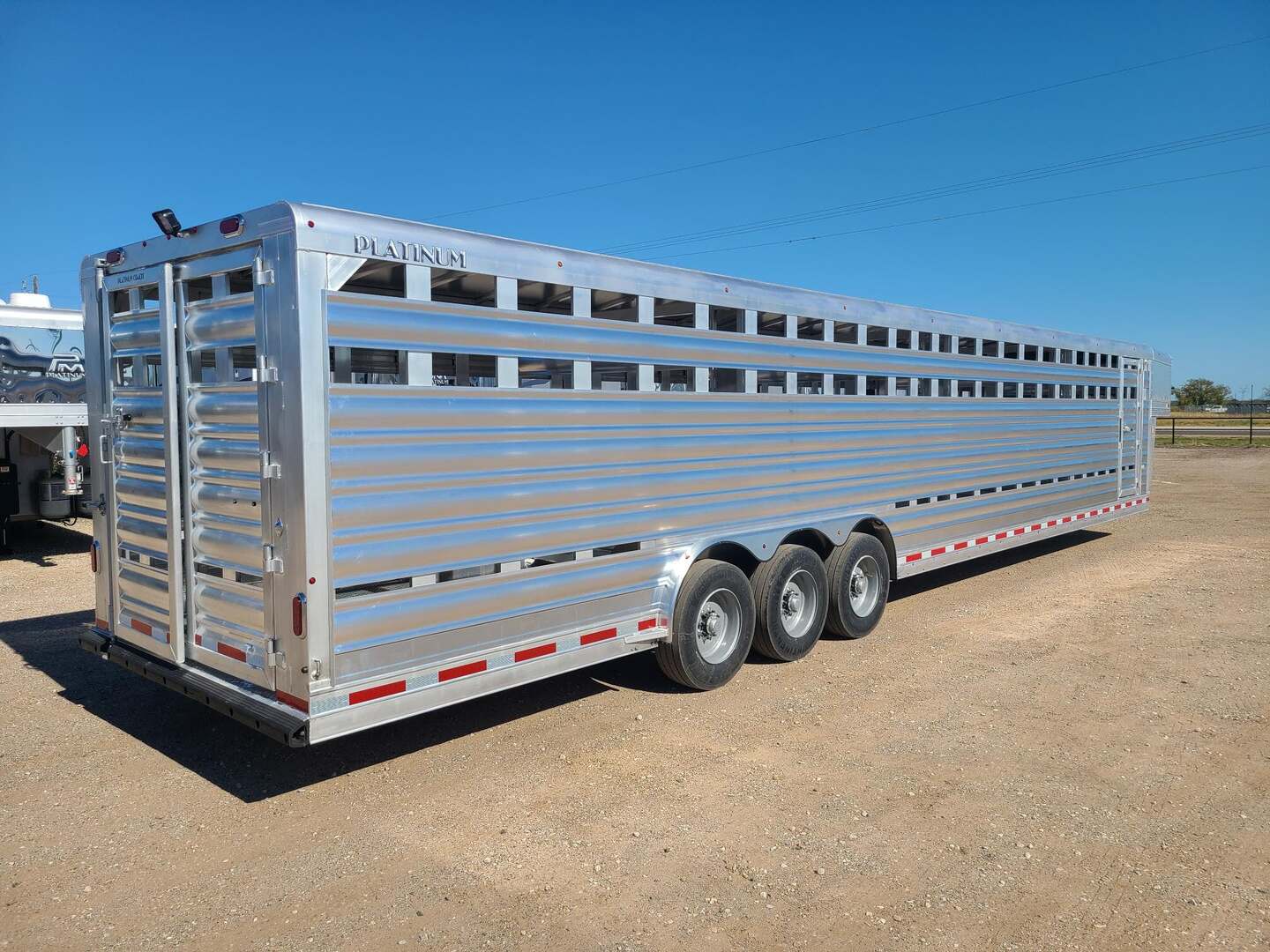 Platinum Coach 40’ Stock Trailer....7 TALL!!! 8 x 40’ x 7 tall 3-10,000# axles, 17.5” steel wheels Continental 18 ply tires rated at 6005# per tire 4-10’ sections Slider on rear gate 1x5” side posts for extra strength Corrugated tread plate floor Loading rods at rear 4’, minimize slipping Escape door on curb side, first section 11 round LED clearance lights TWO LED dome lights per section LED Load light at rear Mill finish exterior skin RECESSED LOAD LIGHT SWITCHES!!