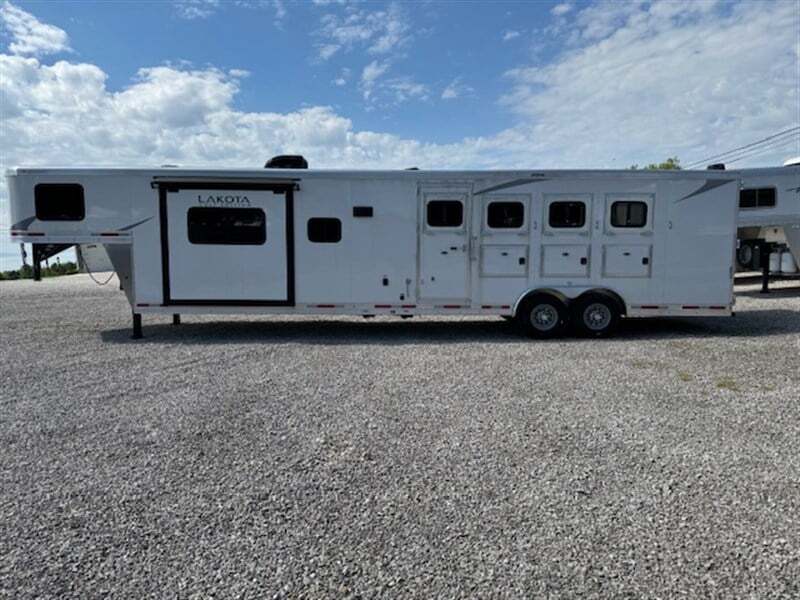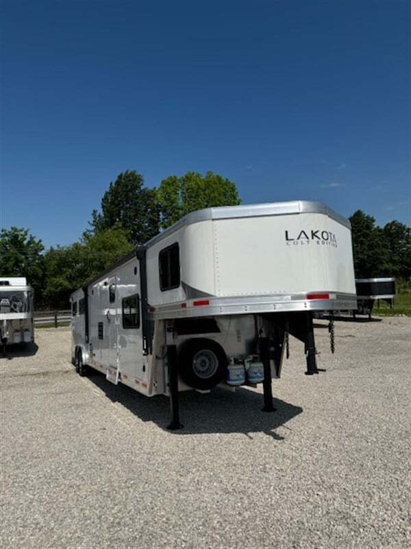 CLOSE OUT...CLOSE OUT...CLOSE OUT New... Never Used or Titled  2023 Lakota Colt 4H 15’6” Short Wall LQ with Slide ALL ALUMINUM 8’ Wide x 32’11” Long x 7’6” Tall...Empty Weight 10,088 lbs LIVING QUARTERS FEATURES Ducted air conditioning LP forced air furnace 6 Cu ft LP / 110V refrigerator 6 Gallon LP / 110V water heater 2- Burner LP cooktop Microwave oven 24” TV / DVD combo on swing arm Pull out sofa sleeper Separate toilet Neo angle shower with glass door Vanity with sink and medicine cabinet Walk thru door from bathroom to horse area Power awning Porch light Fold up step at LQ door Pleated window shades TRAILER FEATURES (2) 8,000 lb rubber torsion 8 bolt axles with 4-wheel electric brakes (5) ST235/80R16 14 ply tires on 8 hole wheels Escape door at head of 1st stall Drop down feed door with separate drop down window bars at head of all 4 stalls (2) Large sliding windows with screen at rear of horse stalls Stub divider at 1st stall  Feed manger with exterior access door at 2nd, 3rd and 4th stalls Padded stall dividers Interior dome lights Walls and ceiling are lined and insulated. Walls are rubber lined 48” tall Rubber floor mats 2-Way roof vent above each horse Collapsible rear tack room Removable and adjustable 4-tier saddle rack Bridle hooks, blanket bar and brush tray (4) flush mount exterior loading lights. (2) above rear doors and (1) on each side Interior and exterior horse ties MSRP: $96,714.00 ClLOSE OUT SALE PRICE: $67,750.00 Financing Available with approved credit...Delivery Available