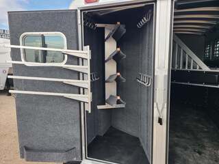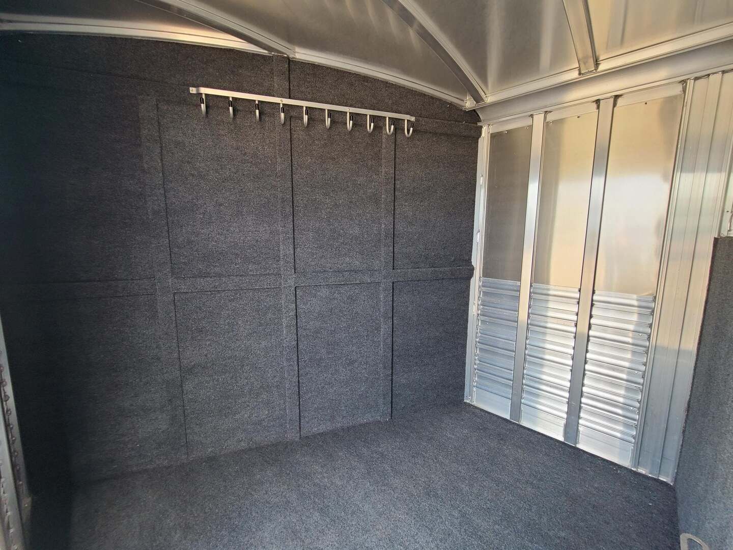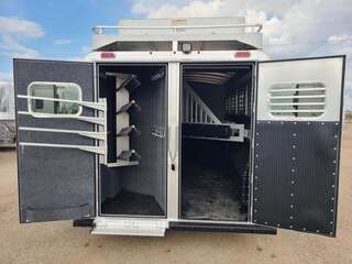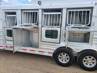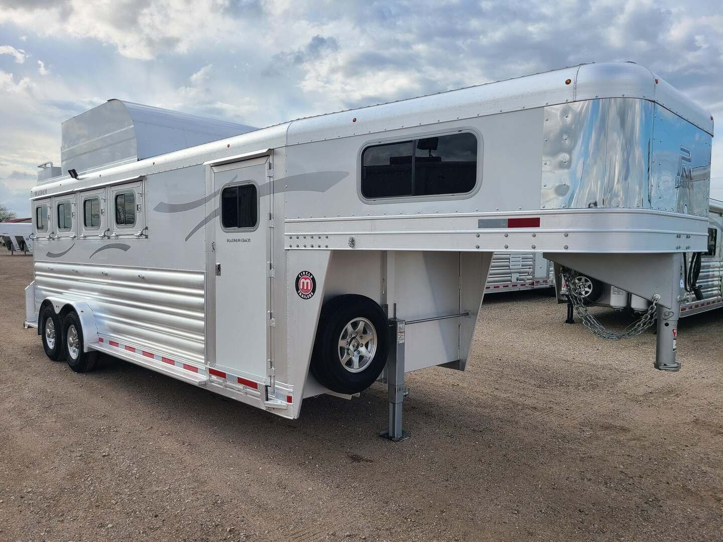 Platinum Coach Features:  4HGN w/ 4’ SW dressing room 7.5 wide x 21 long x 7 tall 6’ haypod with 3’ landing and ladder on driver side Electric brakes 7000# axles 235/80R 16E 10 ply tires Mag aluminum wheels 50/50 rear doors w/ windows Manger access doors Escape door at head w/ drop window and feed bag Flow through dividers Removable baby panel Pads on dividers and manger fronts 8 inside tie rings, 8 outside tie rings 4 center-line 2-way roof vents Floor mats in horse compartment Rubber rump and head wall Rubber on bulkhead wall and wheel wells 4 covered saddle racks in rear tack 2 pair of brush trays, one on rear tack door, one on dressing room door 4 swing out blanket bars in rear tack 6 LED dome lights 7 Round LED Lidhts on top rail 3 outside LED load lights 4 drop down windows w/ bars at head 4 drop down windows on hip Stainless steel on nose Carpeted Rear tack with double row of 10 hooks Carpet on bulkhead wall with 10 bridle hooks Steps at tack room door, escape door, and rear tack While we believe all information on this website to be accurate, please confirm features and price with a salesman.