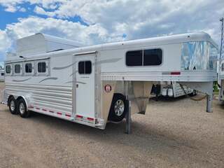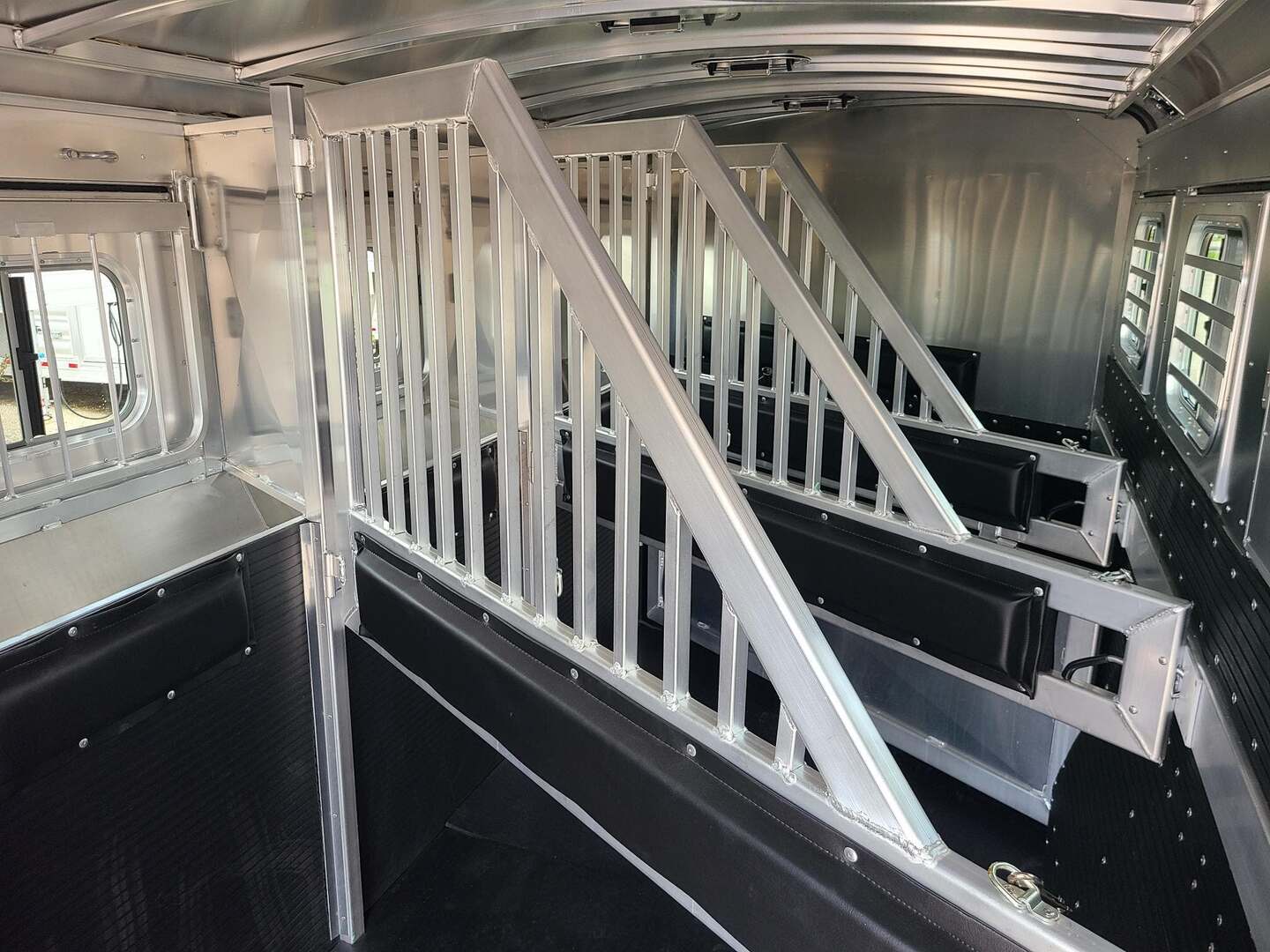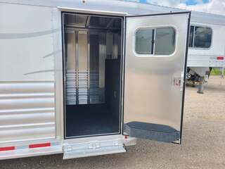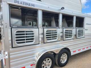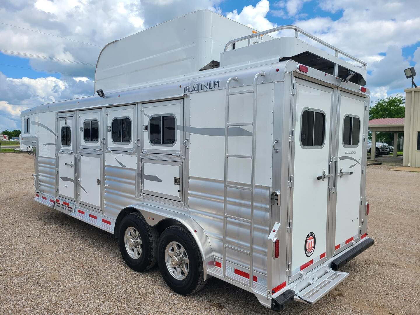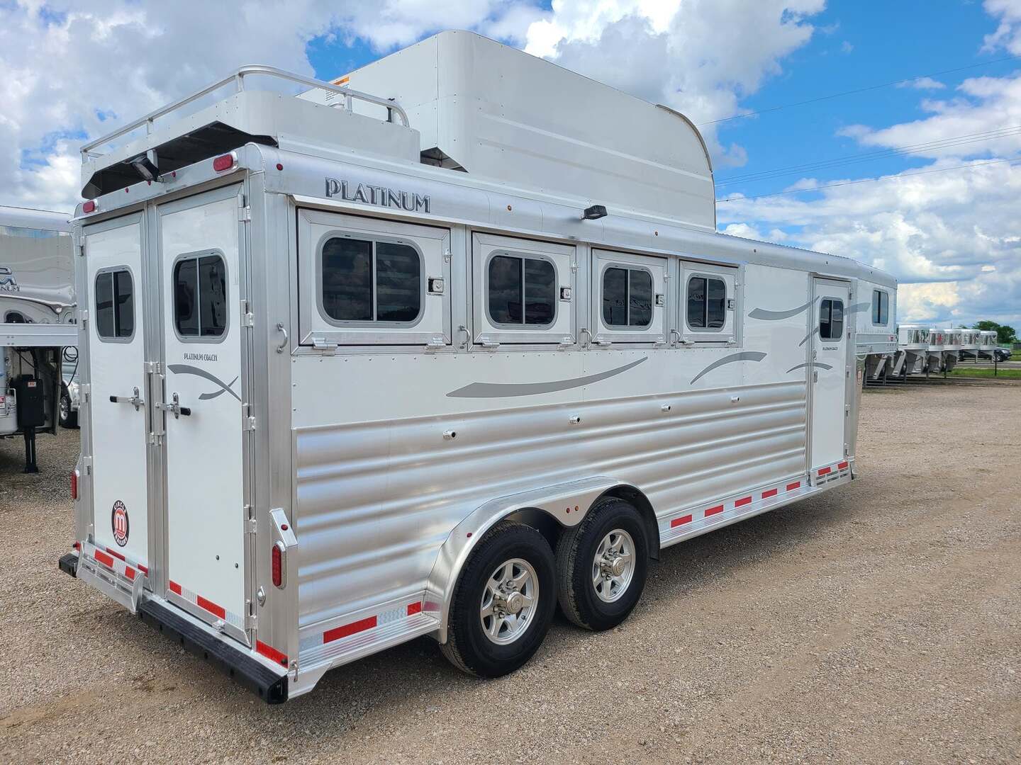 Platinum Coach Features:  4HGN w/ 4’ SW dressing room 7.5 wide x 21 long x 7 tall 6’ haypod with 3’ landing and ladder on driver side Electric brakes 7000# axles 235/80R 16E 10 ply tires Mag aluminum wheels 50/50 rear doors w/ windows Manger access doors Escape door at head w/ drop window and feed bag Flow through dividers Removable baby panel Pads on dividers and manger fronts 8 inside tie rings, 8 outside tie rings 4 center-line 2-way roof vents Floor mats in horse compartment Rubber rump and head wall Rubber on bulkhead wall and wheel wells 4 covered saddle racks in rear tack 2 pair of brush trays, one on rear tack door, one on dressing room door 4 swing out blanket bars in rear tack 6 LED dome lights 7 Round LED Lidhts on top rail 3 outside LED load lights 4 drop down windows w/ bars at head 4 drop down windows on hip Stainless steel on nose Carpeted Rear tack with double row of 10 hooks Carpet on bulkhead wall with 10 bridle hooks Steps at tack room door, escape door, and rear tack While we believe all information on this website to be accurate, please confirm features and price with a salesman.