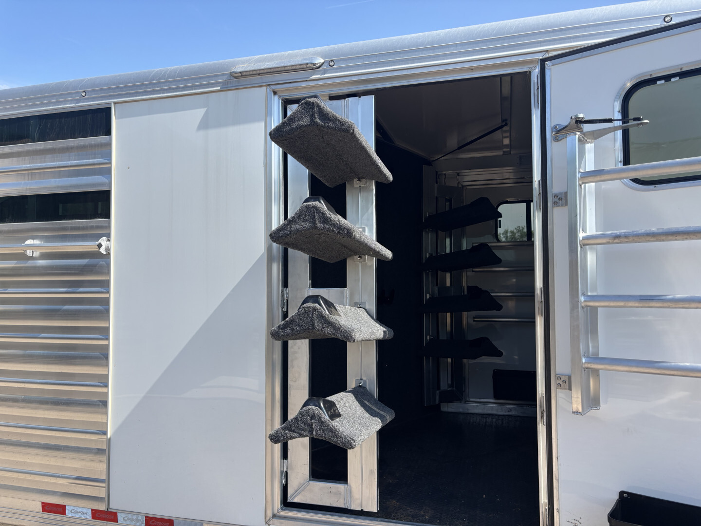 2024 Cimarron Lonestar Stock Combo 8ooo# Axles 8’wide x 32’ floor length 7’1” Tall Front Tack w/ Grey Rubber Tread flooring 2 swing out saddle racks 2 swing out pad poles LED Lights 25 gallon water tank Interior & Exterior tie rail Insulated roof 2 air gaps w/ Plexiglass Insert & Tray Hydraulic Jack 34” access Door 2- divider slant gates