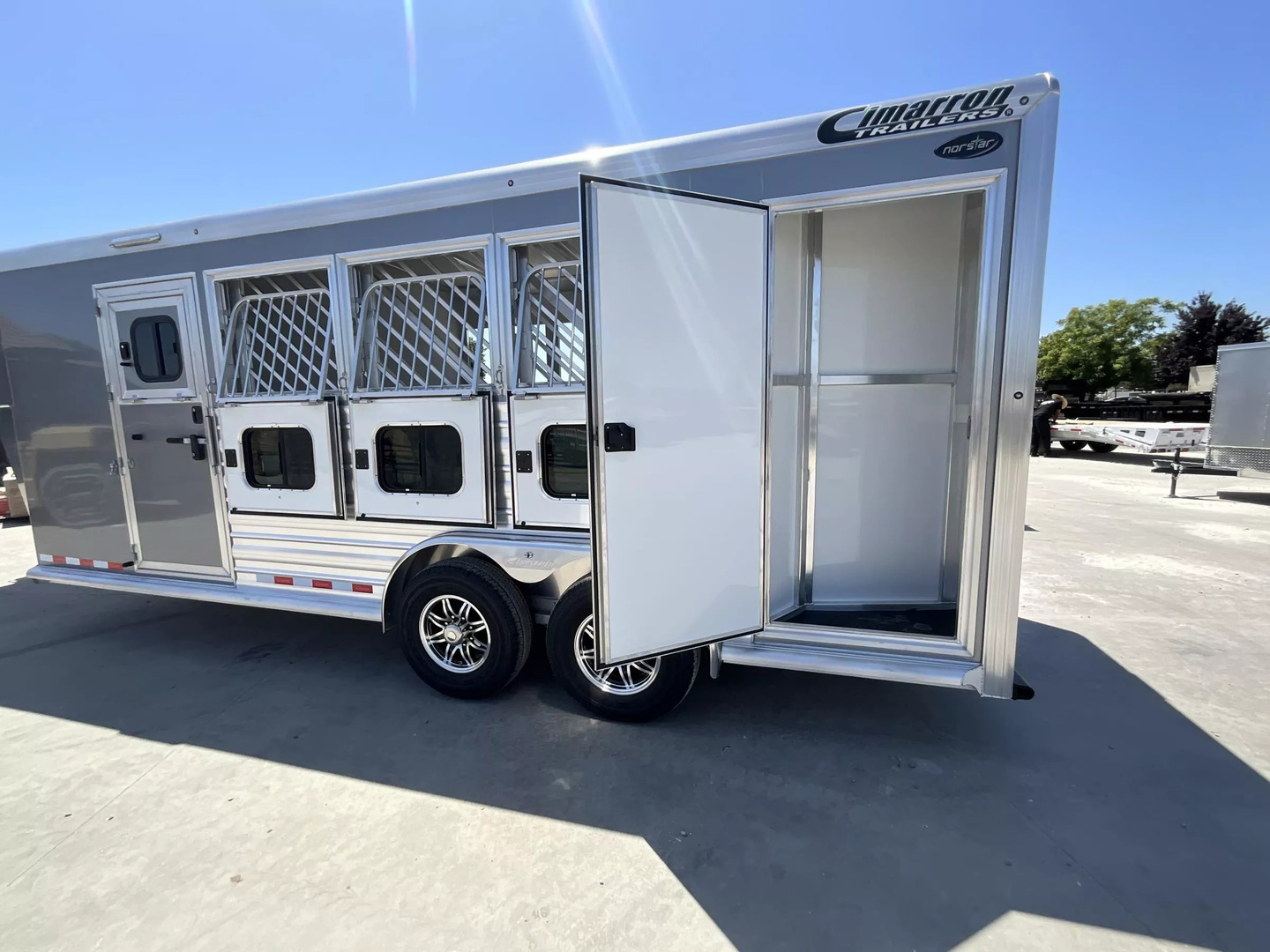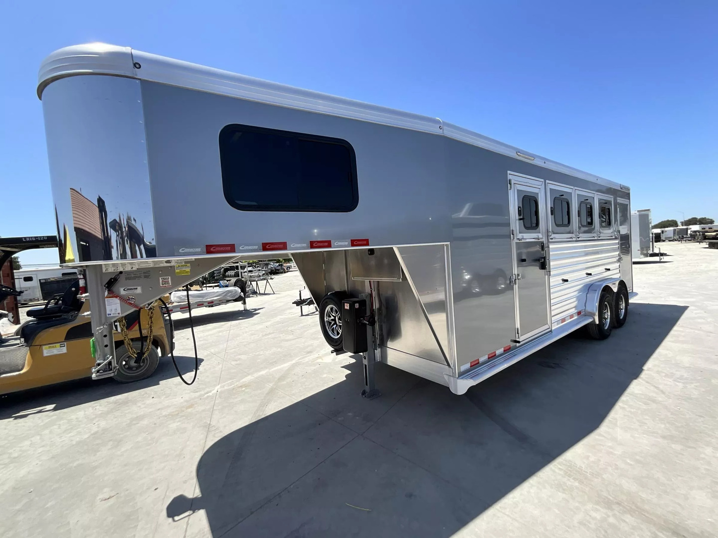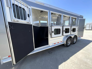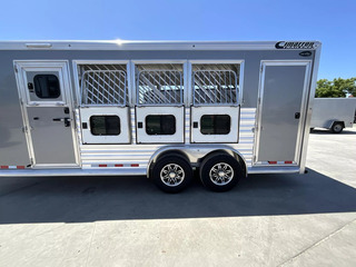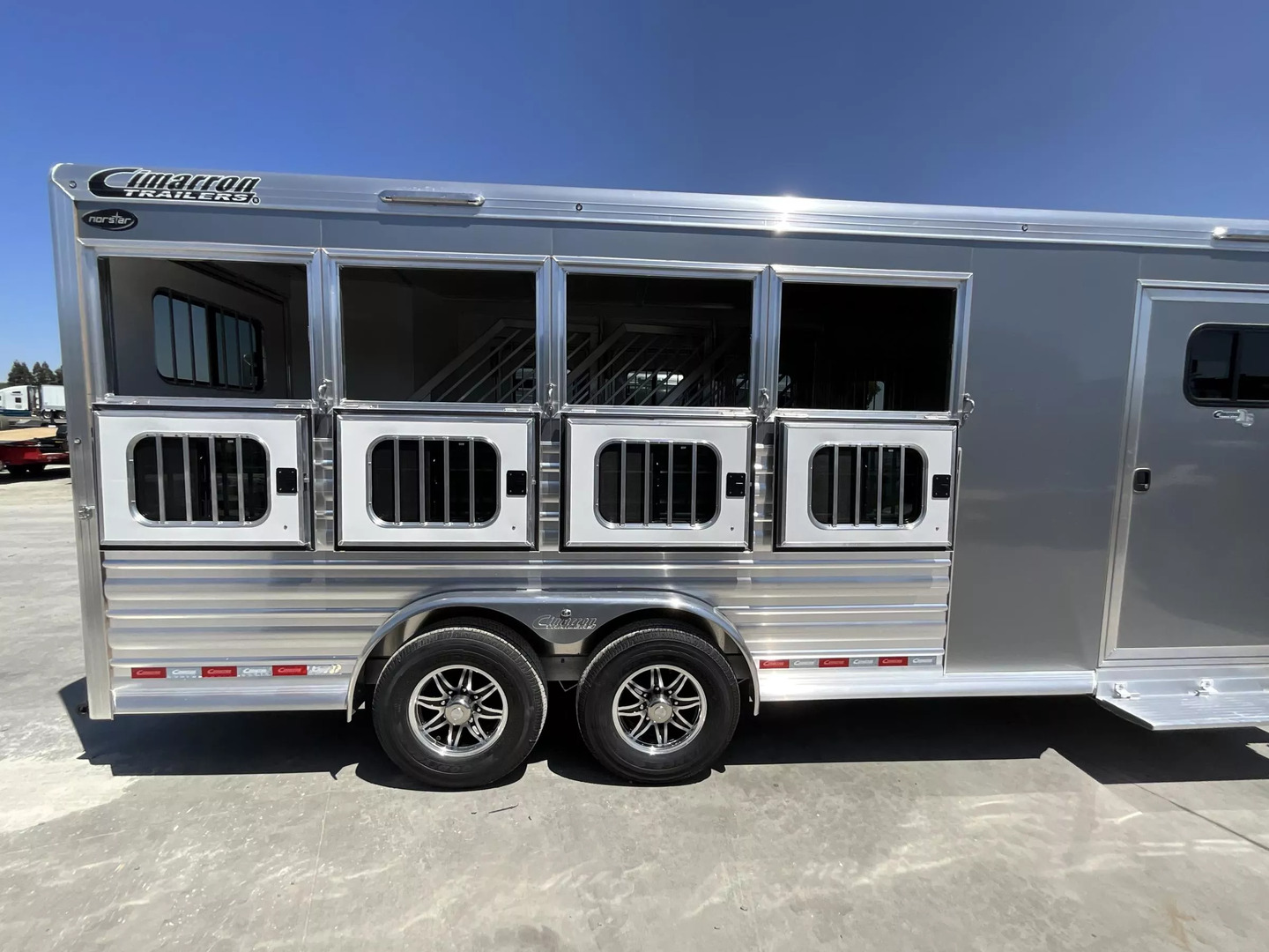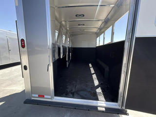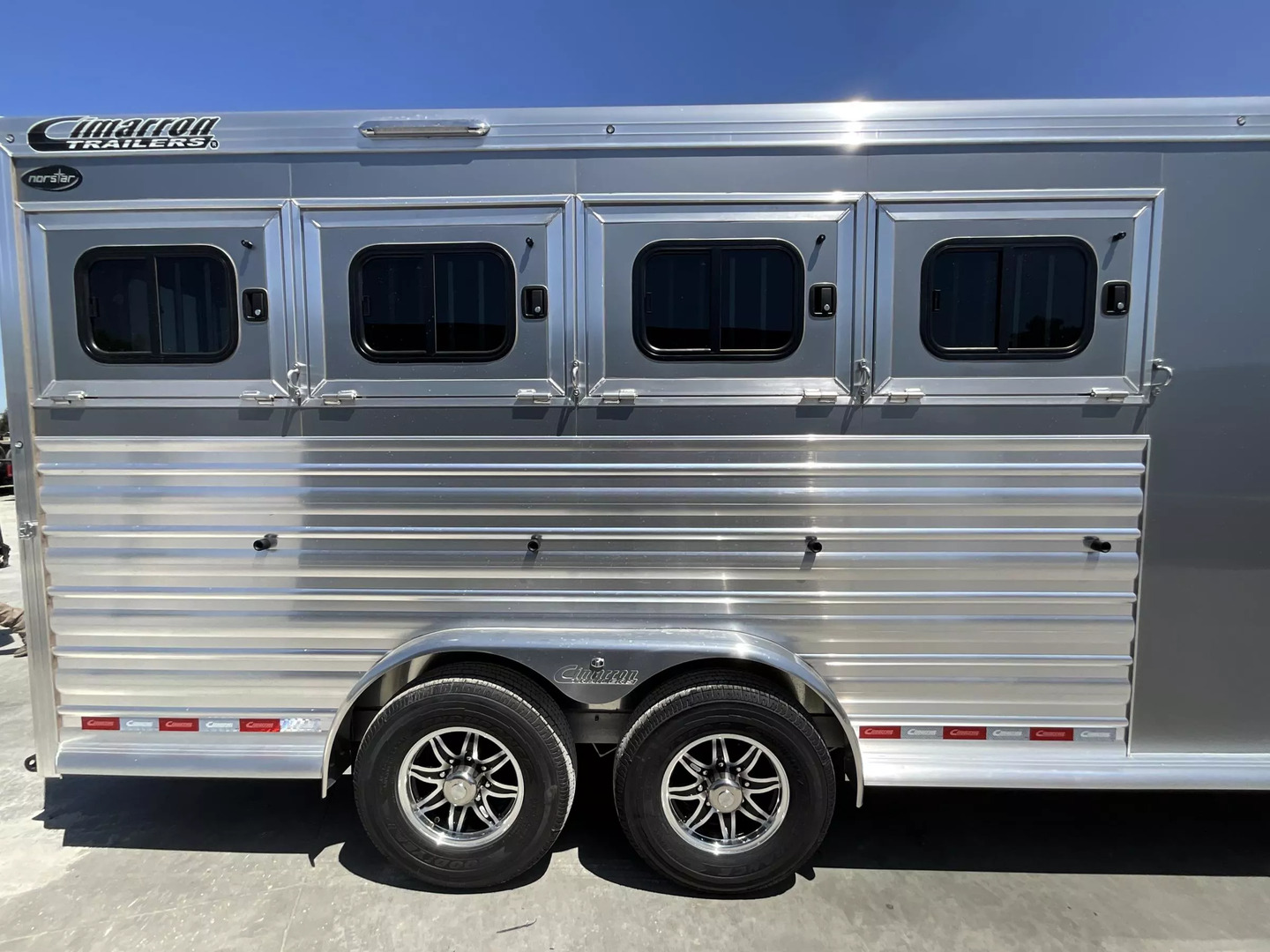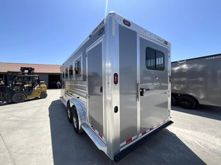 *** Introducing the 2026 Cimarron Trailers NS4G-RTG 4-Horse Slant Gooseneck Trailer! The ”Ready-To-Go” (R.T.G.) models from Cimarron are packaged with convenience in mind, offering a perfect blend of efficiency, user-friendly features, and organized tack rooms. You’ll get all the standard features you’ve come to love from Cimarron, plus added conveniences that make the R.T.G. an industry leader in value. *** Upgraded Features for Enhanced Comfort & Convenience This 2026 model comes with several enhancements to elevate your hauling experience: * Spacious & Tall: With an upgraded 7’6” width and a generous 7’7” interior height, your horses will have ample room. The 53” drop wall adds to the overall design. * Sleek Finish: The trailer boasts a modern Silver Metallic sheet color, giving it a polished look. * Effortless Operation: A single electric/hydraulic jack with a 12-volt battery & compartment makes hitching and unhitching a breeze. * Superior Lighting: Four LEDs with red lenses, ten LED button-type lights, one 8” LED awning light, and three 16” LED awning lights provide exceptional illumination for safety and convenience. * Organized Tack & Storage: A dedicated broom closet keeps things tidy. The rubber mat floor in the tack room, along with carpeted gooseneck wall and deck, adds comfort and durability. * Flexible Horse Compartments: Enjoy fold-down feed doors on the butt side, one full divider, and three telescopic dividers for adaptable horse configurations. * Horse Safety & Comfort: Twelve D-rings provide ample tie-down points. Six side paddings, one chest restraint, and one butt restraint ensure your horses travel securely and comfortably. * Interior Amenities: Six dome lights, two bridle hooks, one brush tray, one clothes bar, and four swing-out blanket poles keep your tack organized and accessible. *** Standard Features You Expect from Cimarron Cimarron’s commitment to quality shines through in these robust standard features: * Robust Connection: A 2-5/16” adjustable coupler with safety chains and a breakaway kit ensures a secure hook-up. * Durable Build: Features an 8’ long nose with a 2’ taper for improved aerodynamics, and a fully insulated roof with a 1/2” thickness for R3 thermal value. * Smooth Ride: Rubber torsion axles with electric brakes provide dependable stopping power and a comfortable ride. * Premium Wheels: Radial tires on aluminum wheels are balanced and nitrogen-filled for optimal performance. * Strategic Windows: 19”x34” windows in the gooseneck nose and 19”x34” sliding windows with welded bars (hip side) offer ventilation. * Easy Access Doors: A 42” wide dressing room door with a deadbolt latch and windows, drop-down feed doors with windows and safety bar grills (head side), an access door on the streetside at the 1st horse with a drop-down feed door, and double rear doors with windows provide excellent accessibility. * Thoughtful Hardware: A 4” rubber docking bumper, two exterior tie rings per stall (interior and exterior), swing-out saddle racks, a 25-gallon water tank, a boot box, a shelf with a clothes bar (gooseneck models), and a brush tray enhance utility. * Comprehensive Lighting: LED load light at the rear, LED dome and clearance lights, a 7-way plug and wiring, recessed exterior light switches, LED high and low turn/stop signals at the rear, and a flood light on the curbside ensure maximum visibility and safety. *** This 2026 Cimarron NS4G-RTG trailer is truly ready for any adventure with you and your horses! *While we always strive for complete accuracy, please confirm all specifications with one of our sales representatives.*