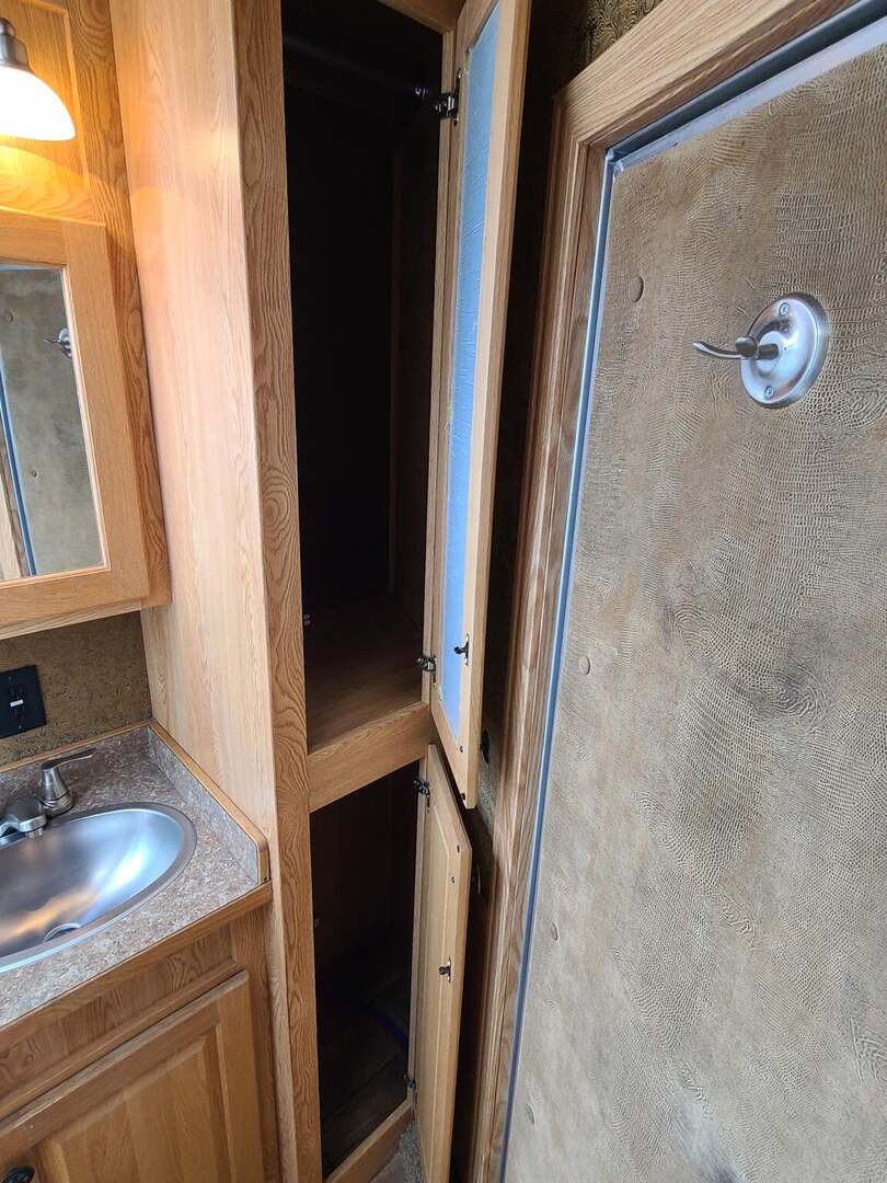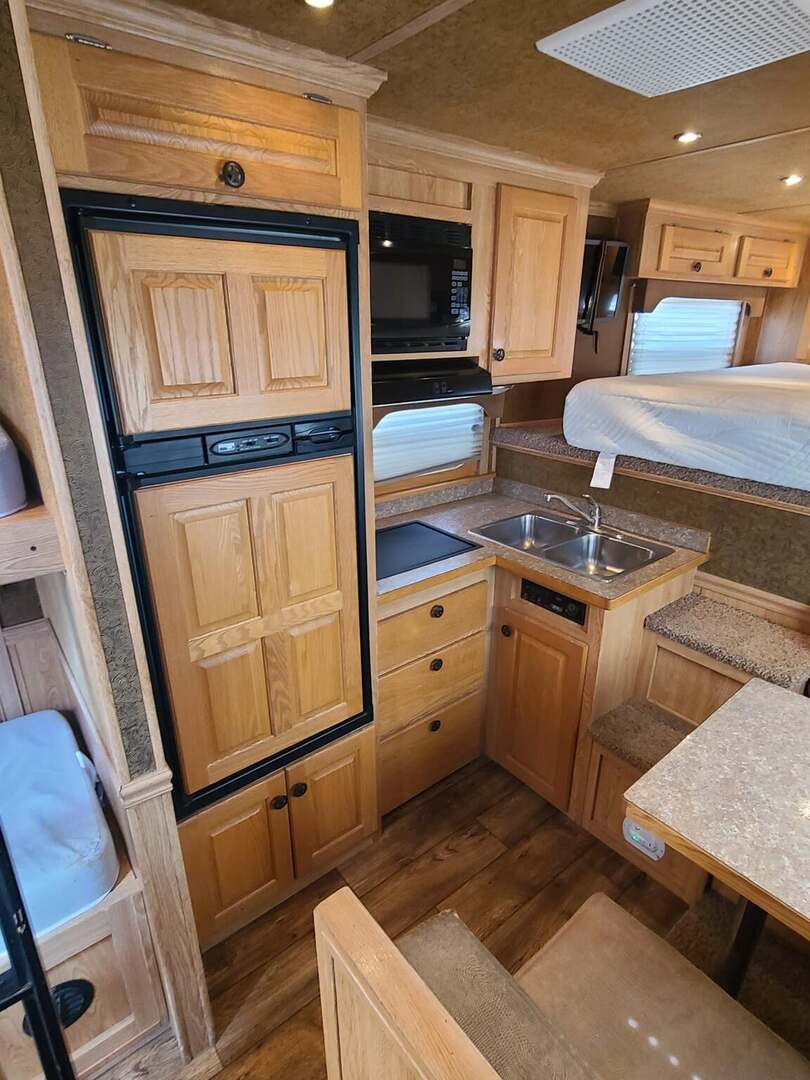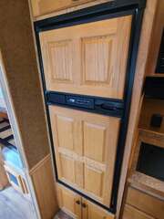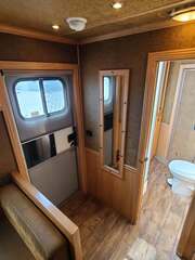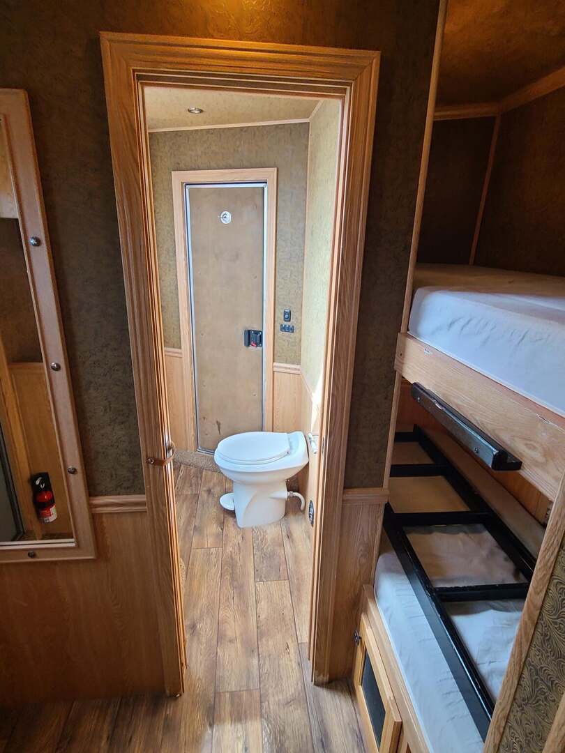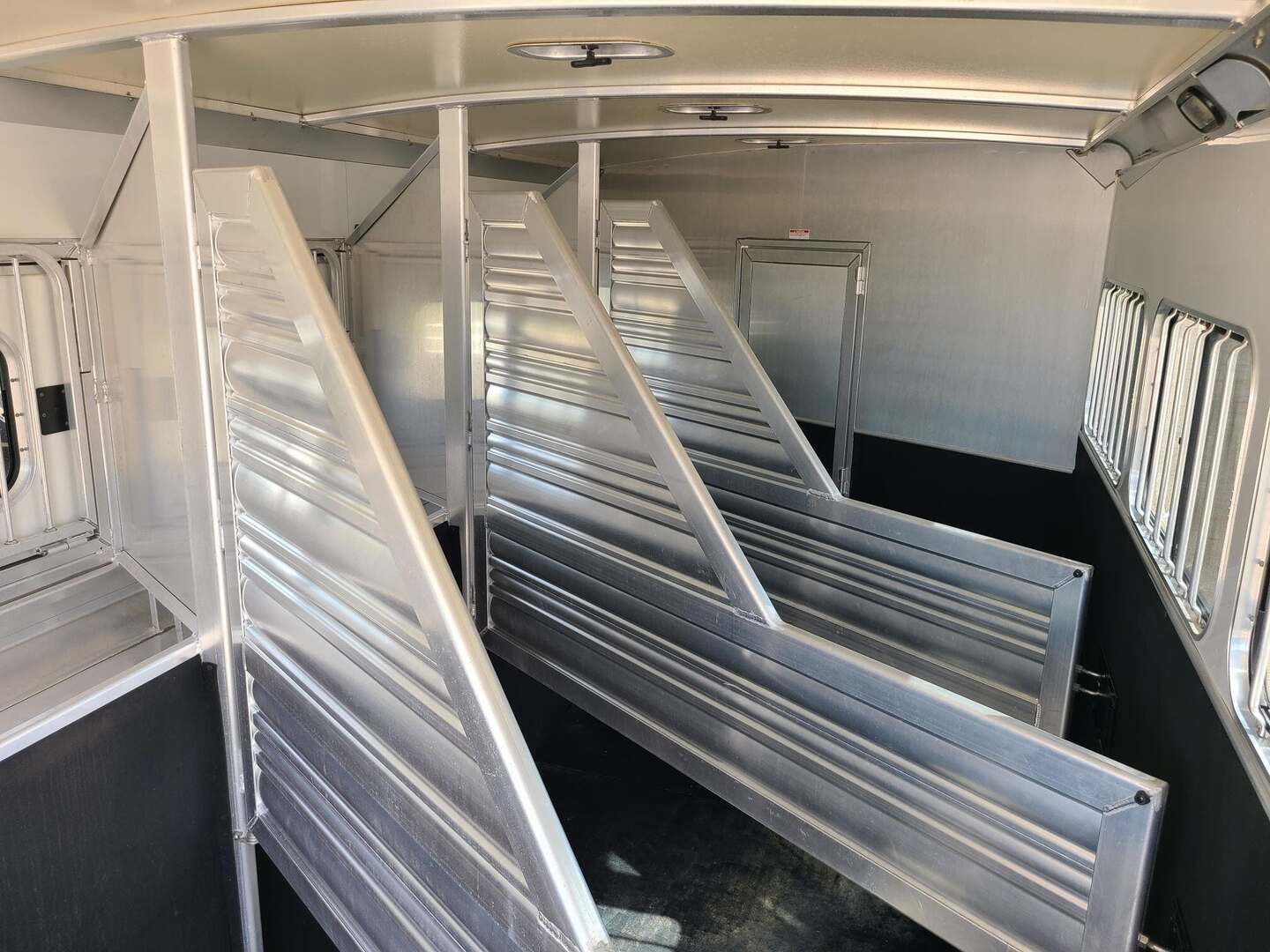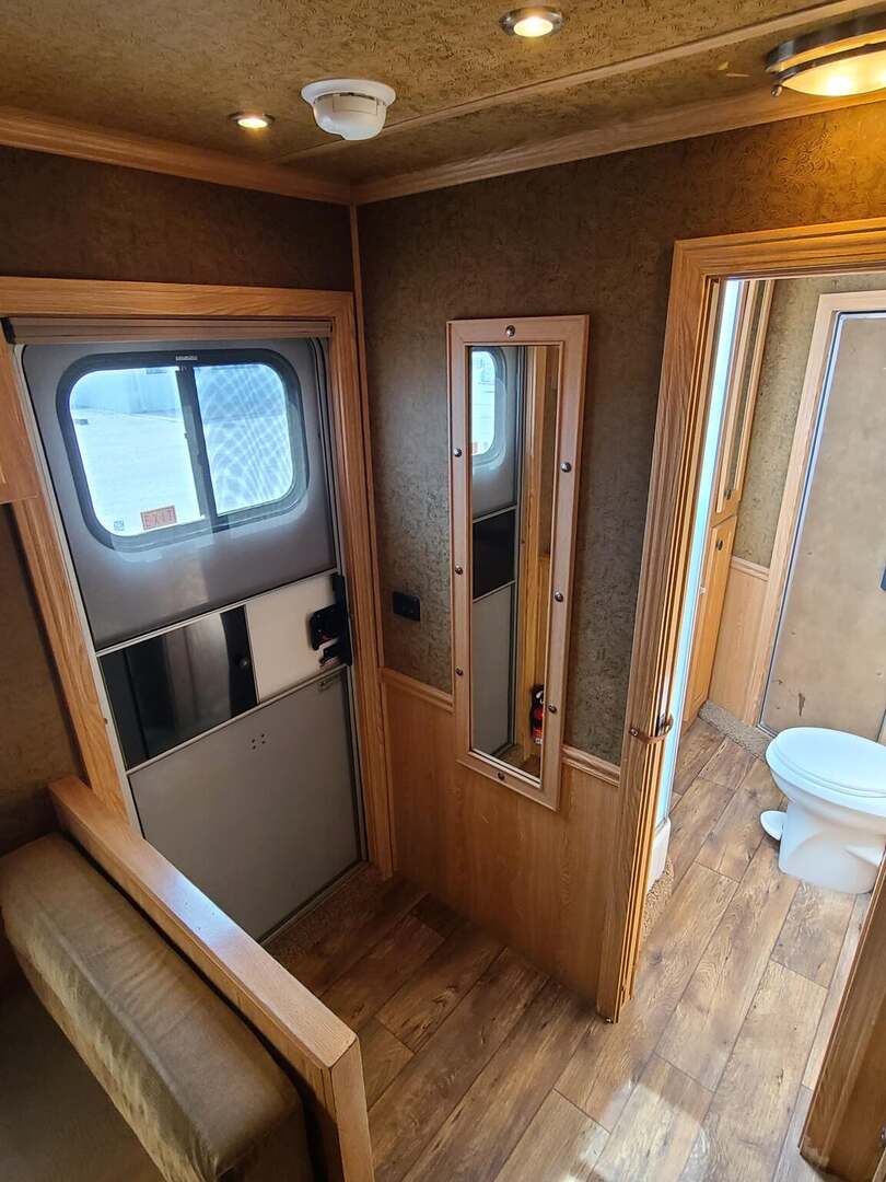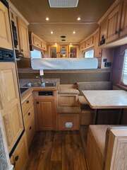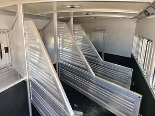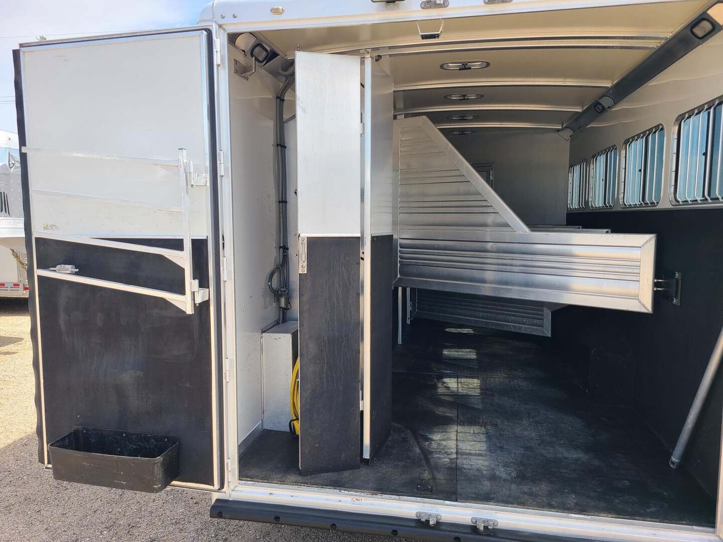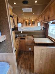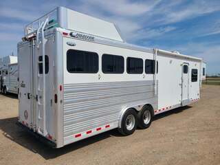 2012 Cimarron 4 horse 12’ LQ 8 x 29 x 7’6” tall 8000# axles with 17.5” tires & wheels Onan 4.0 generator with 1798 hours 72” Dinette across from full kitchen Bunk beds behind kitchen area Full bathroom with shower and toilet 13,500 BTU A/C with heat strip 16000 BTU propane furnace 6 gallon water heater 6.0 propane / electric refrigerator TV in bed area AM/FM/CD player Walk-through door to horse compartment 3 Mangers, escape door on first stall Stud divider on first horse Collapsible rear tack 6’ hay rack Single leg hydraulic jack