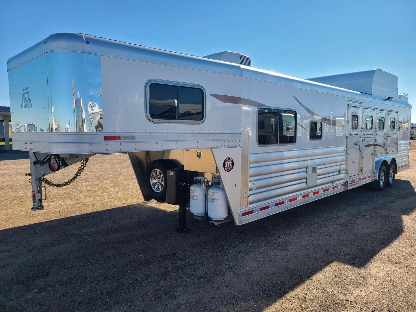 THIS TRAILER IS ON ORDER AND WILL ARRIVE IN AUGUST Platinum Coach 4 horse with 12’ 8” Short wall Outlaw Conversions Select Series SIDE LOAD Outlaw Features: 12’ 8” short wall Dark Knotty Alder raised panel cabinetry Onan 4.0 MicroQuiet generator Hyrdaulic jack 15,000 BTU A/C ducted 20,000 BTU furnace Electric power awning...NICE!!! 6 gallon hot water heater with Propane and 120vAC heat 60 gallon water tank AM/FM/CD/DVD player with 2 interior and 2 exterior speakers 32” LED flat screen on arm 72” sofa sleeper with leather acccent Corner bench with storage below Almond sinks in kitchen and bath 6.0 refrigerator Microwave oven Two burner cooktop Extra wide pocket door to bathroom 32” radius shower with skylight in clear glass Porcelain toilet with foot flush Platinum Coach features: 8 wide x 32’ long x 7’6” tall Full width rear tack, side load 3 mangers with escape door at head Drop down window bars on head side Drop down windows on curb side 6’ hay pod 24” walk through door Baby panel on first divider 2” Blocked axles for additional ground clearance 4 outside halogen load lights 4 tier swing out blanket bar 8,000# axles 14 ply Hankook tires on Mag Aluminum wheels