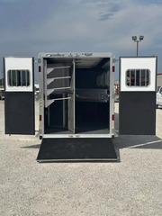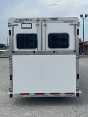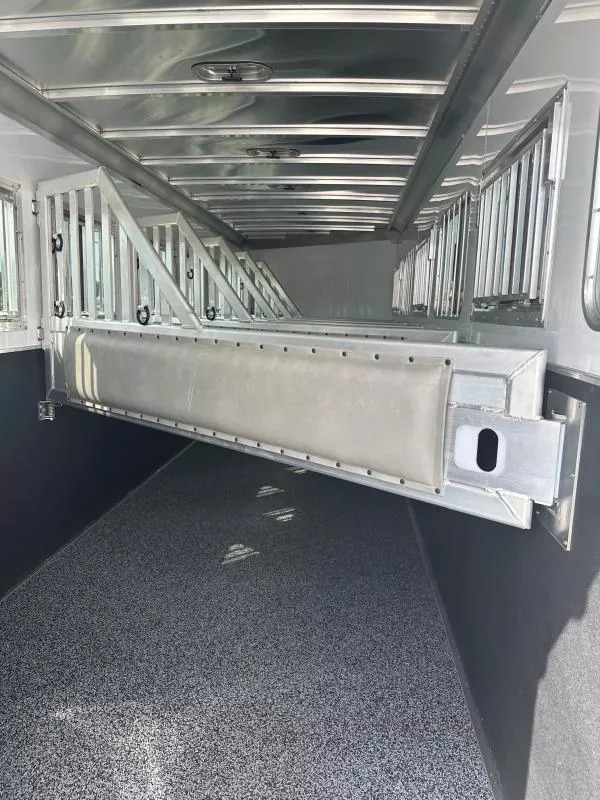 Horse area - EZ Care floor, 48” rubber lined kick pads, lined and insulated to the ceiling, first stall escape door, square drop feed door and drop faceguards on each stall (head), 1st, 3rd and 5th stall drop down windows , 2nd windows with slides and screens (hip), padded air flo dividers, first stall hanging partition, pop up roof vents, interior LED lights, inside tie rings, rear folding/removable tack, halter hooks, rear ramp.