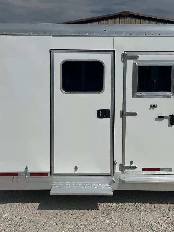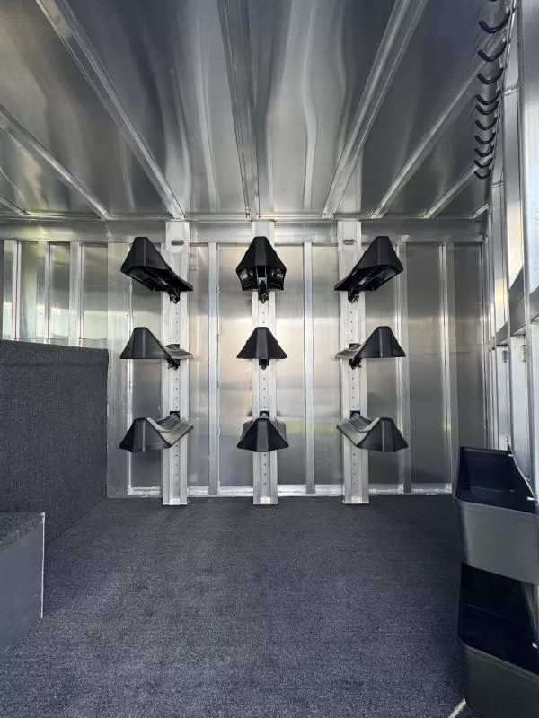 Dressing room - turf on floor, turf on drop wall and in nose, boot box, 5’ long clothes rod, brush box, halter hooks, (3) 3 tier adjustable and interchangeable saddle racks, interior LED lights, camper style entry door, push button lock, screen door, camper door fold down step.