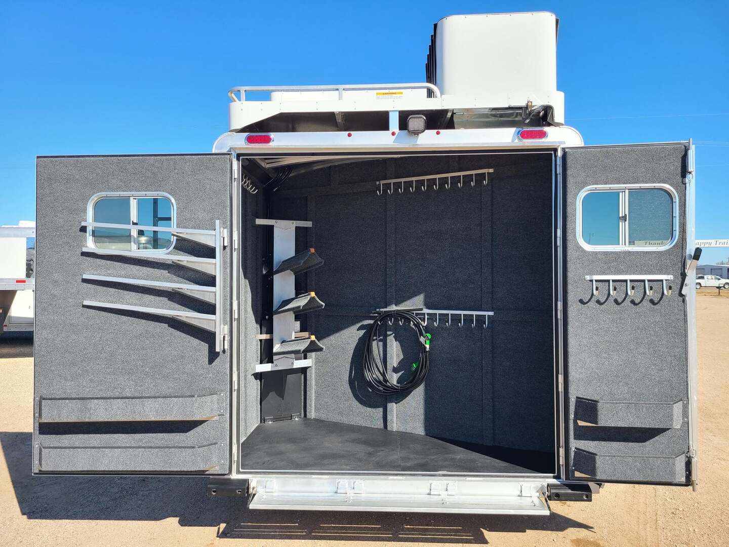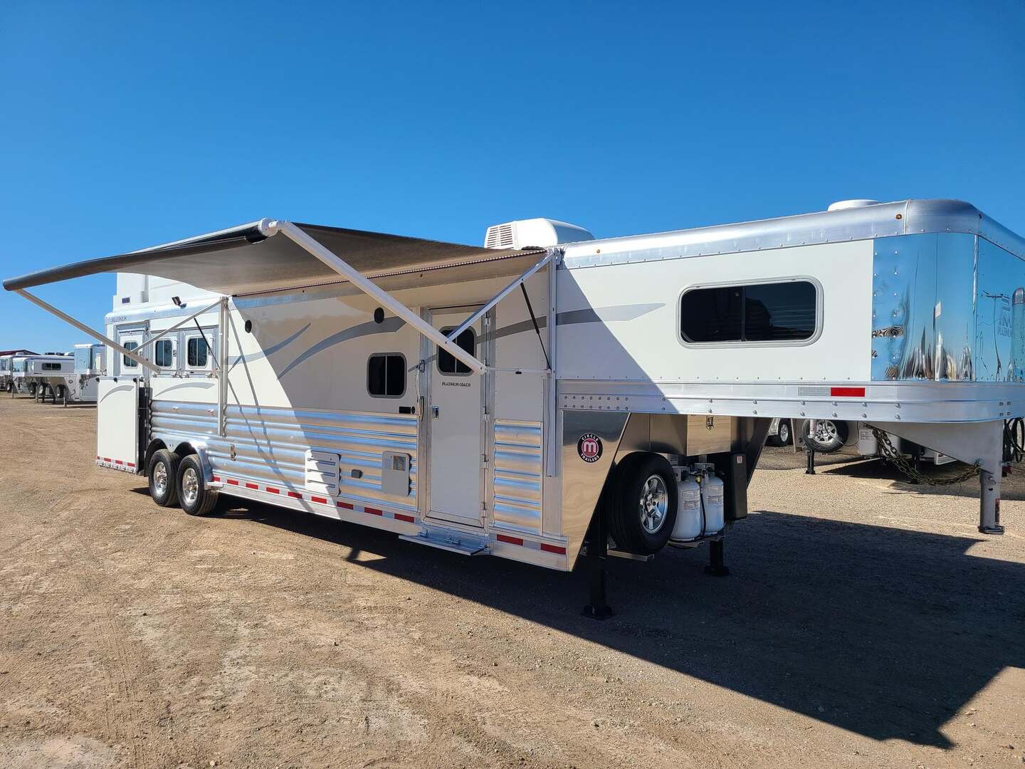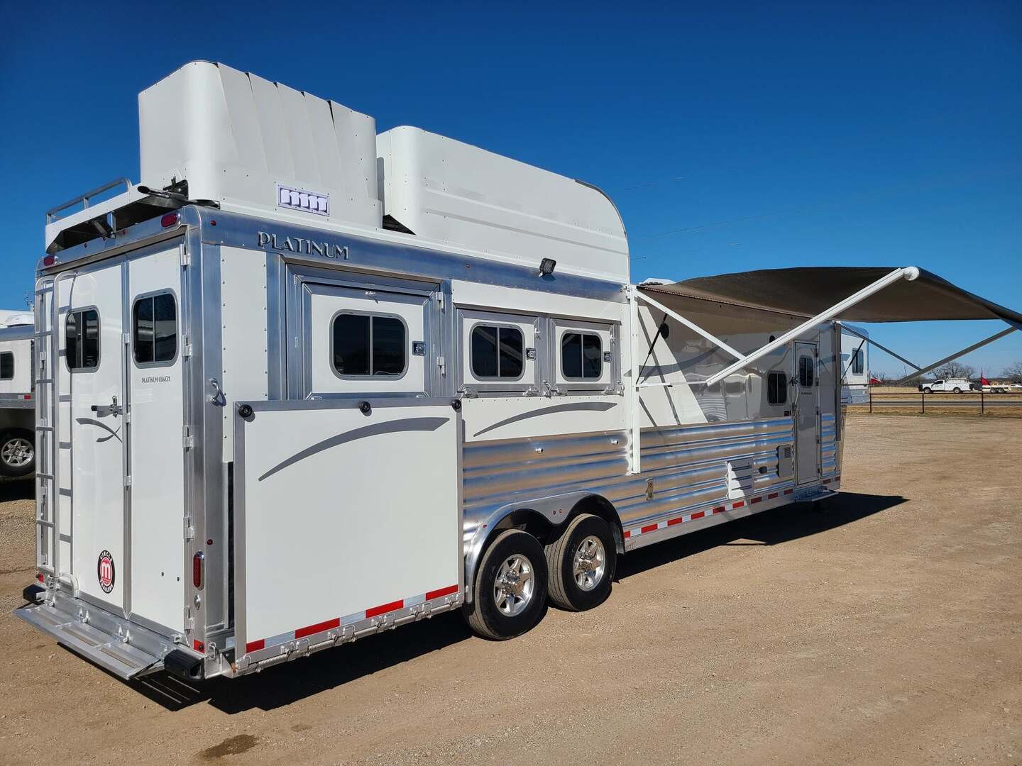 Platinum Coach 3 horse with 14’ Short wall Proline XP by Outlaw Conversions interior SLIDE OUT with 72” Sofa Sleeper and Dinette with SIDE LOAD Platinum Coach features: 8 wide x 30’ long x 7’6” tall 70/30 Rear Doors & SIDE LOAD 2 mangers with escape door at head Drop down window bars on head side Drop down windows on curb side 6’ hay pod & ladder 24” walk through door Baby panel on first divider Flow through and swing back dividers 2” Blocked axles for additional ground clearance 3 outside LED load lights 3 tier saddle rack, surrounded by 30 hooks!! 4 tier swing out blanket bar Flow through style steps 8,000# axles with 14 ply Goodyear tires on Aluminum Wheels Proline XP by Outlaw Conversion Features: 14’ short wall 72” Dinette in 6’ slide out Sofa sleeper at drop wall Enclosed bed for more privacy Dual-Hydraulic Jacks Dark Knotty Alder cabinetry Wardrobe in nose Onan 4.0 MicroQuiet generator on Platform 15,000 BTU A/C with heat strip 20,000 BTU furnace Electric power awning...NICE!!! 6 gallon hot water heater with Propane heat 60 gallon water tank AM/FM/CD/DVD player with 2 interior and 2 exterior speakers 24” LED Smart TV over fridge on door with locking arm 24” LED Smart TV in bed area Almond kitchen sink &  bronze faucet 2 Hardwood hat racks over R/V door 6.0 refrigerator Glass cover 2 Burner cooktop Microwave oven with vent hood Extra wide pocket door to bathroom 32” radius shower w/ bronze glass door & vent overhead Porcelain toilet with foot flush Mirror next to walk through door