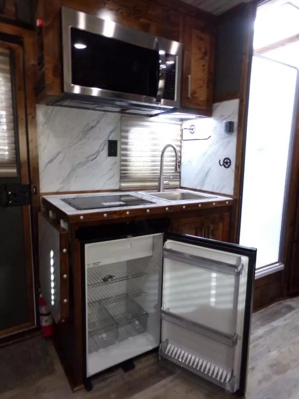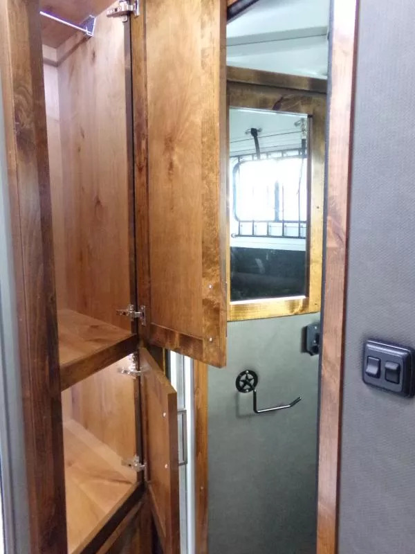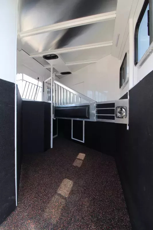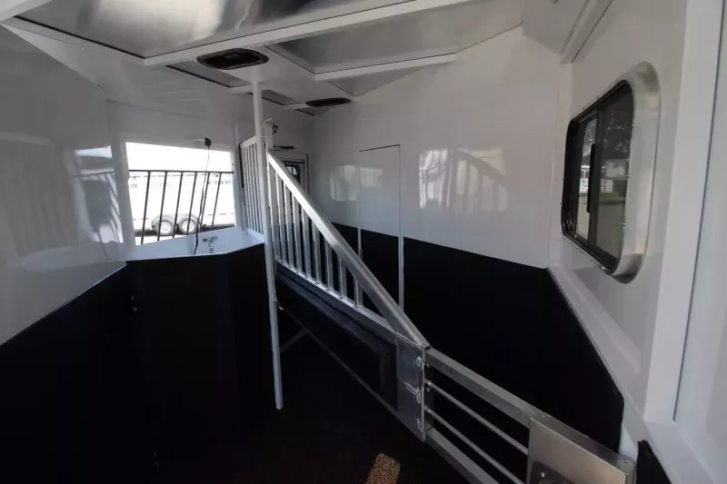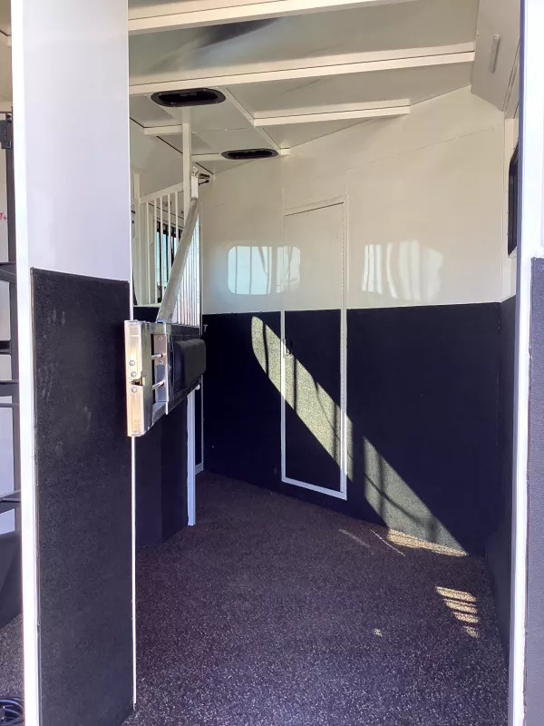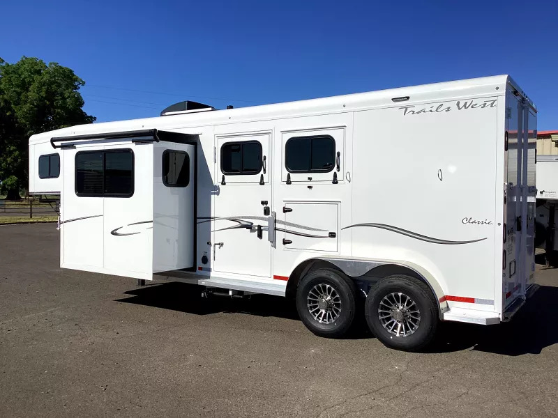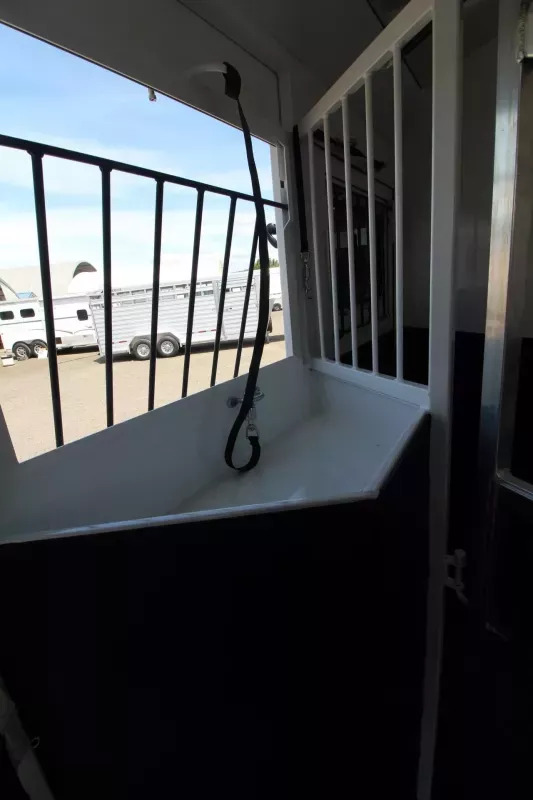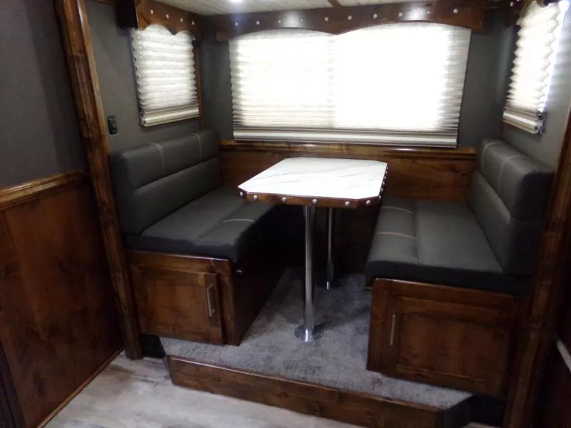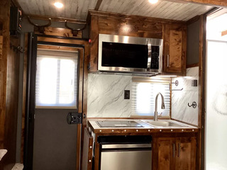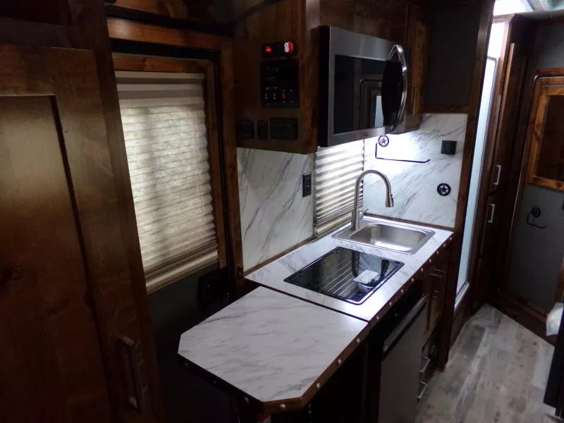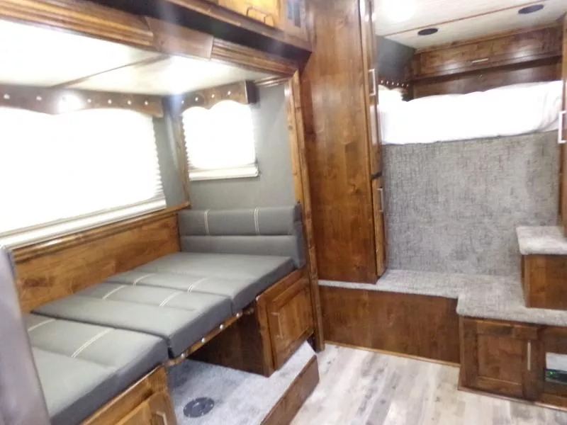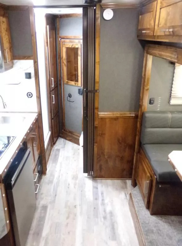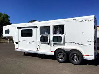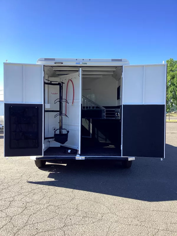 Beautiful Western interior! 8ft Short Wall by 13ft Long Wall of Living Quarter Space. Gooseneck, Slant Load, with Fold-Up Rear Tack Compartment and Fully Enclosed Horse Area. Upgrades: * WESTERN PREMIUM INTERIOR * 320 WATT SOLAR * Slide out with Dinette * Exterior faucet * Glass Shower Door * Exterior Outlet * Pass Through Door * Escape Door * Rollout Door Screen * Shower dome * 2 Exterior Speakers * Convenience Package which includes; Spare tire, Water Tank, Door Mounted Organizer, Sport Bag, and Flood Lights on Each Side and rear. CONSTRUCTION & EXTERIOR: * 24 x 48 Escape Window * 18 x 18 Window * Camper Door with 24” window * 7’0” Wide * 7’6” Tall * 8’ Gooseneck * Retractable Step Under Camper Door * Power Awning * Hoof Grip Flooring in Horse Compartment INTERIOR: * Soft Touch Ceiling * Synthetic Leather Sofa or Cushions * Day/Night Shades w/ Valances * Color coordinated interior * Vinyl floor w/wood print throughout * Hardwood Cabinetry FRESH & WASTE WATER SYSTEMS: * Low point fresh water drains * Demand type water pump * Combination locking water center * 30 gal. fresh water tank * 28 gal. black holding tank * 28 gal. gray holding tank * 6 gal. DSI water heater * Sewer hose storage compartment * Sewer hose and adapter GALLEY: * 2 burner cooktop with range hood * 4 cu ft. Electric refrigerator * Sink * Wood trimmed countertops * Flip up countertop extension * Microwave/Convection Oven HEATING/INSULATION * Dual 5 gal. propane tanks w/ auto changeover * Fully insulated floor, roof and walls * 18,000 BTU furnace (ducted to bathroom) * Air Conditioning SAFETY: * Locking water fill door * Fire extinguisher * CO/Smoke detector * L.P. detector * Alternate emergency exit BATHROOM: * 36 x 40 Shower stall with glass door * 12 volt exhaust fan * Fresh water flush toilet * Wardrobe Closet SLEEPING ACCOMMODATIONS: * Bedspread, pillows & shams * Dinette converts into a bed * Sliding dinette table top ELECTRICAL: * Locking battery box * Monitor Panel * 12 volt outlets * 110 volt outlets * 110V/12V power converter w/charger * 30 service cord * AM/FM stereo with CD player * TV antenna with power booster * Porch light by camper door * Lighted grab handle by exterior door * Recessed LED lighting ** Descriptions Subject to Error** For more information on this trailer please contact Double J Trailers at 541-812-1234. Thank You! Financing available to qualified buyers! All trailer prices are cash prices. Thank you! Trades Welcome Two Lots To Better Serve You! Woodland Washington & Albany Oregon We have over 250 trailers in stock. Please view our entire inventory at [www.double-j.com](http://www.double-j.com/) thank you! *Double J imposes a surcharge of 3% on credit card purchases of amounts greater than $500*