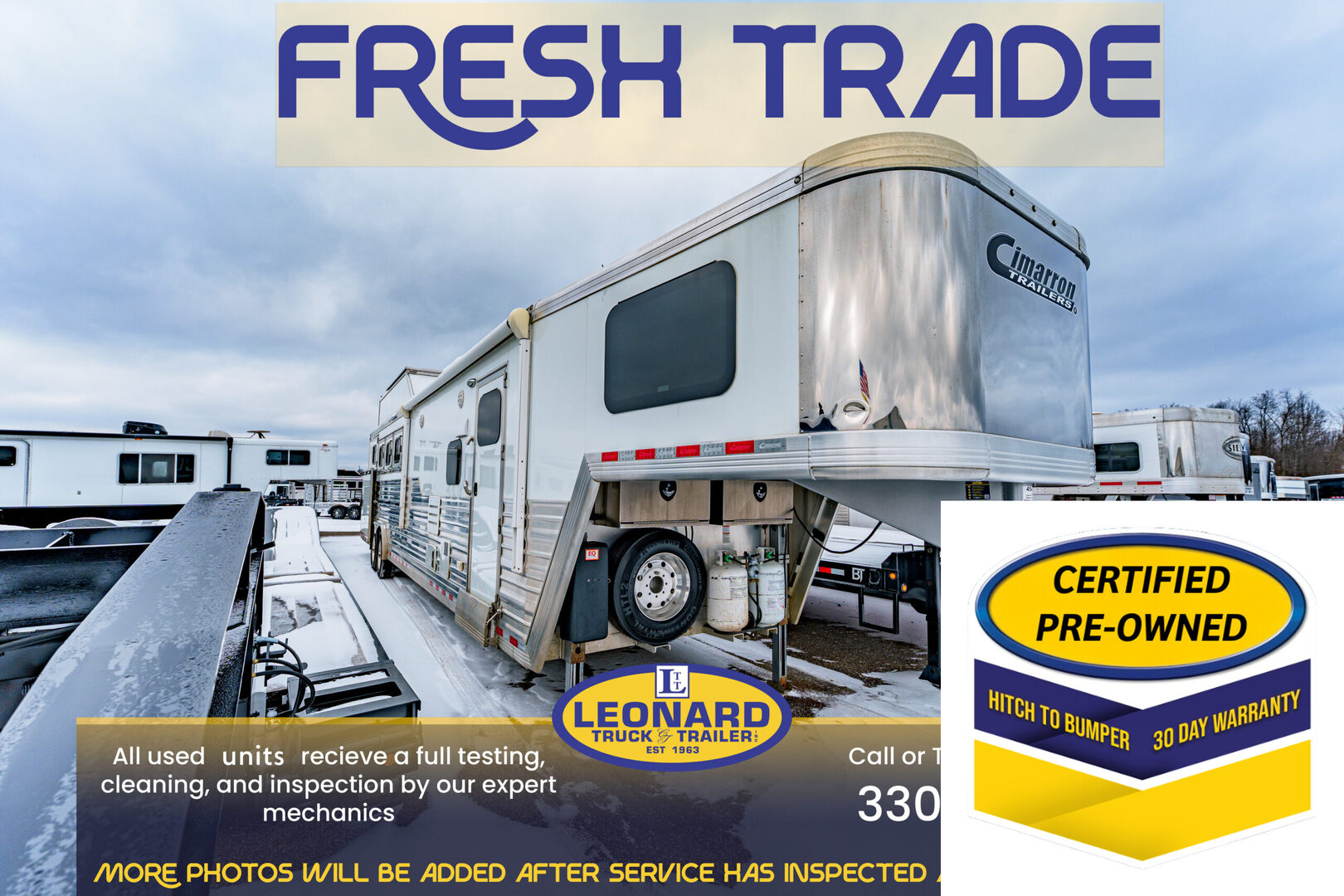 View Inventory: https://leonardtrailers.com/inventory/45499 Stock# 45499 Used 2023 Cimarron 4 Horse Gooseneck Trailer with Living Quarters General Information: Model: NS4HG3380ZMS Exterior: XT SS Construction: Aluminum Primary Color: White Coupler Size: 2 5/16”  Length: 34’ Width: 8’ Height: 7’7” Type: Slant load Living Quarters Size: 15’6” Interior Colors: Brown Living Quarters Options Air conditioning / Furnace (ducted) Heat strip Generator Sofa / Dinette Sink / Stove Refrigerator / Microwave Sink in bath Toilet / Shower Slide-out: Yes Slide Type: Hydraulic Horse Area Options Mats / Pads Vents / Lights Mangers Rubber Lining: Complete Escape Type: 1 Full Walk Out Tack Area Type: Rear collapsible Doors / Gates Double rear doors Ramp behind gate Axles / Weight / Running Gear GVW: 18,000 lbs Axle Size: 9,000 lbs Tire Size: 17.5 Number of Brakes: 4 Spare Tire Jacks: Dual Jack Type: Hydraulic Nose Type: Tapered Empty Weight: 9,650 lbs Brakes: Electric We offer outstanding financing options, accept trades, and can arrange nationwide NO HASSLE delivery! Inquire today for more information! (888) 333-6613 **We believe these specifications to be accurate. Any discrepancies are unintentional. Please verify information with a sales associate prior to purchase.** Stock Number:45499